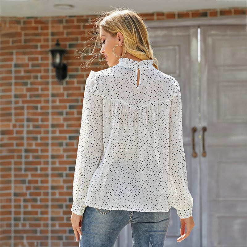 Anna-Kaci Women's Long Sleeve Polka Dot Blouse with High Smocked Neckline and Flowing Relaxed Fit