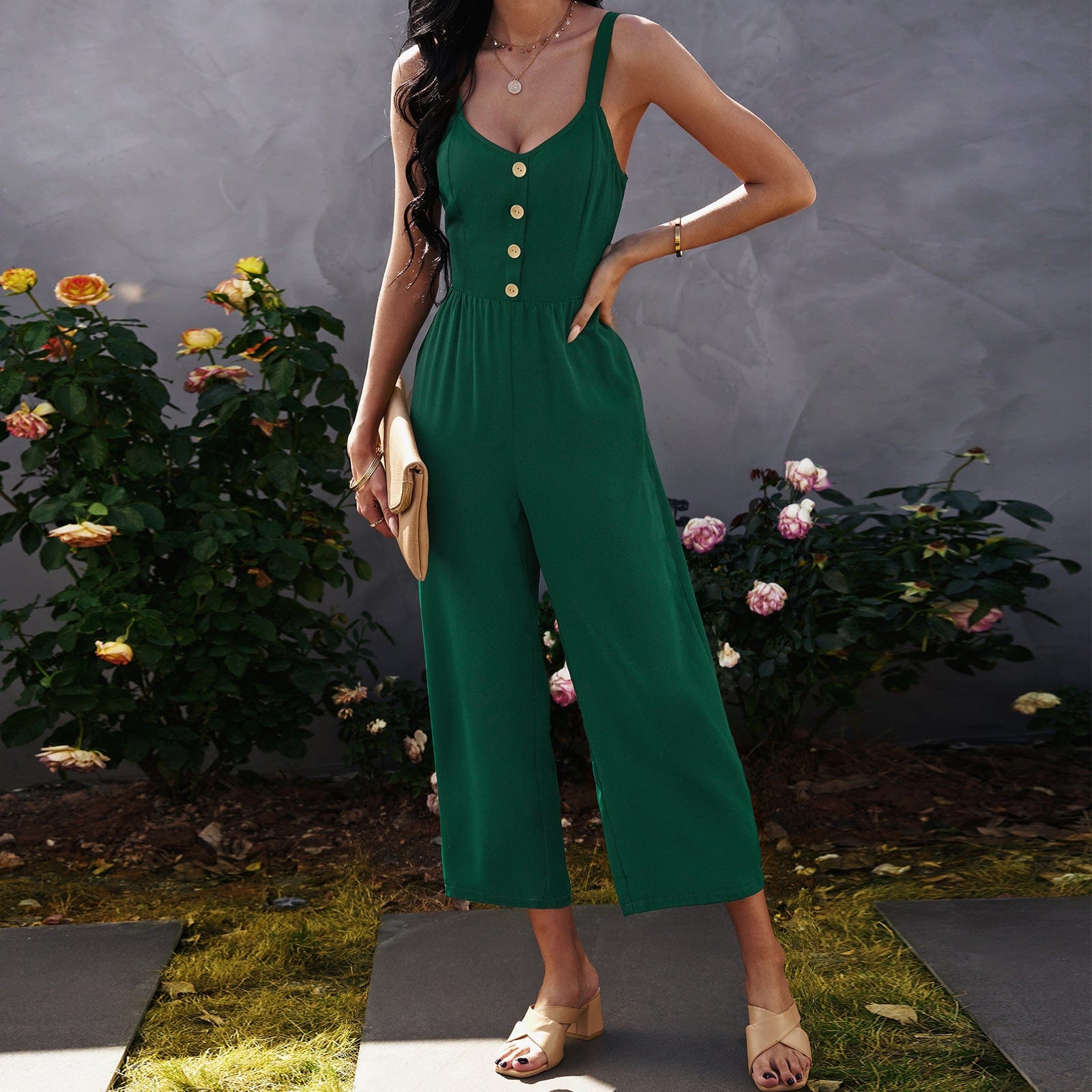 The Anna-Kaci jumpsuit is detailed with a sexy tie back design. Features a v neck line, solid color, thick straps, contrast button front design, culottes length, and regular fit. Pair it with criss cross sandals and accessories for a beautiful look.