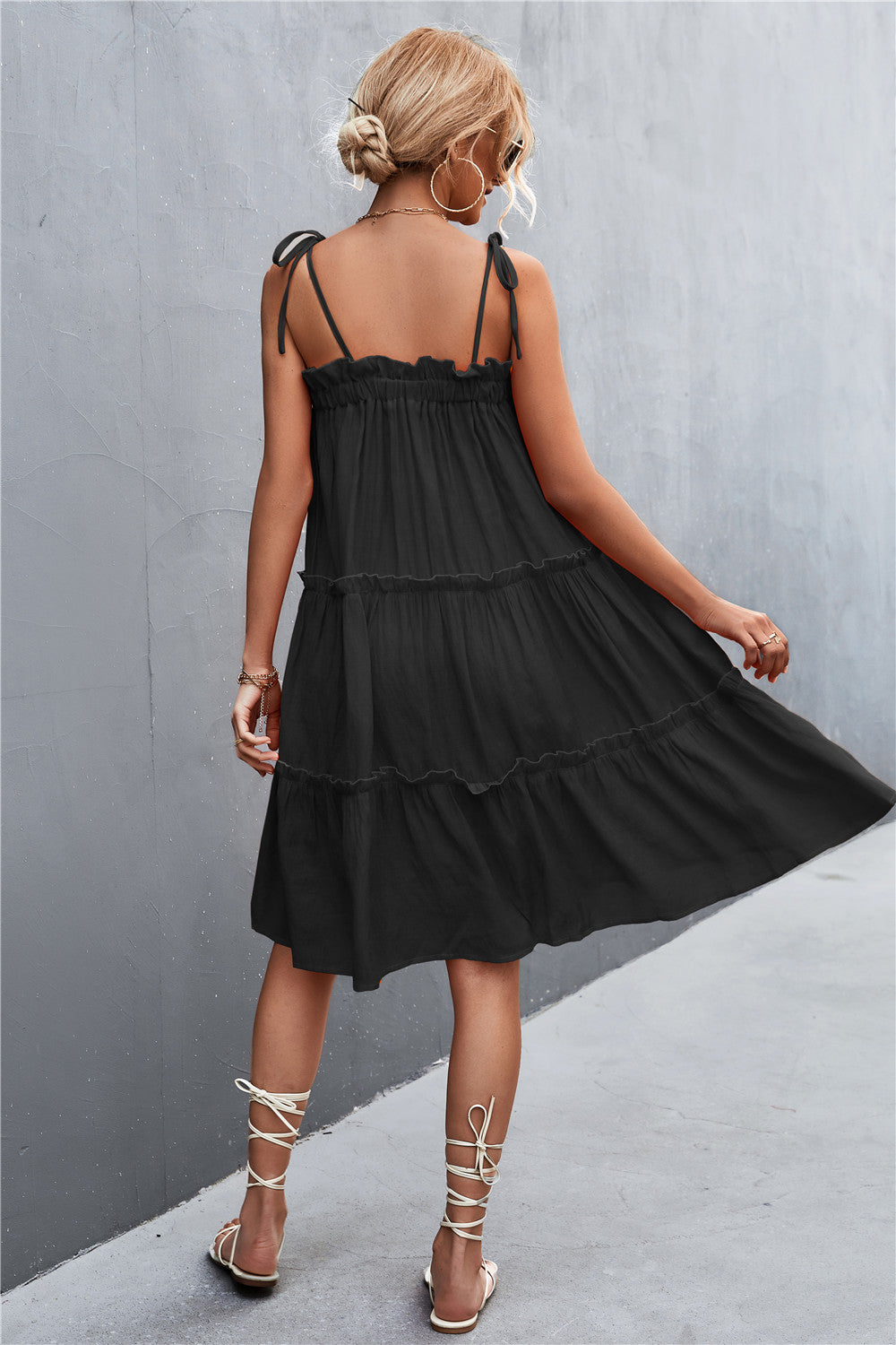 The Anna-Kaci dress is detailed with a beautiful tie-shoulder design. Features solid color, straight neckline, shift dress silhouette, ruffle-tiered design, and knee-length. Pair it with dainty jewelry and block heels for a fantastic look.
