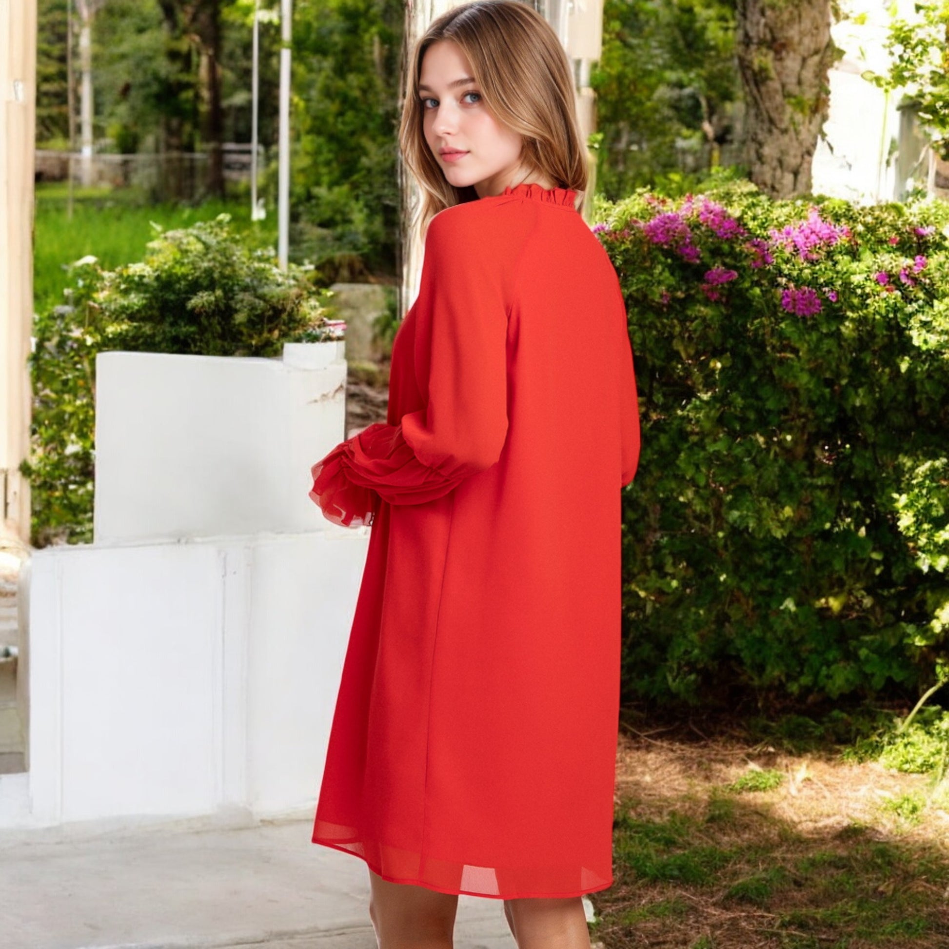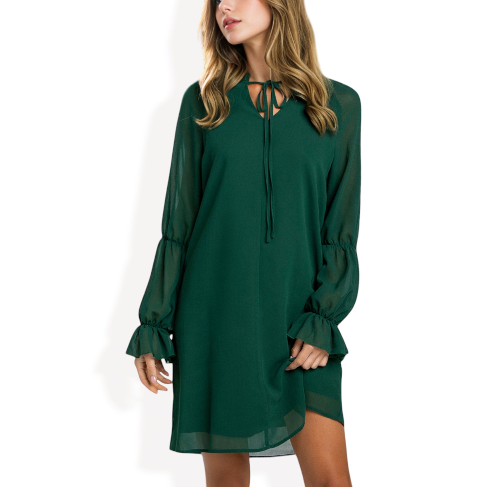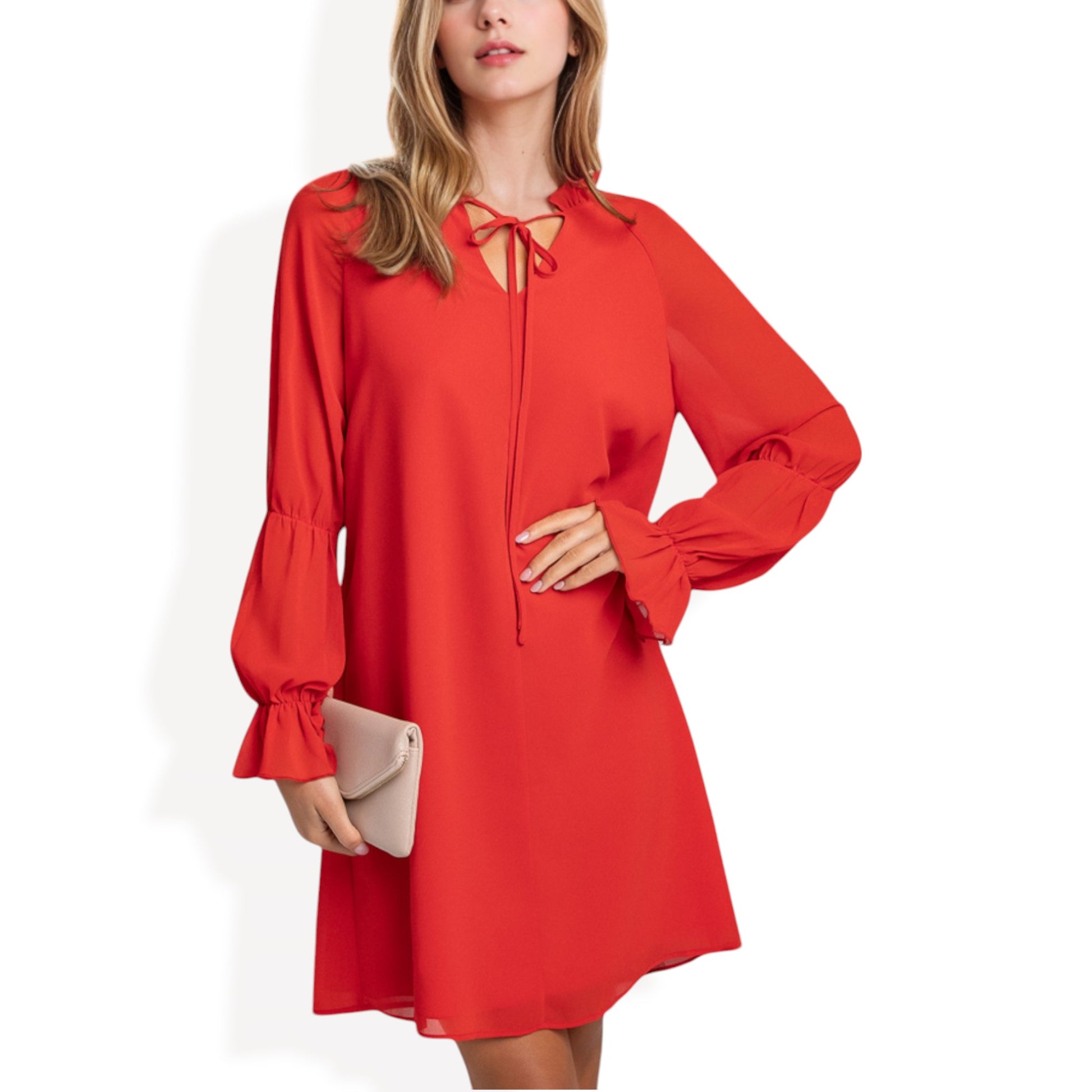 This graceful A-line chiffon dress is designed with airy sheer sleeves and charming tie neck detail for a touch of elegance. The flowy silhouette provides comfort and effortless style, making it ideal for various occasions. With its lightweight fabric, this dress offers a breathable and versatile choice for day-to-night wear. Pair it with heels for a polished look or keep it casual with flats for a relaxed outing.