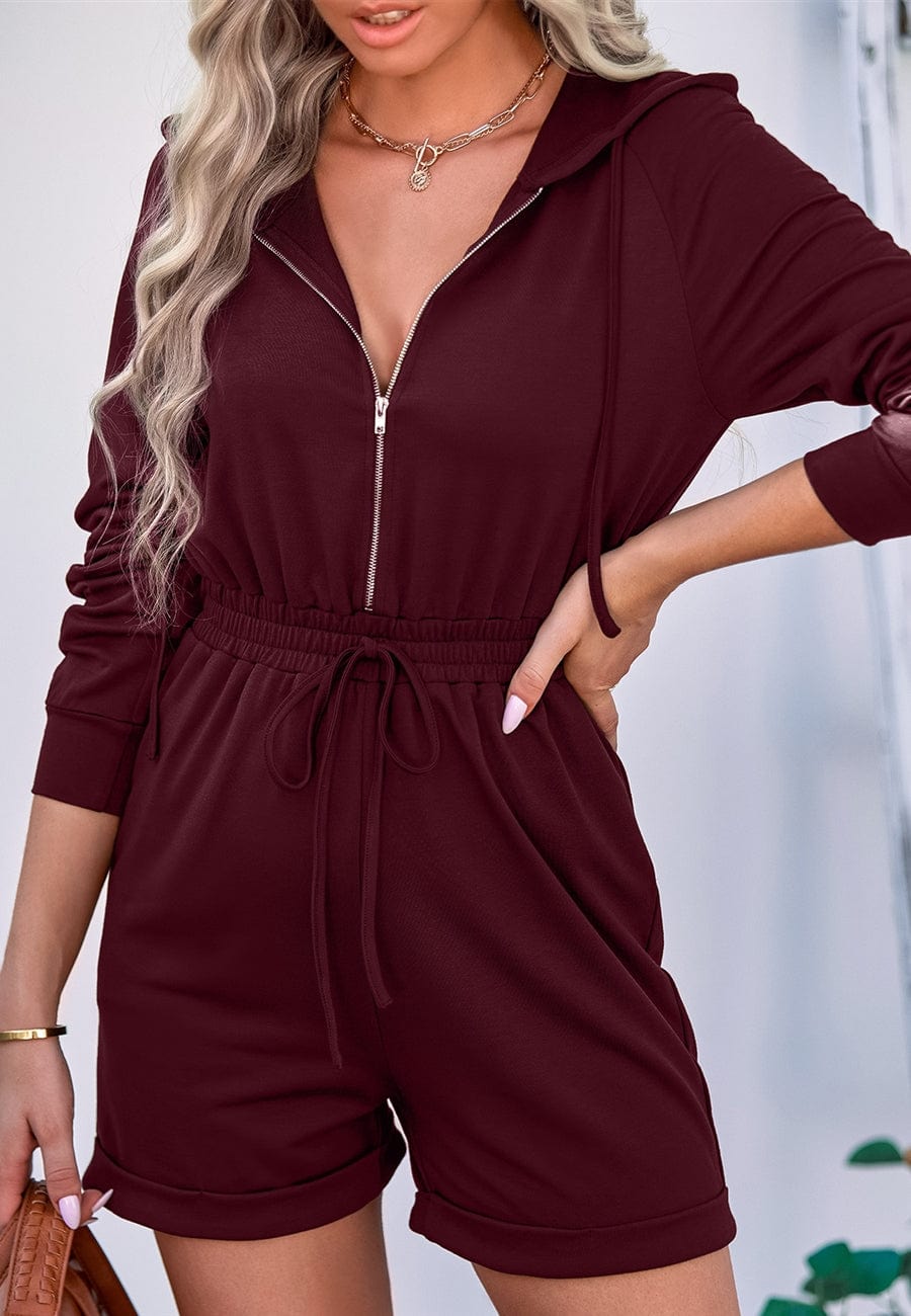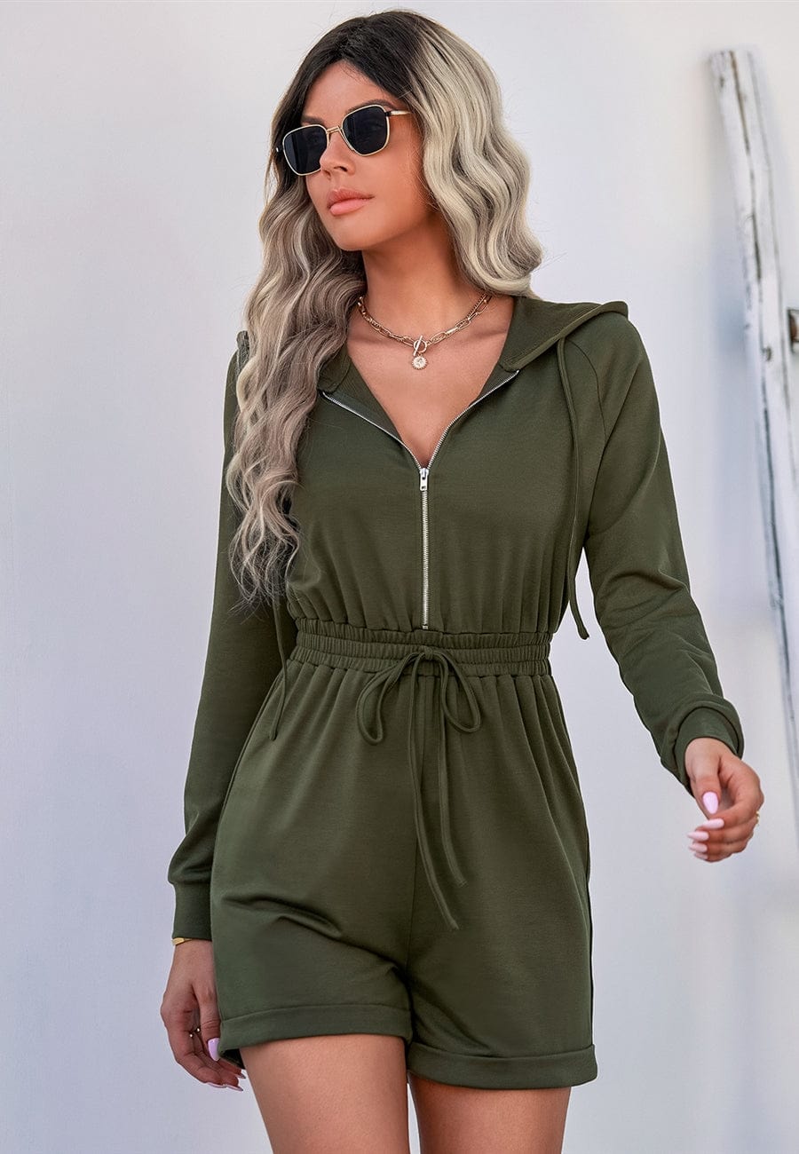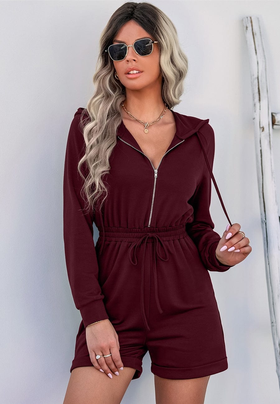 The Anna-Kaci playsuit is detailed with a useful hood. Features a solid color, zip-up design, long sleeves, drawstring waist, and regular fit. Pair it with sneakers and a long socks for an athletic look.