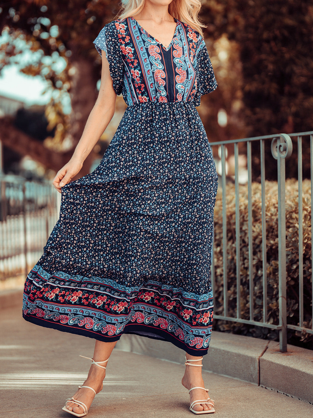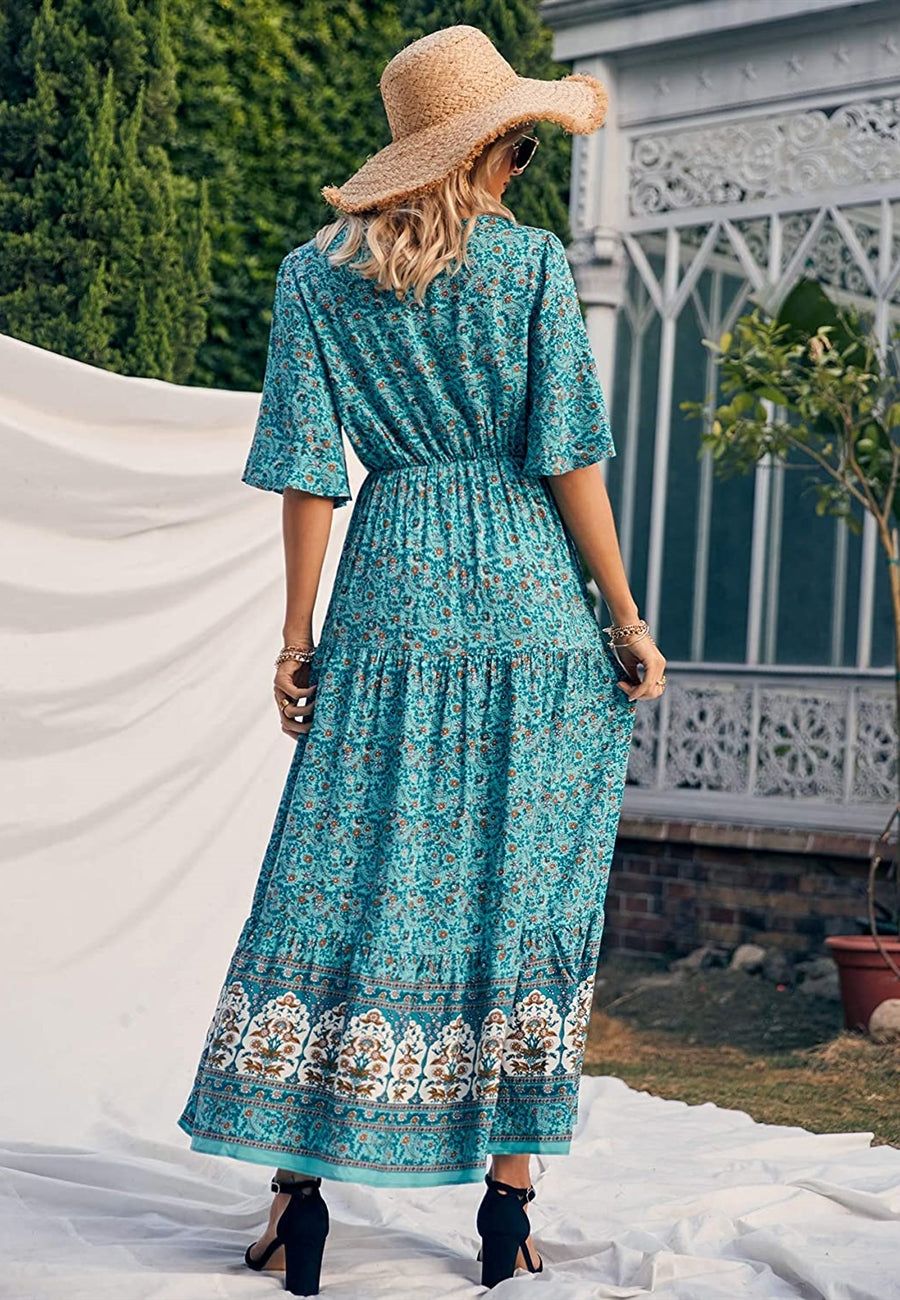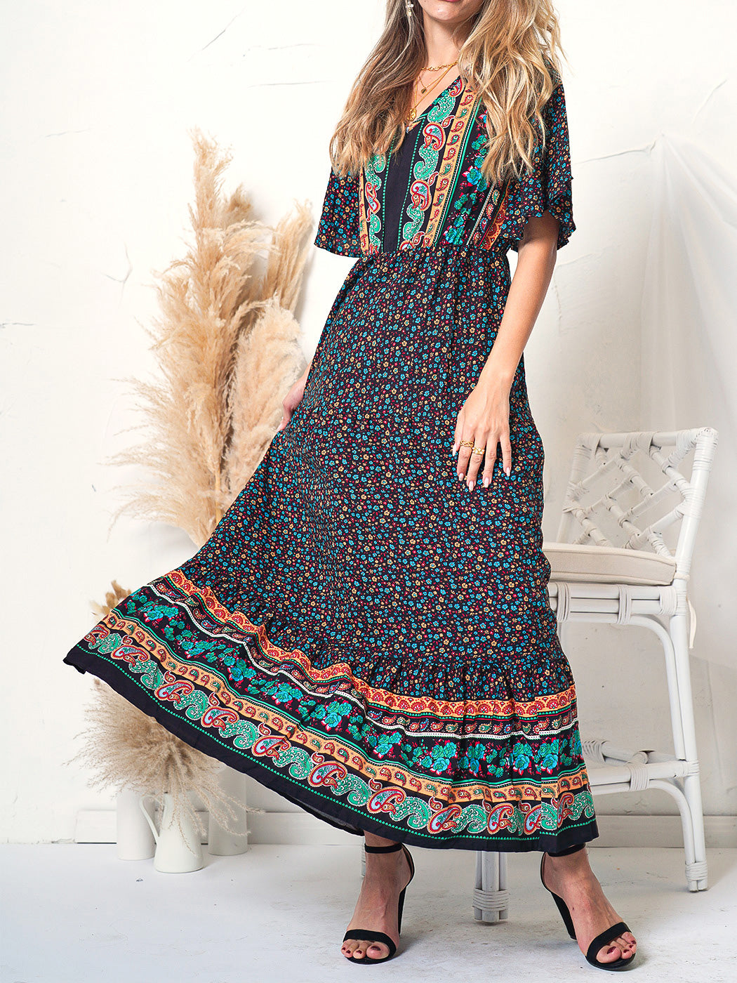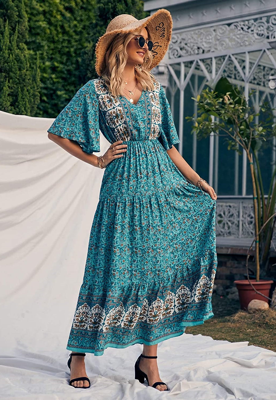The Anna-Kaci maxi dress is detailed with a classic boho multi-print paisley design. Features a v neck line, flutter sleeves, flowy skirt, and above ankle length. Pair it with ankle boots and a straw hat for a truly unique look.