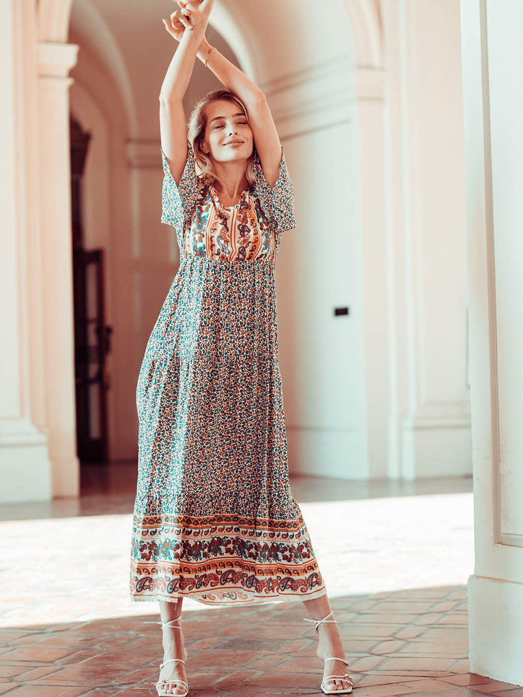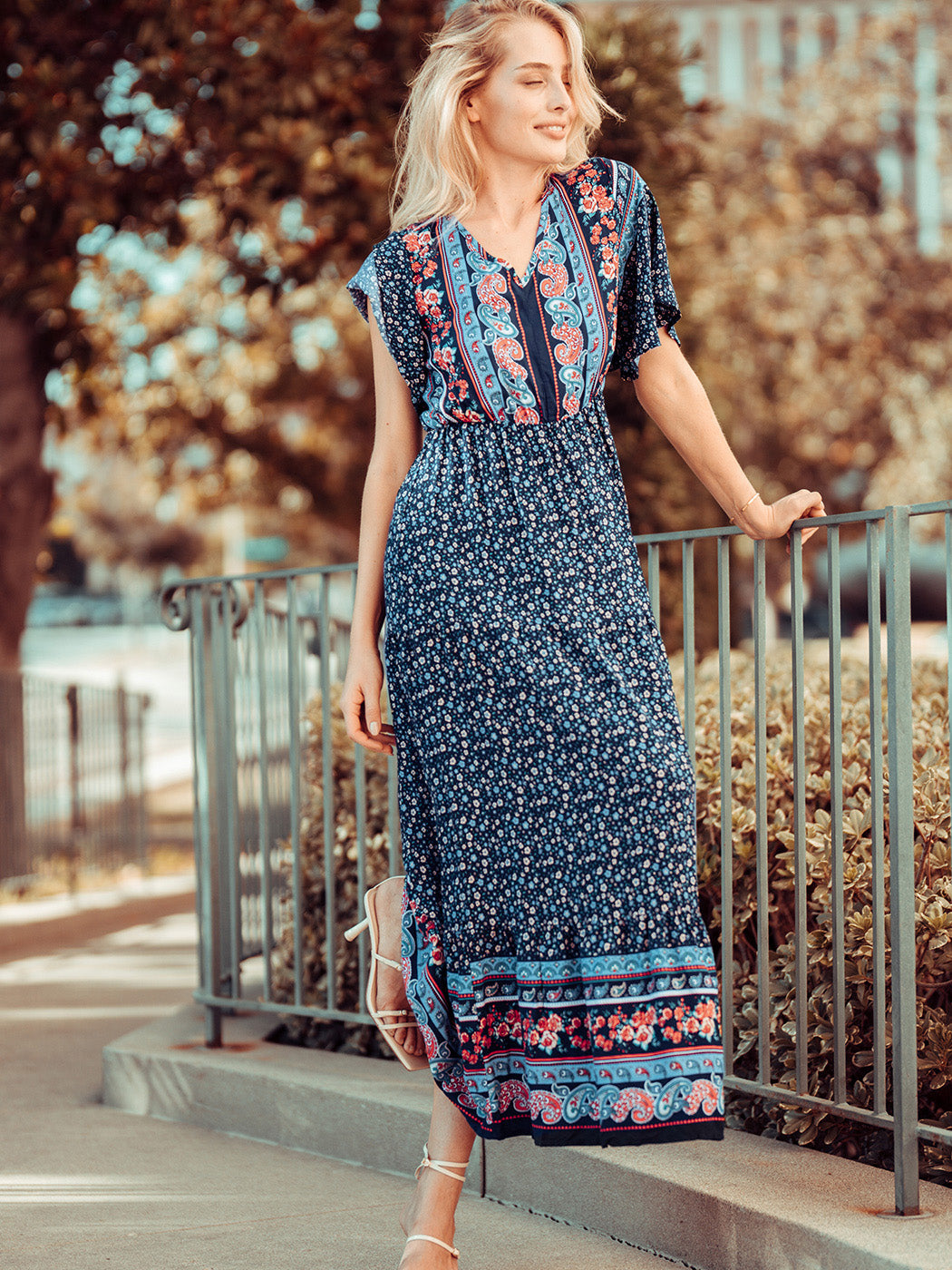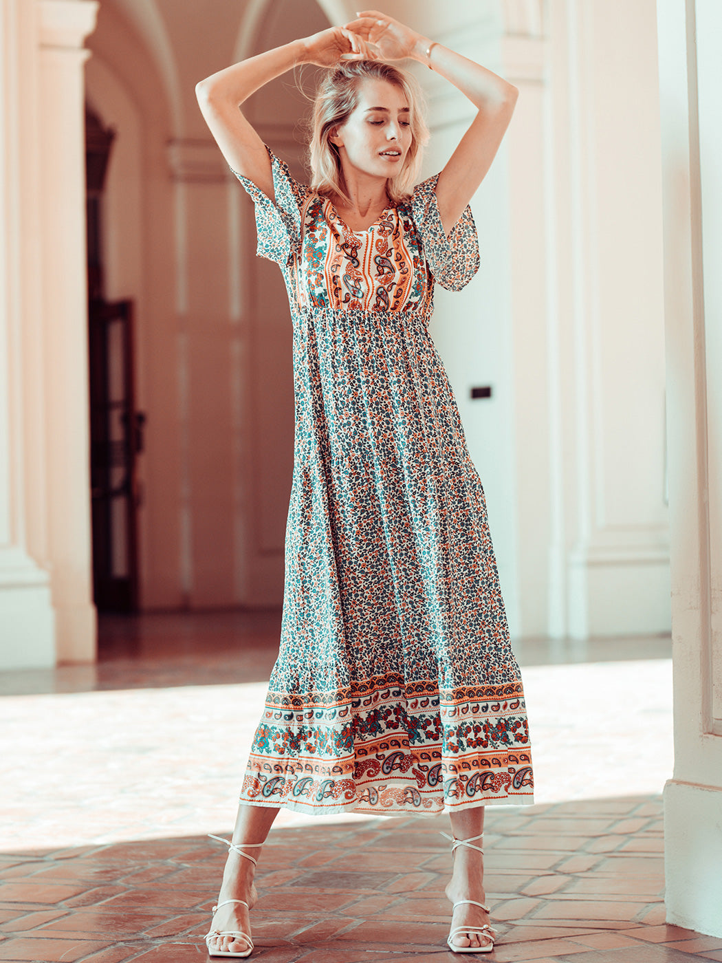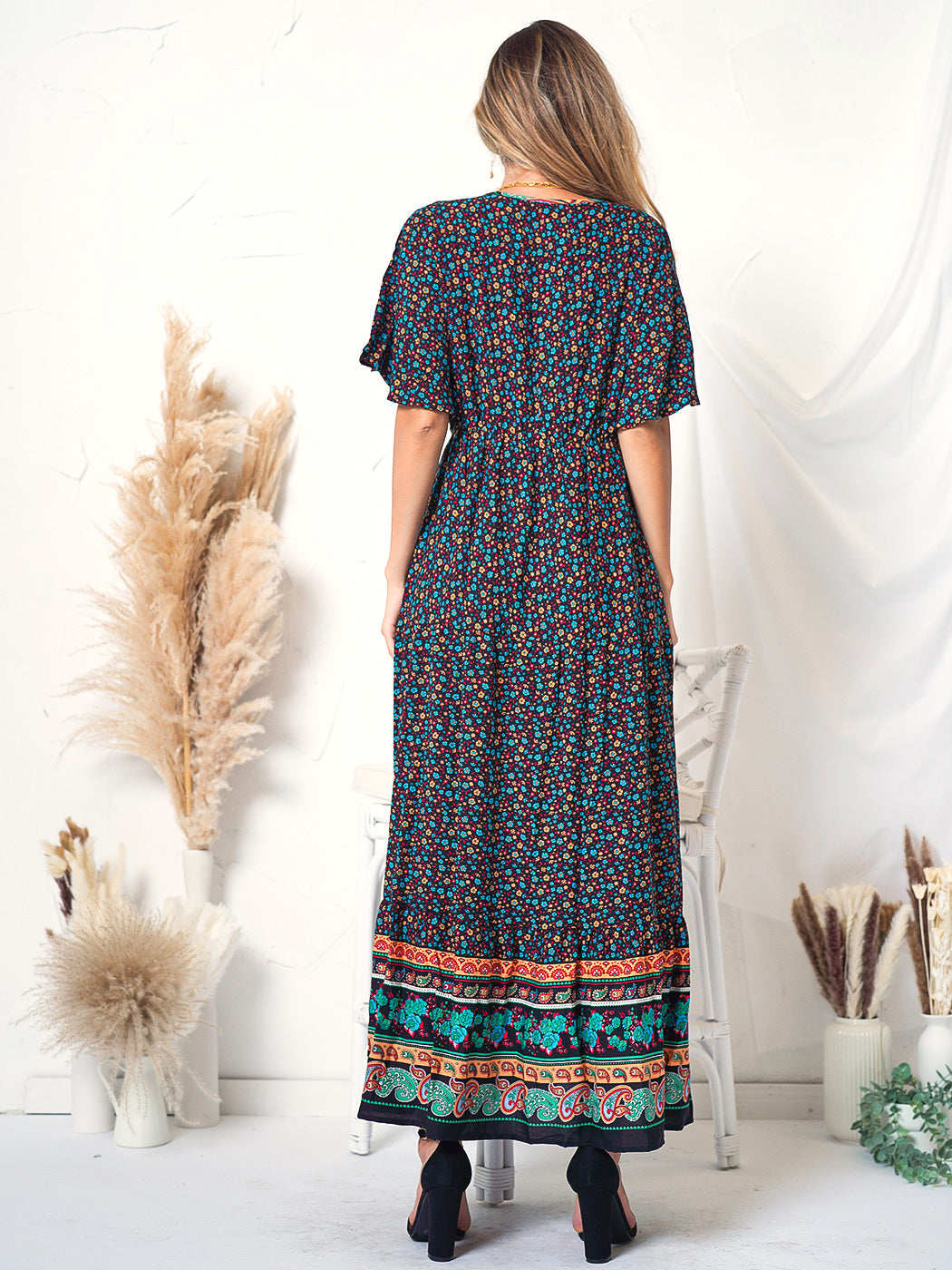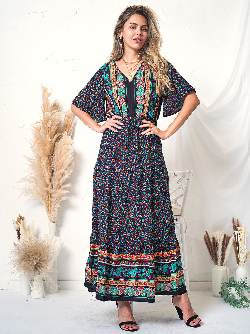 The Anna-Kaci maxi dress is detailed with a classic boho multi-print paisley design. Features a v neck line, flutter sleeves, flowy skirt, and above ankle length. Pair it with ankle boots and a straw hat for a truly unique look.
