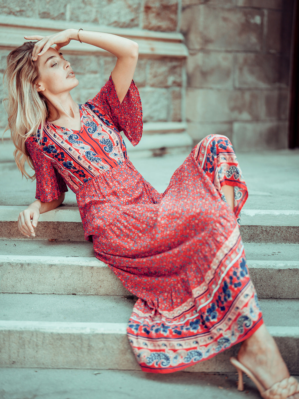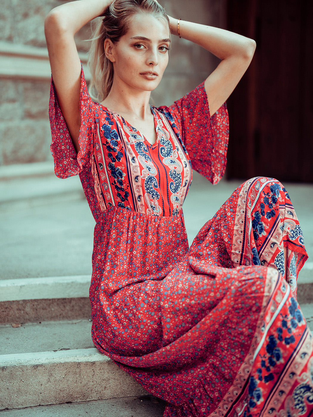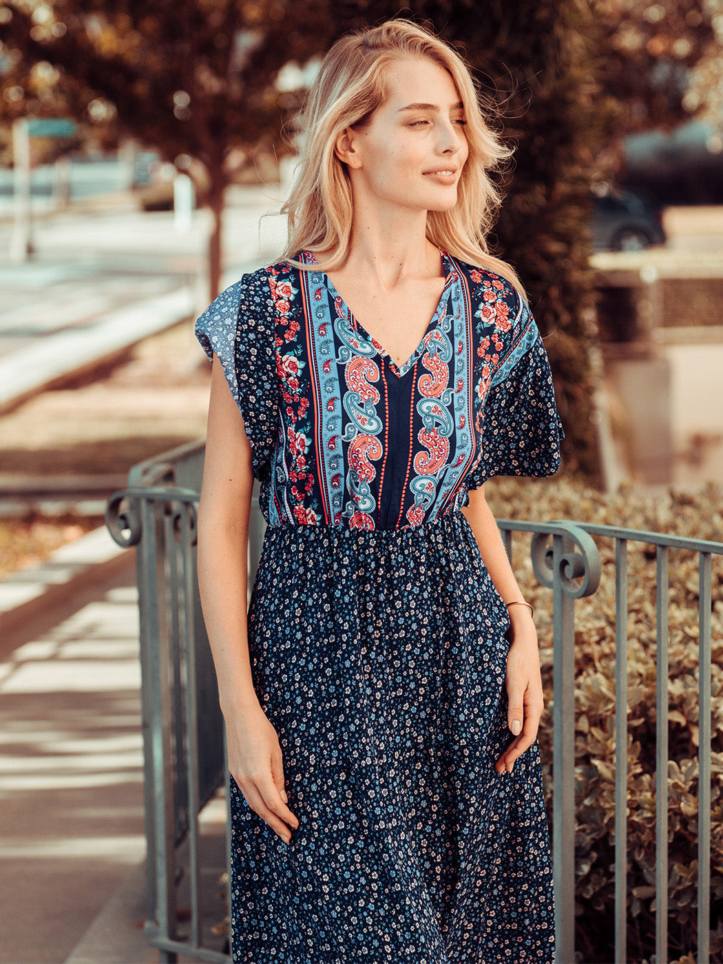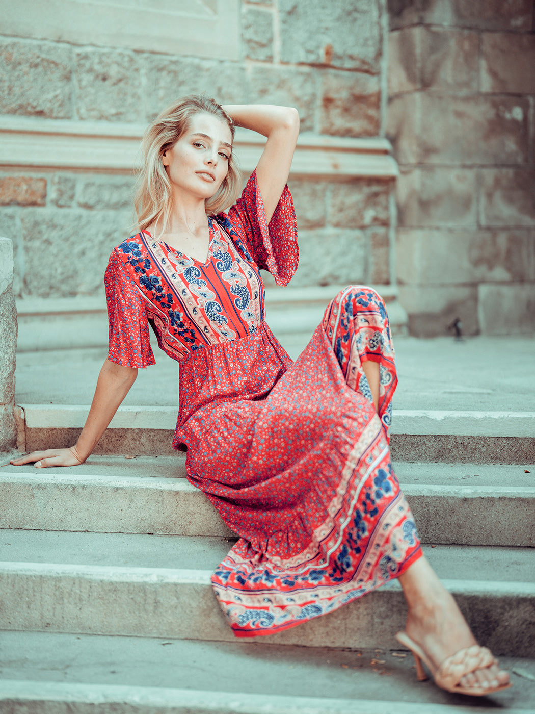 The Anna-Kaci maxi dress is detailed with a classic boho multi-print paisley design. Features a v neck line, flutter sleeves, flowy skirt, and above ankle length. Pair it with ankle boots and a straw hat for a truly unique look.