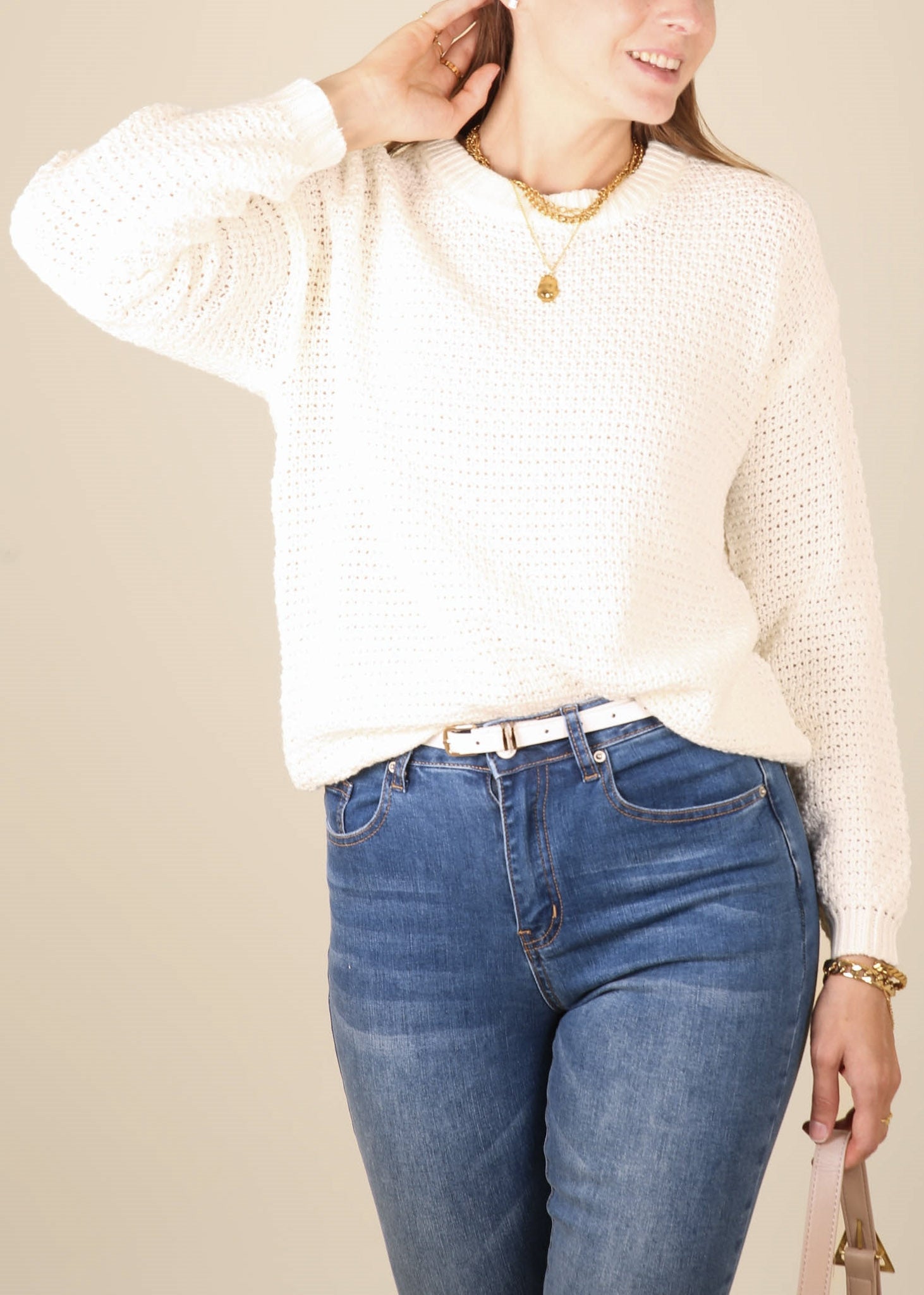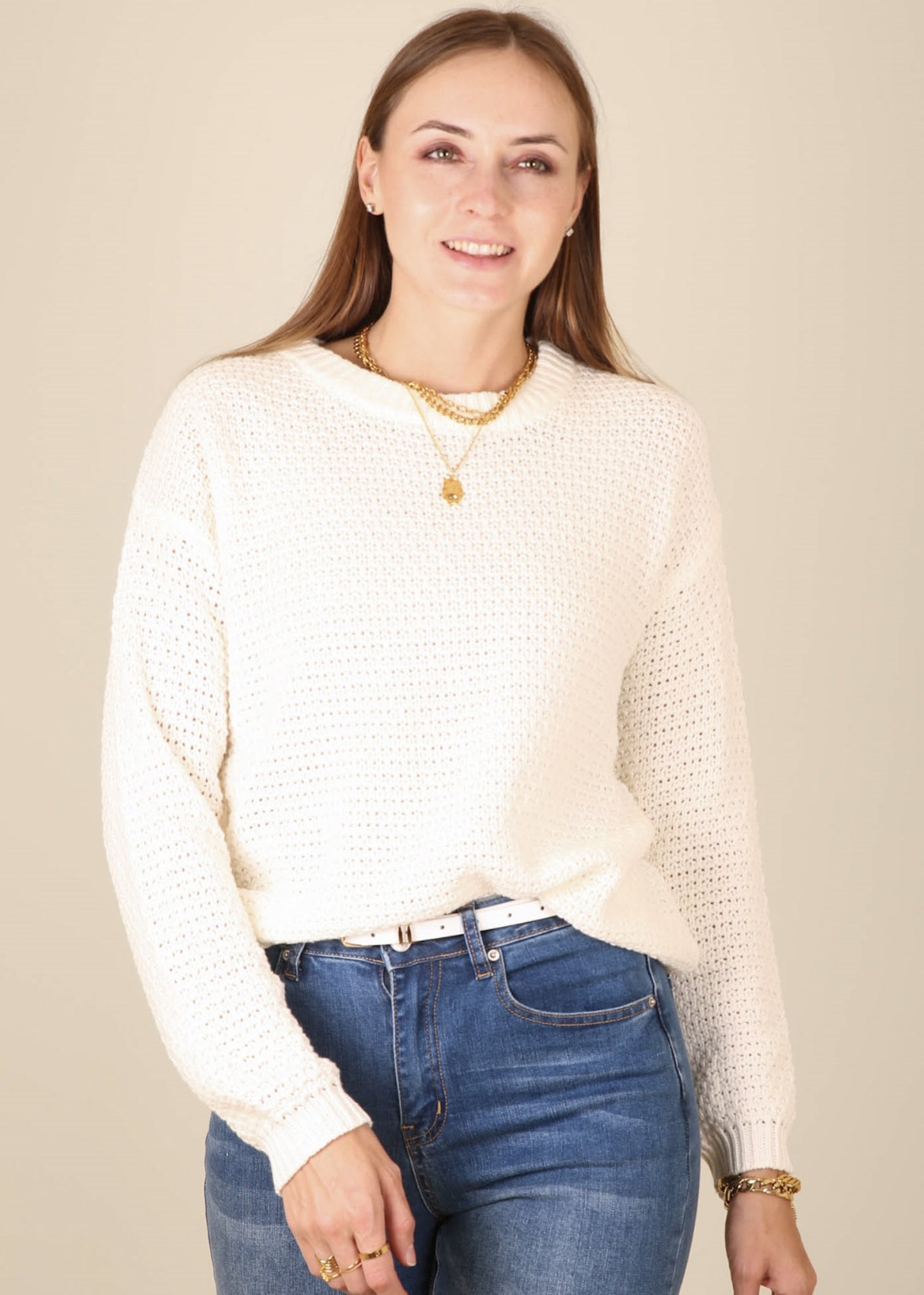 The Anna-Kaci sweater is detailed with a beautiful textured knit material. Features a crew neck line, solid color, drop shoulder, long sleeves, and loose fit. Pair it with trousers and sandals for a cool look.