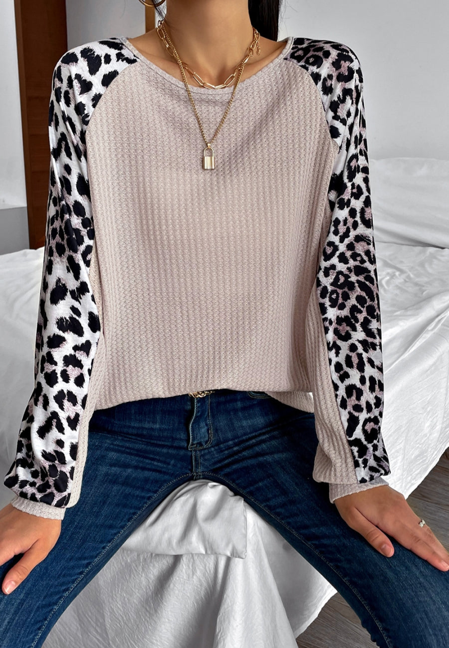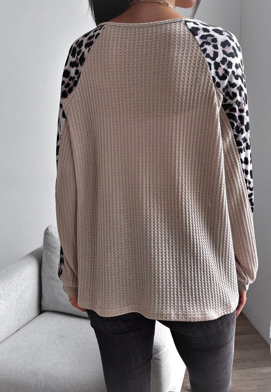 The Anna-Kaci sweater is detailed with a fun waffle knit textured material. Features a round neck line, leopard print color block design, raglan long sleeves, and loose fit. Pair it with straight leg jeans and loafers for a cozy look.