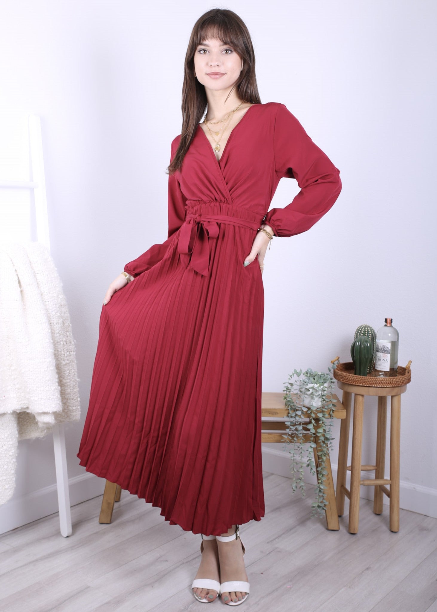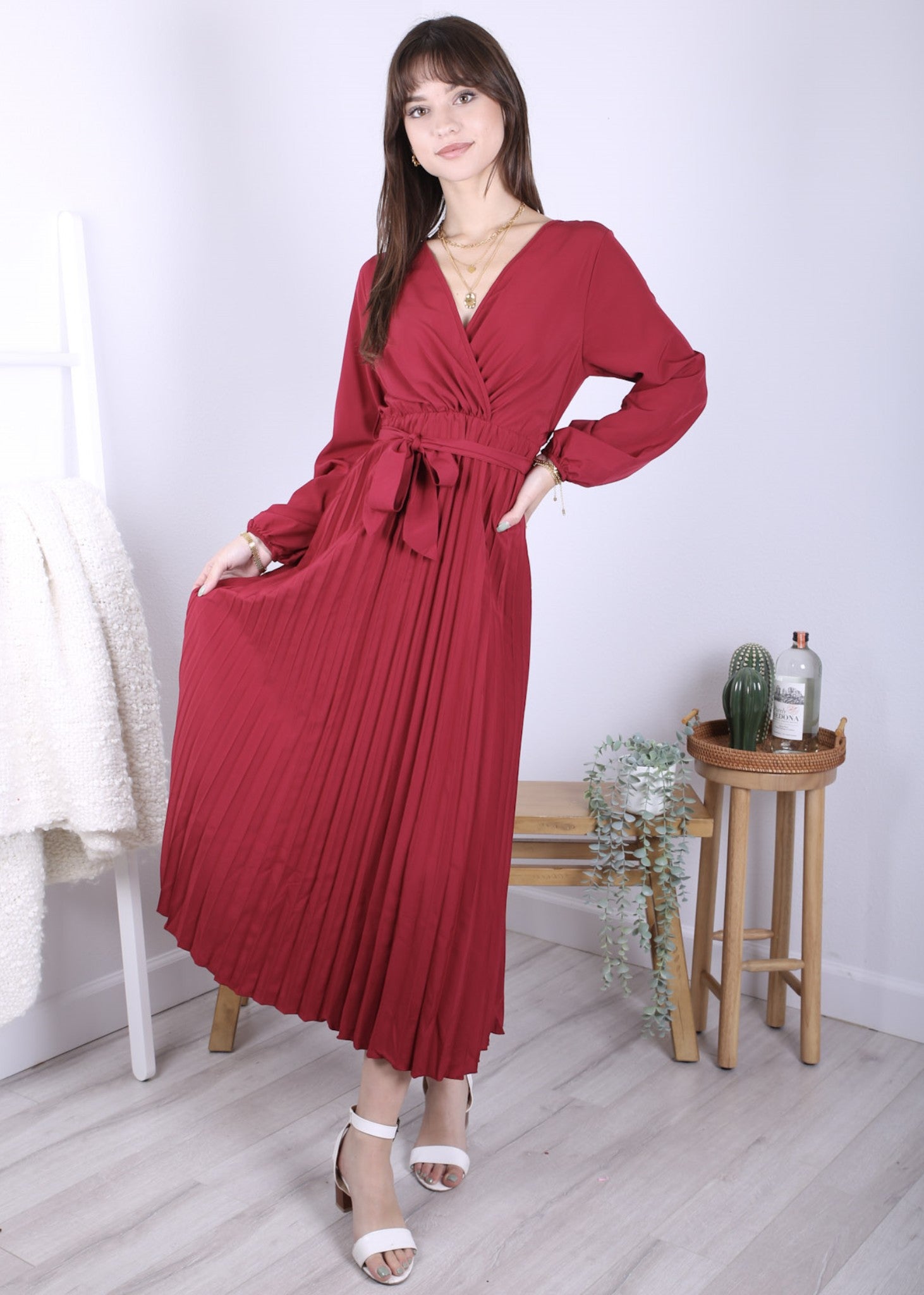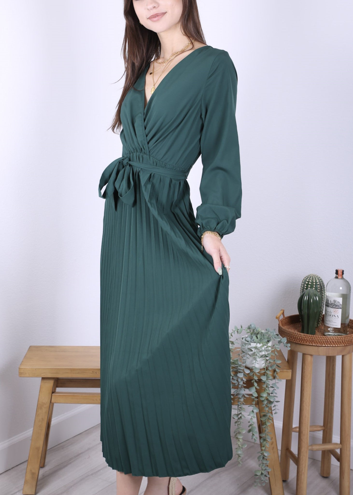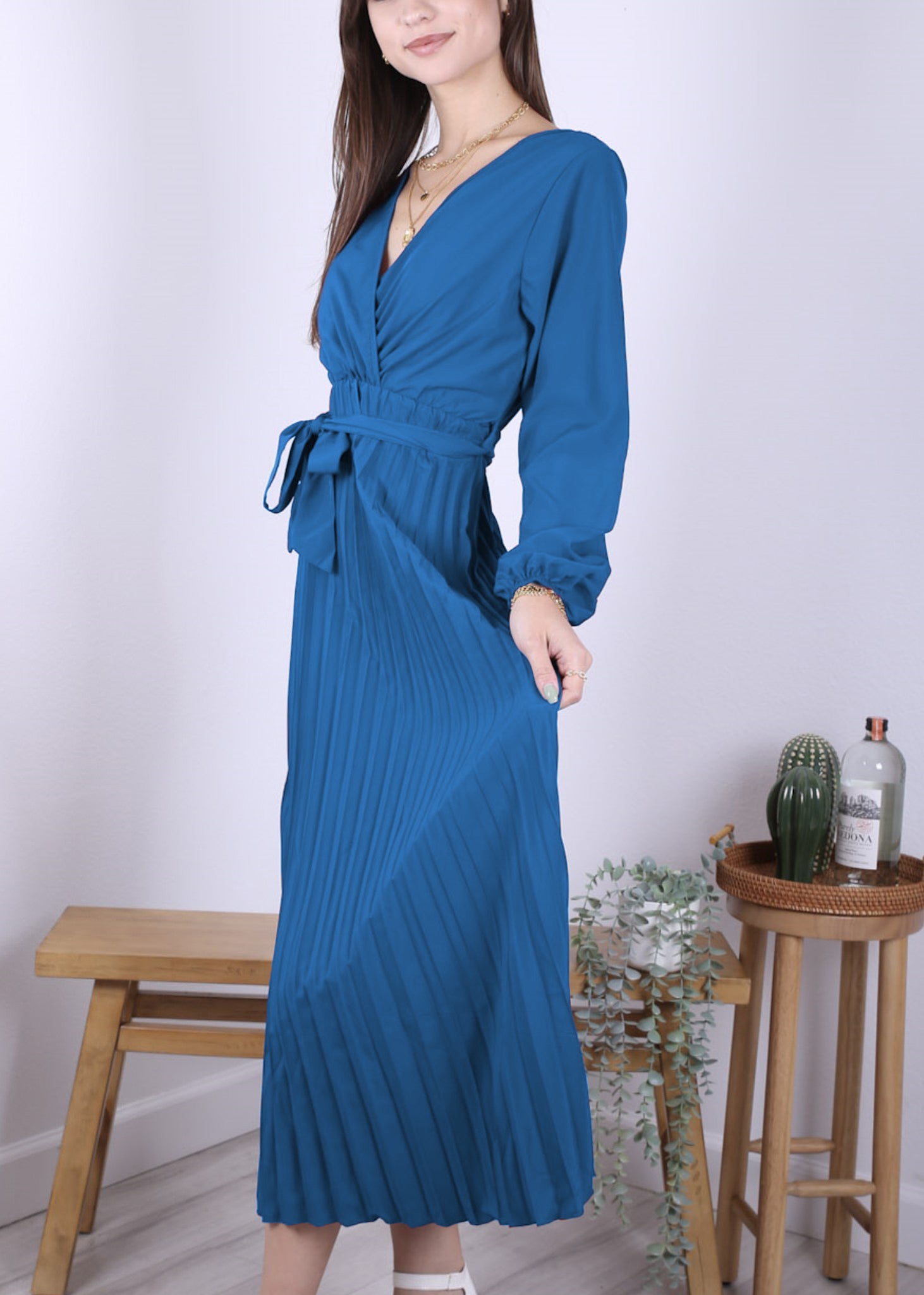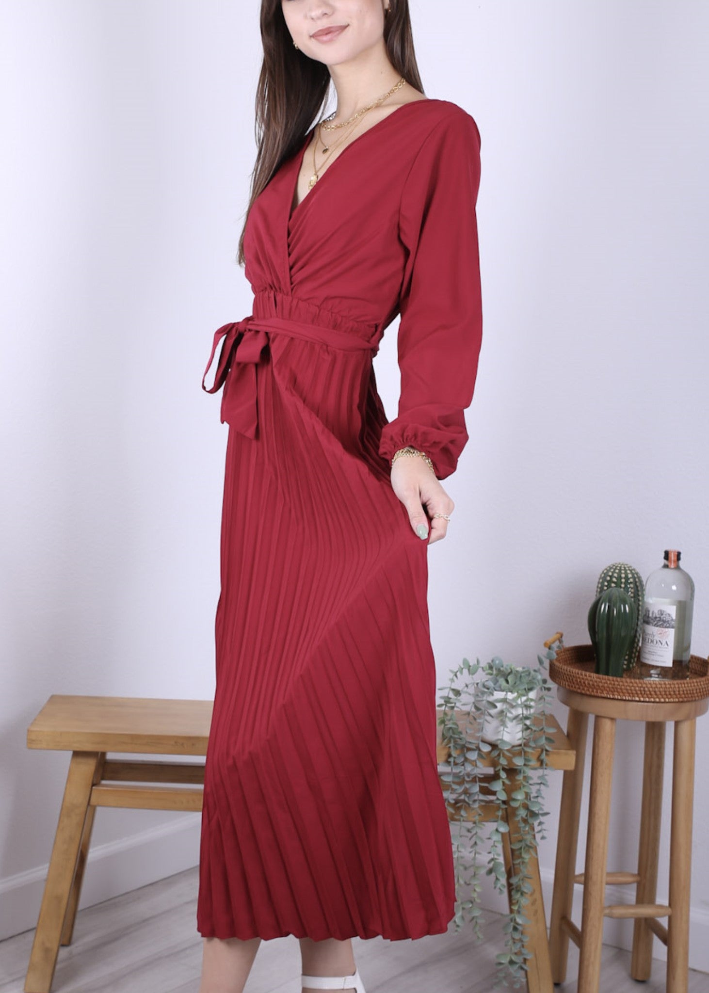 Anna-Kaci Women's Long Sleeve V-Neck Maxi Dress with Pleated Skirt and Waist Tie