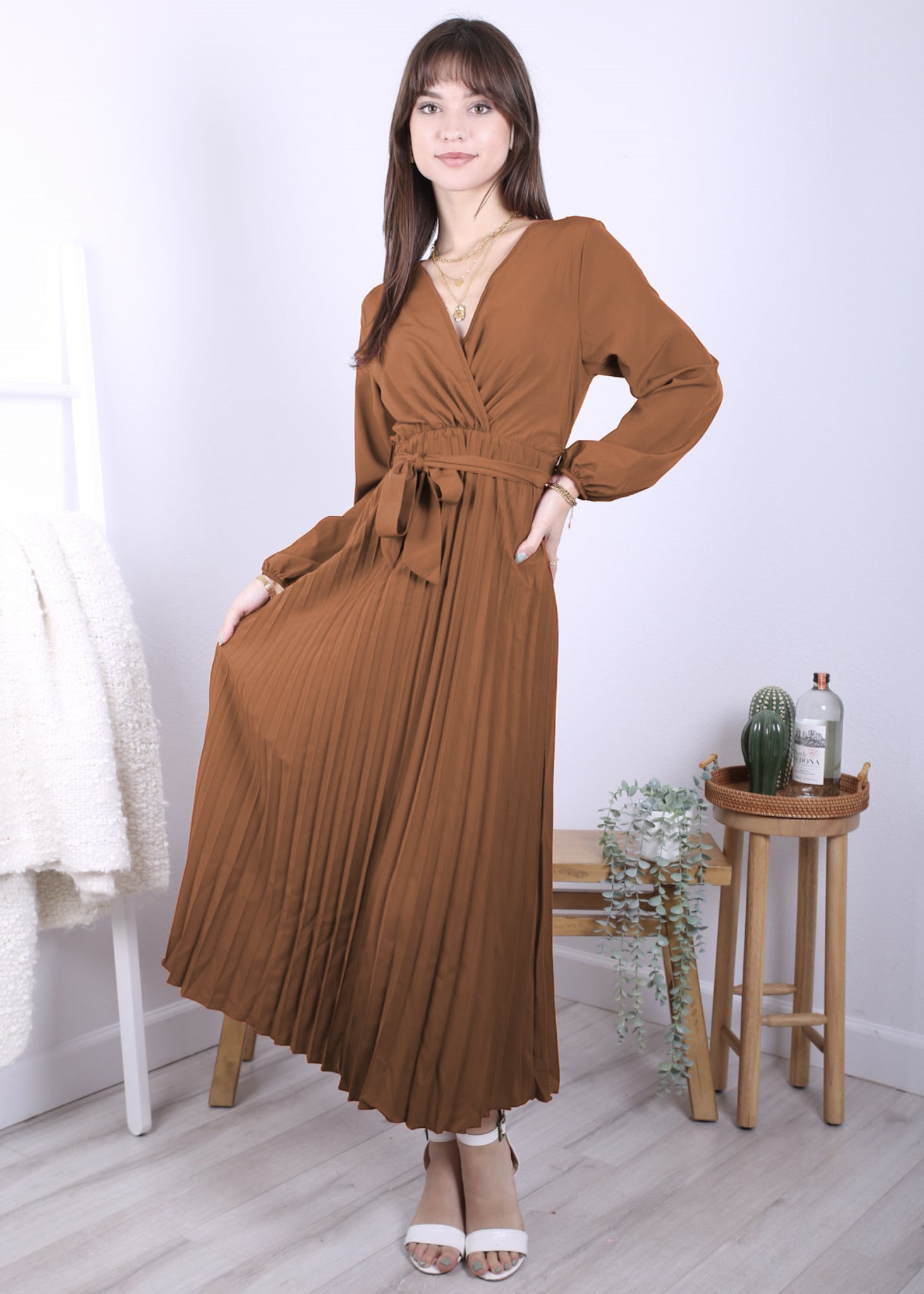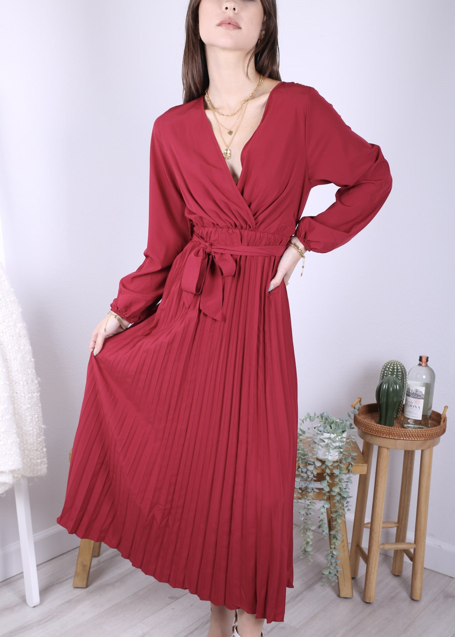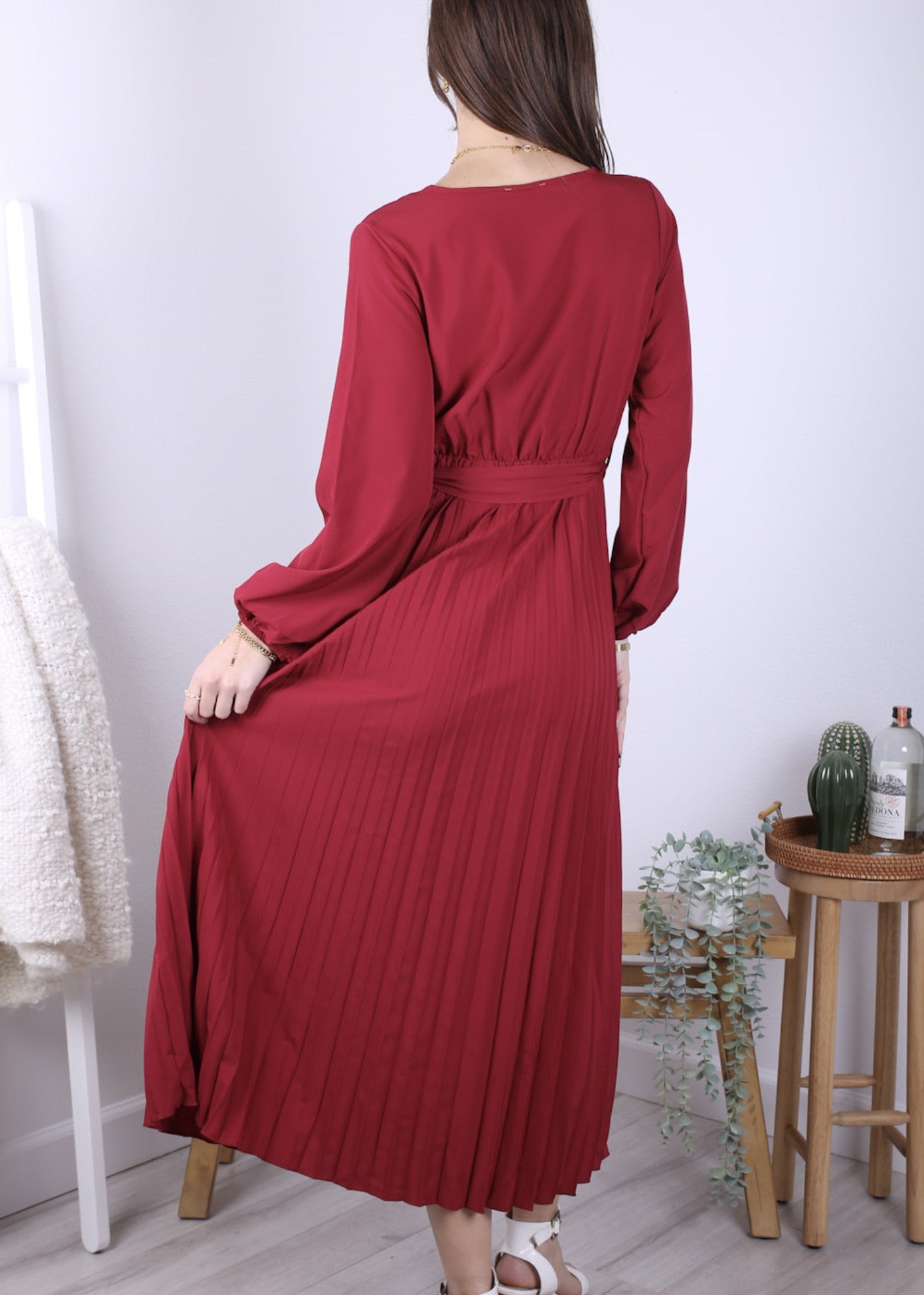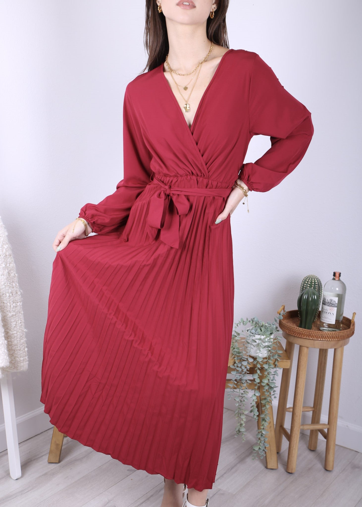 Anna-Kaci Women's Long Sleeve V-Neck Maxi Dress with Pleated Skirt and Waist Tie