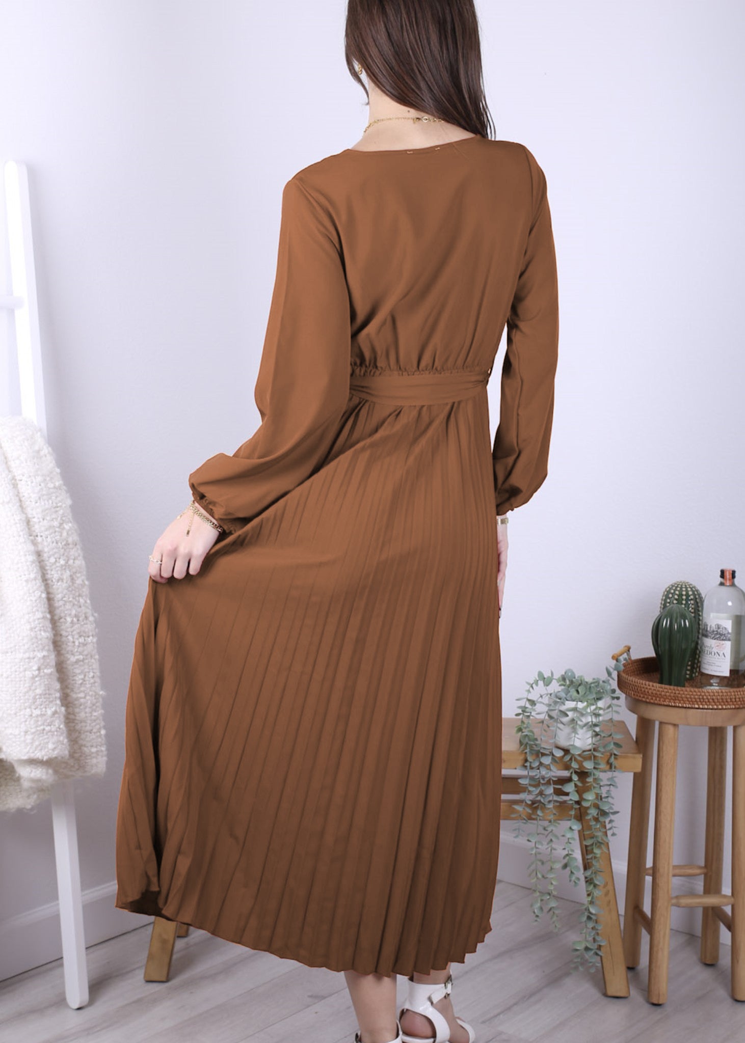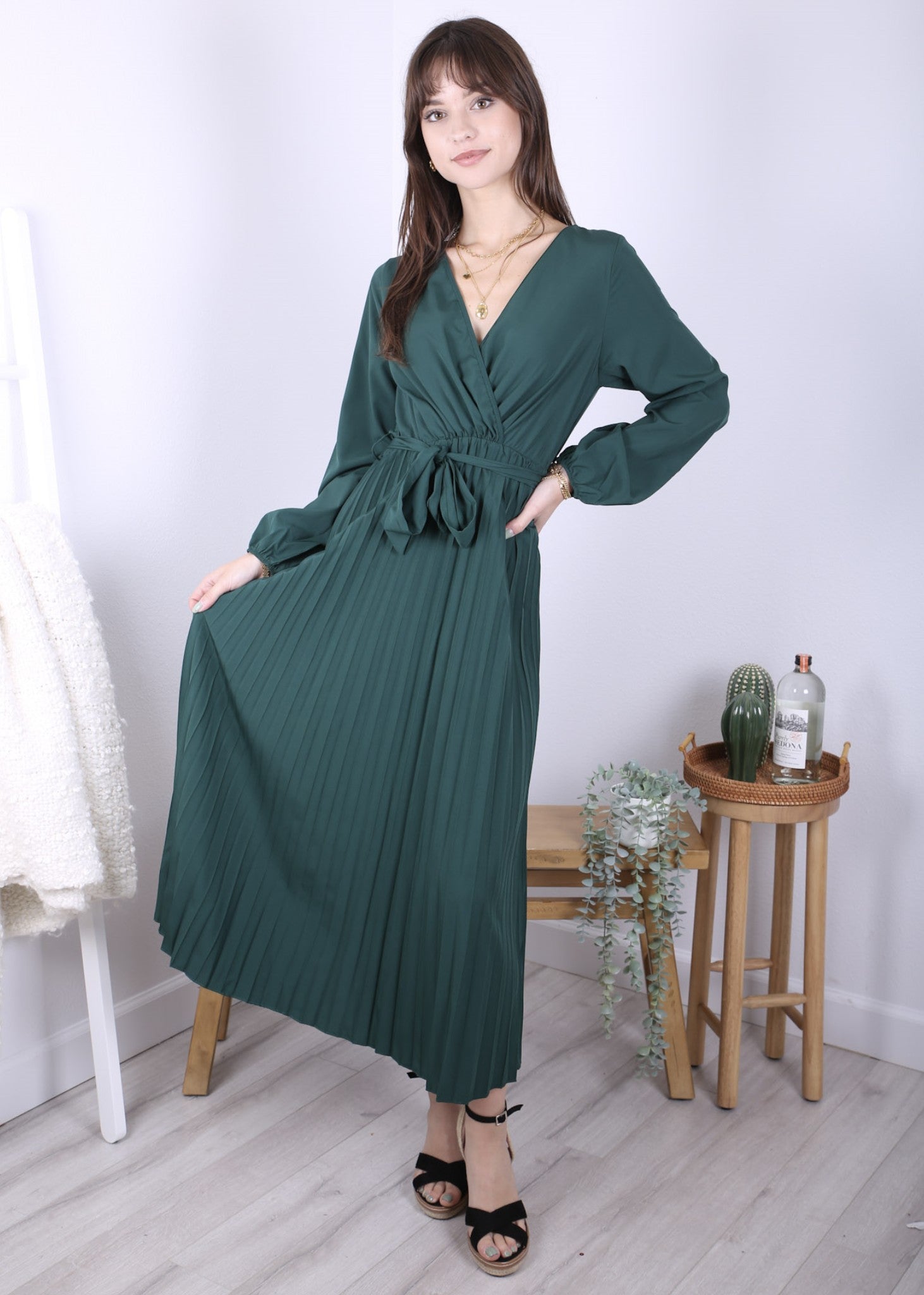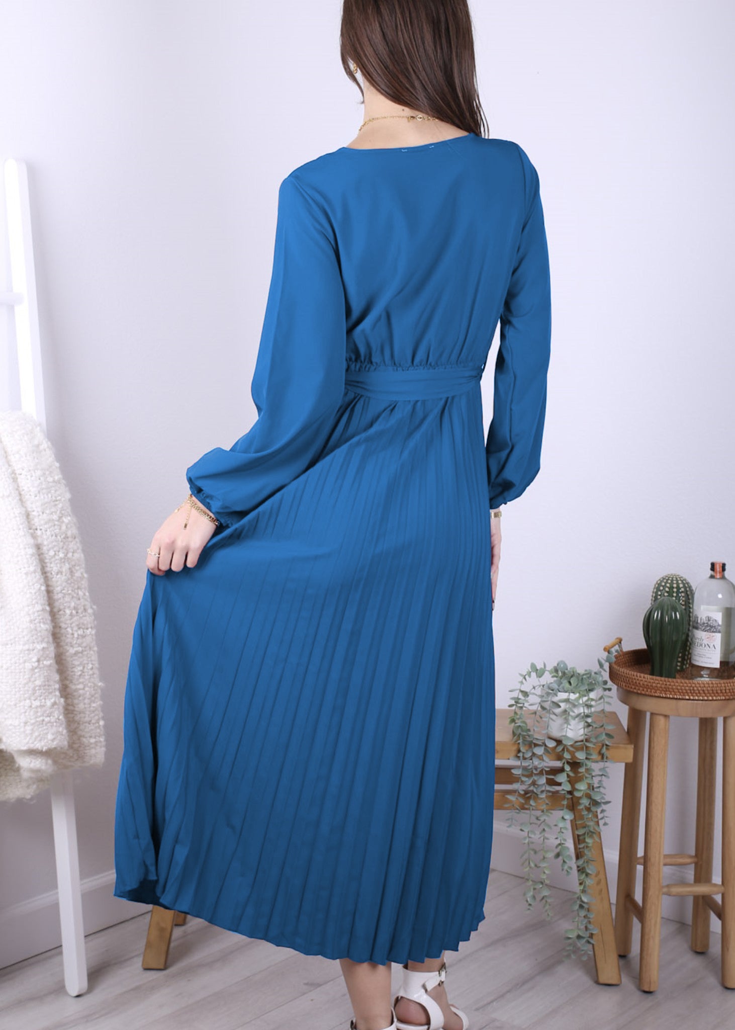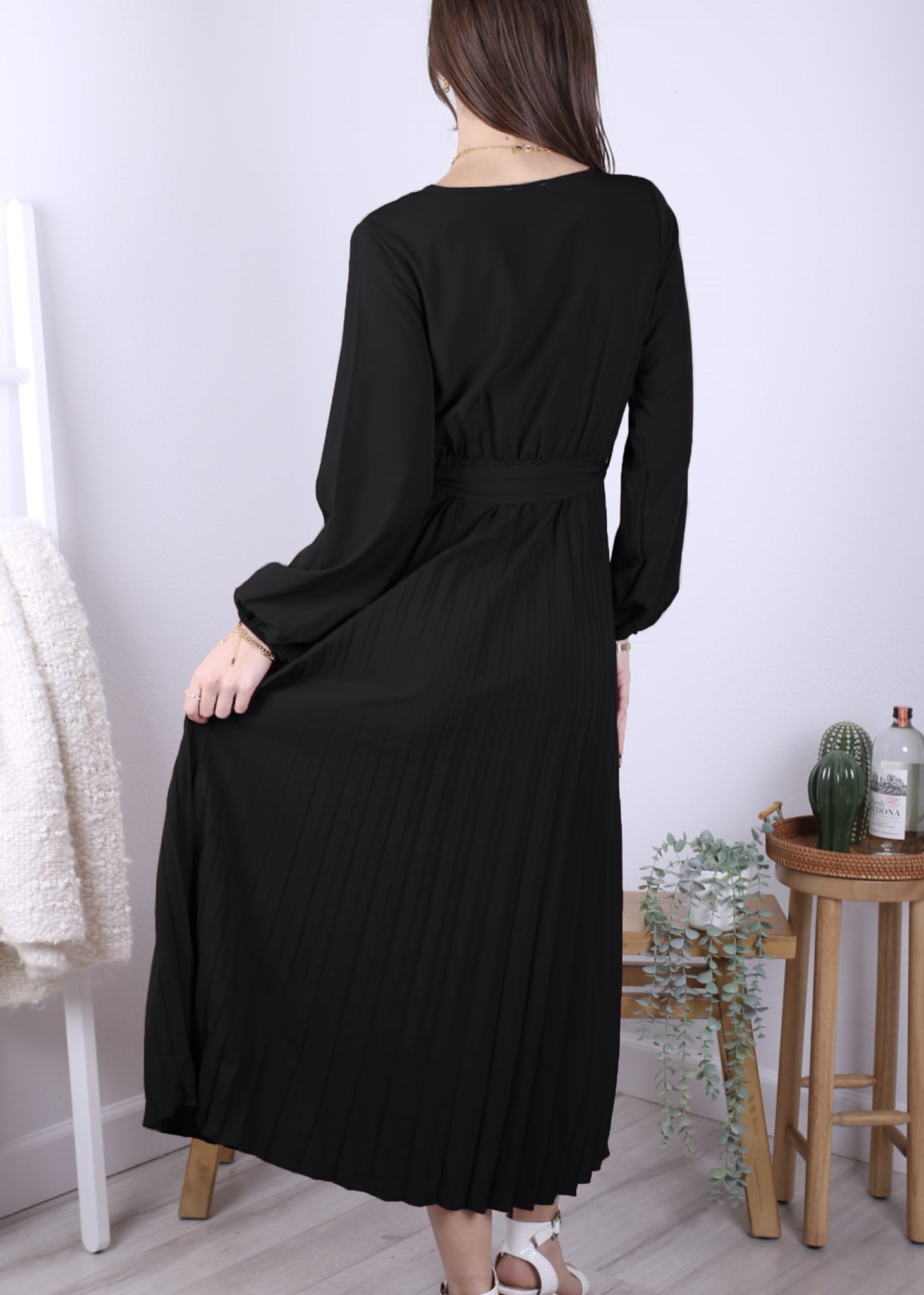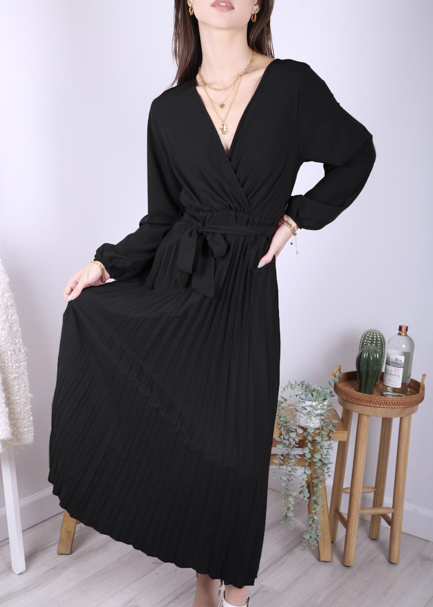Anna-Kaci Women's Long Sleeve V-Neck Maxi Dress with Pleated Skirt and Waist Tie