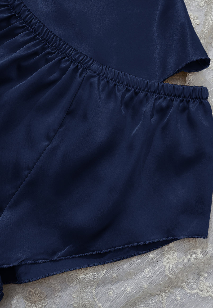 The Anna-Kaci lounge set is detailed with a cute cowl neck line. Features solid color, spaghetti strap top and matching garterized shorts. Pair it together with a sleep mask for a cozy sleep.