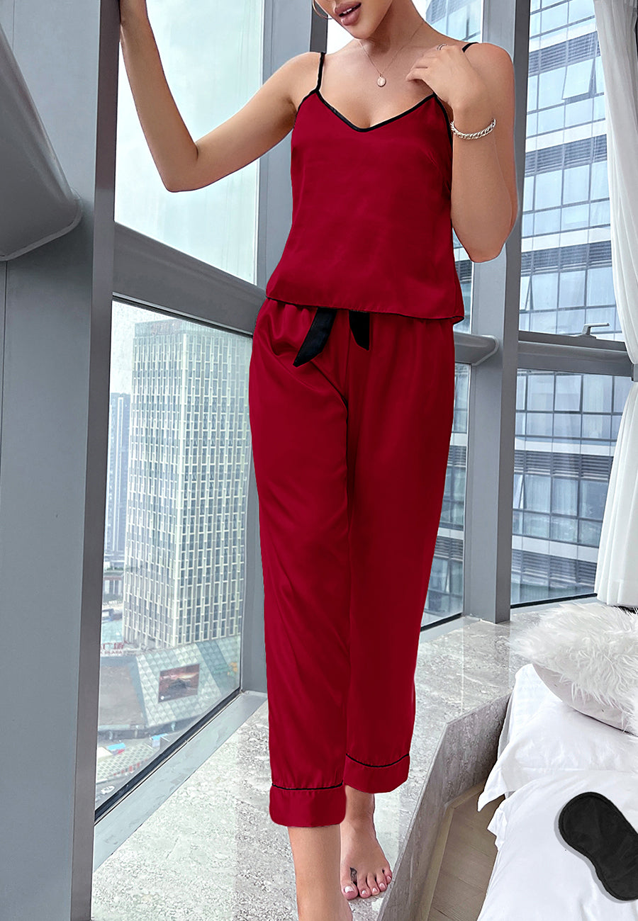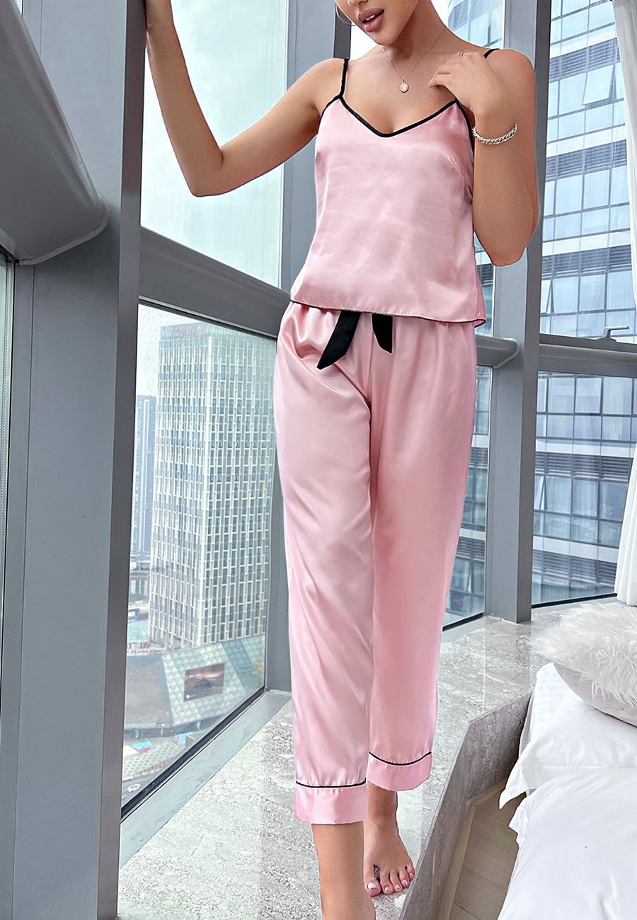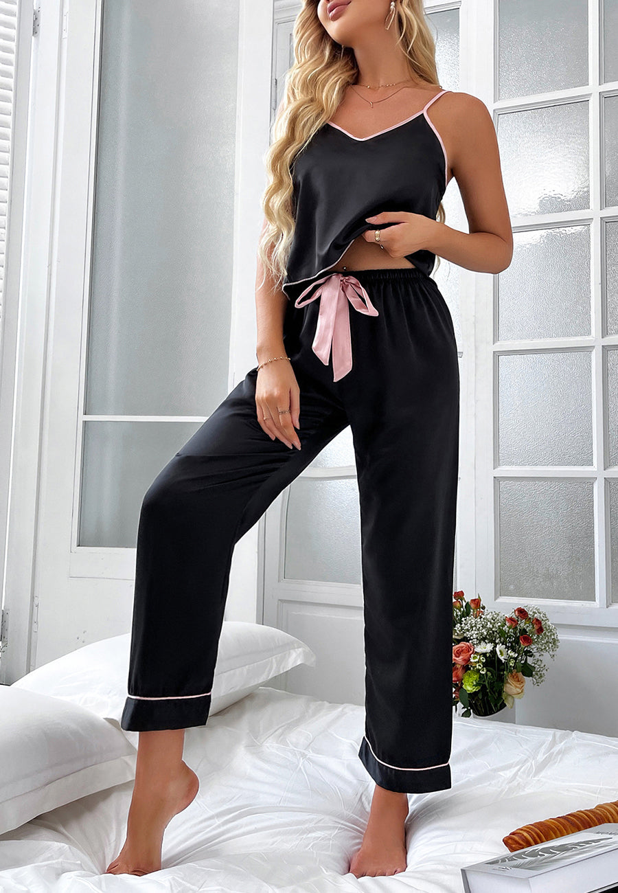 The Anna-Kaci lounge set is detailed with a cool contrast piping detail. Features a v neck line, spaghetti straps, regular fit tank and contrast tie waist, straight leg pajama pants. Pair it together with cozy slippers for a night in.
