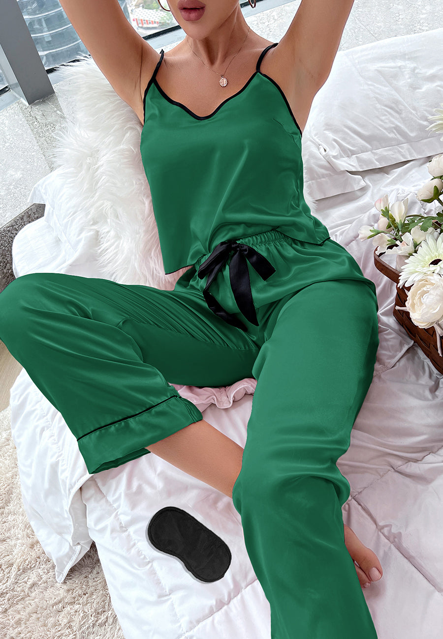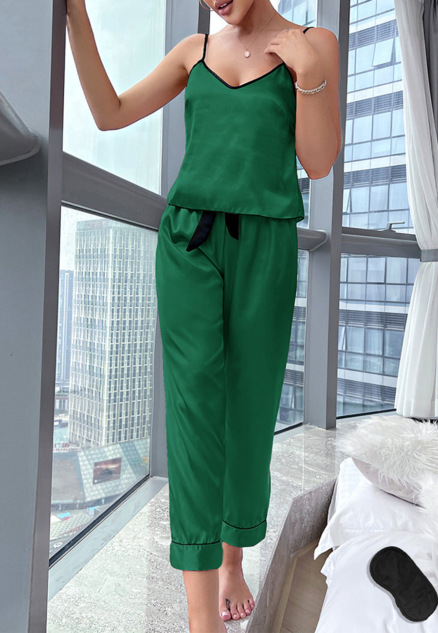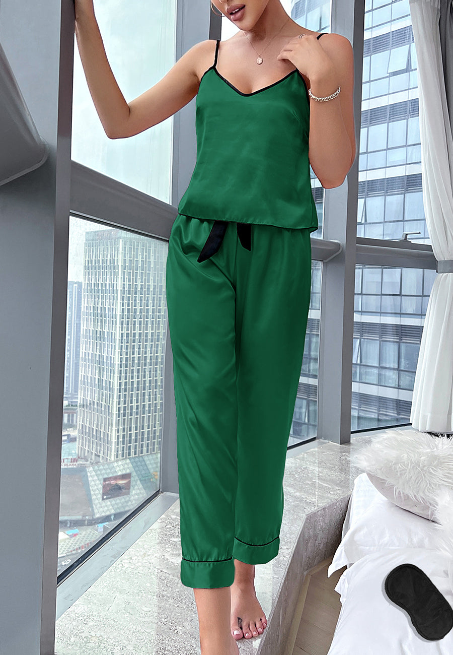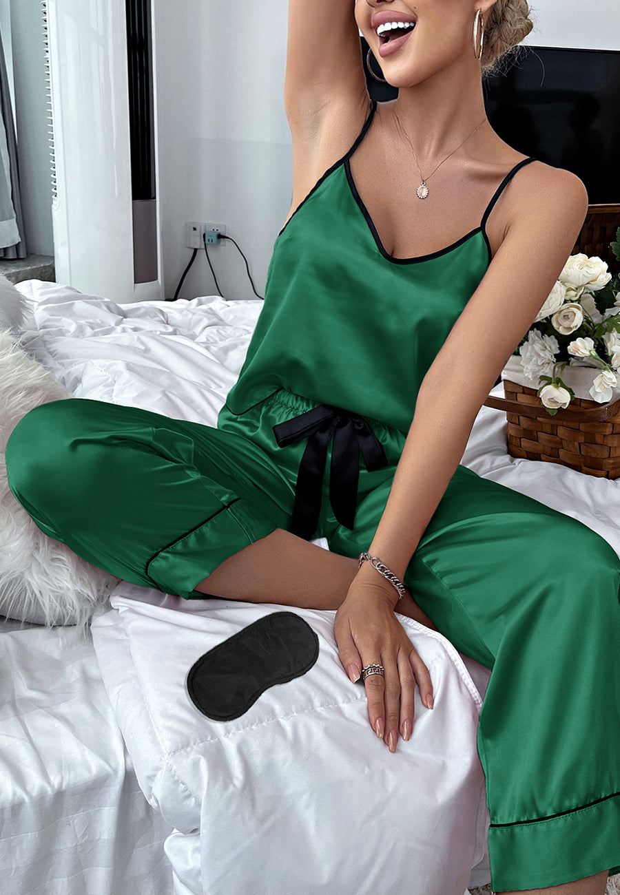 The Anna-Kaci lounge set is detailed with a cool contrast piping detail. Features a v neck line, spaghetti straps, regular fit tank and contrast tie waist, straight leg pajama pants. Pair it together with cozy slippers for a night in.