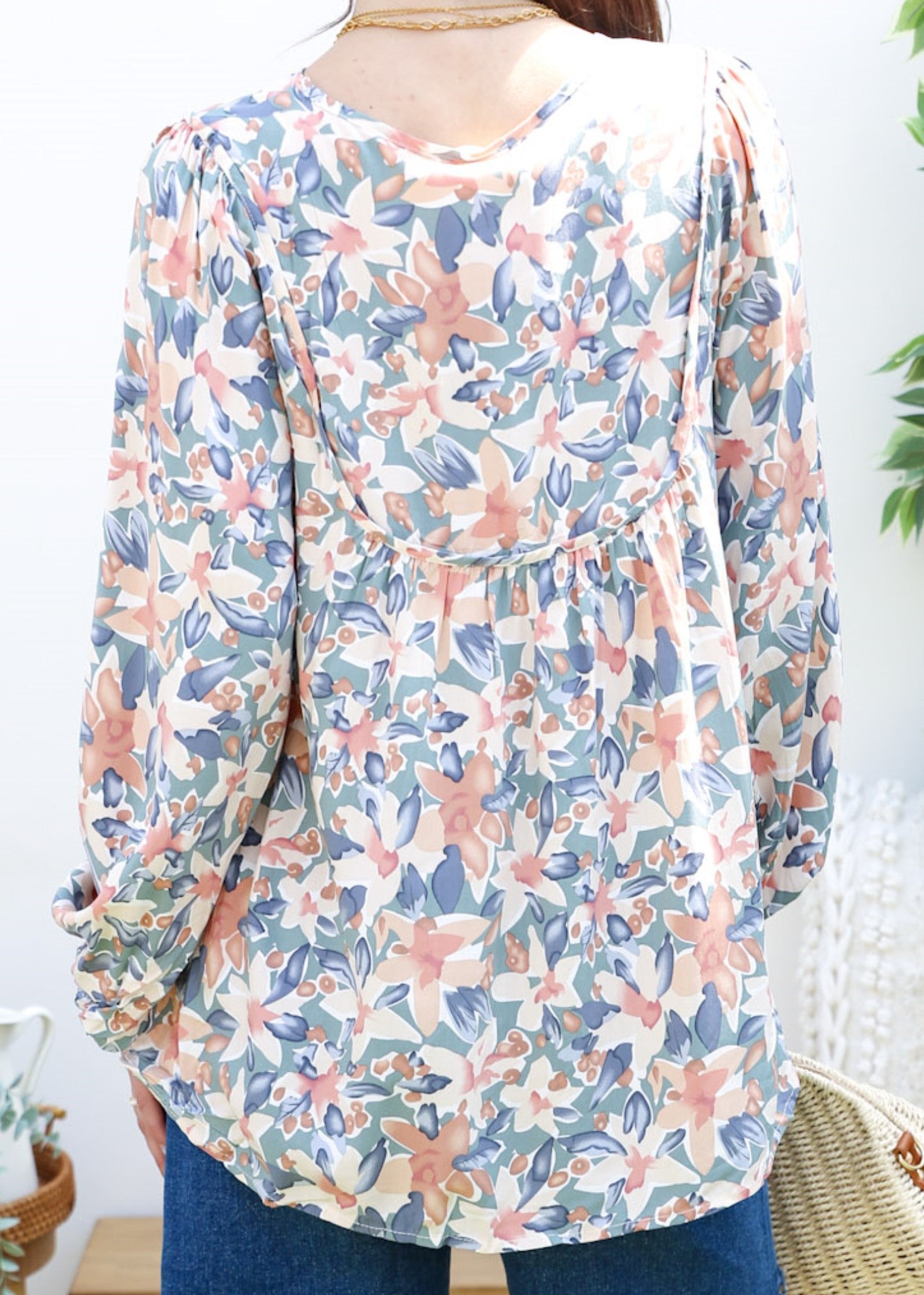 The Anna-Kaci blouse is detailed with a cute double tie front design. Features a floral print, long sleeves, and flowy fit. Pair it with a cuffed jeans and sandals for an amazing look.
