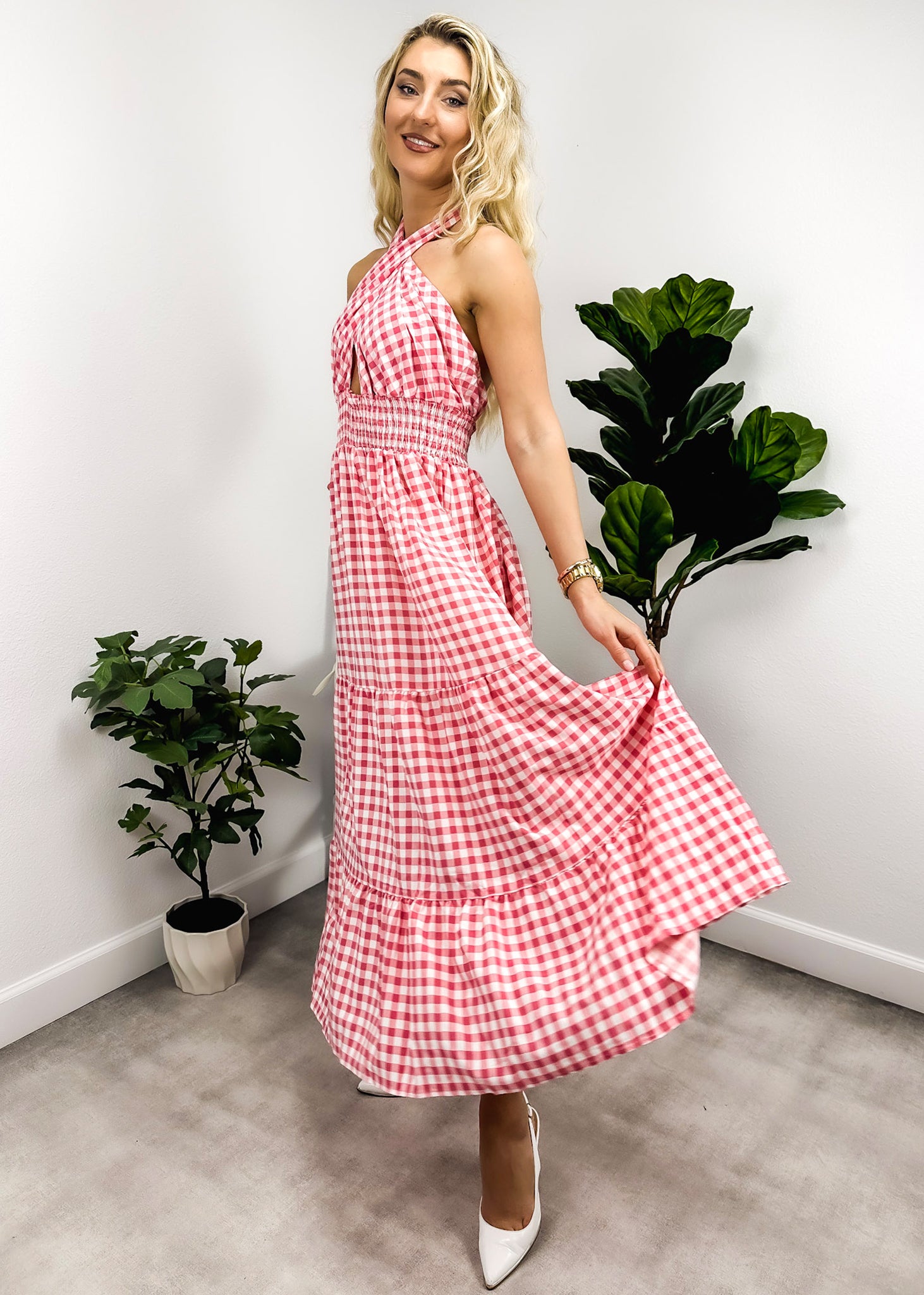 The Anna-Kaci dress is detailed with a sexy cross neck halter style. Features different prints, tie back detail, flowy skirt, ruffle hem, and above ankle length. Pair it with a straw hat and tote bag for a fantastic look.