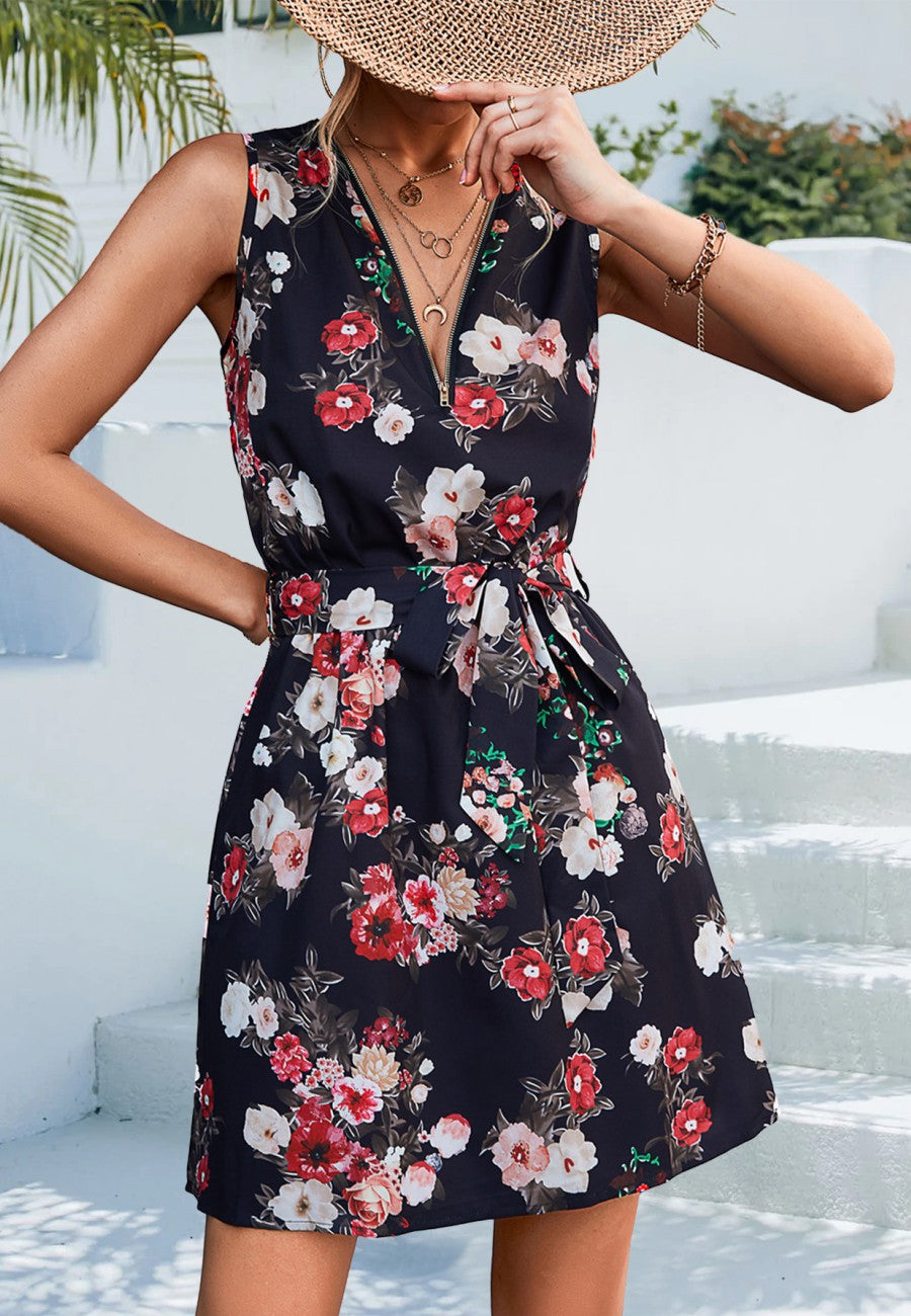The Anna-Kaci dress is detailed with a cute zip-up detail. Features a floral print, sleeveless, tie waist detail, A-line silhouette, and above knee length. Pair it with hoop earrings and heels for an elegant look.