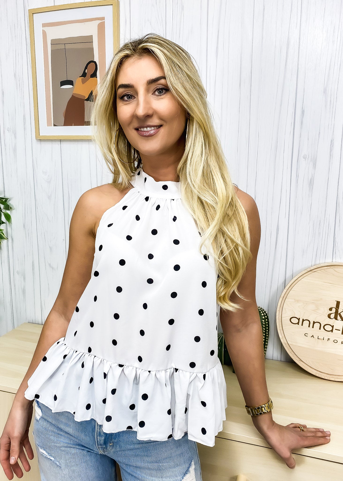 The Anna-Kaci top is detailed with a classic polka dot print. Features a halter neck line, tie back detail, peplum hem, and flowy fit. Pair it with white shorts and flatforms for a beautiful look.