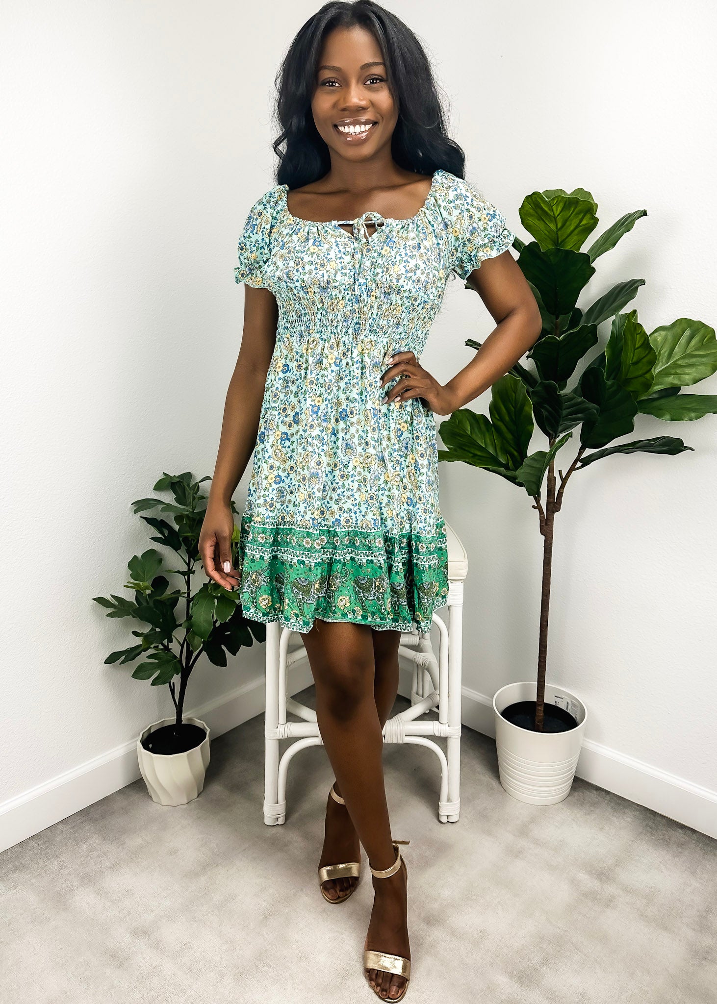 The Anna-Kaci dress is detailed with beautiful puff sleeves. Features a boho print, off-shoulder neck line, tie detail, flowy skirt, and above knee length. Pair it with a handbag and sandals for a glamorous look.