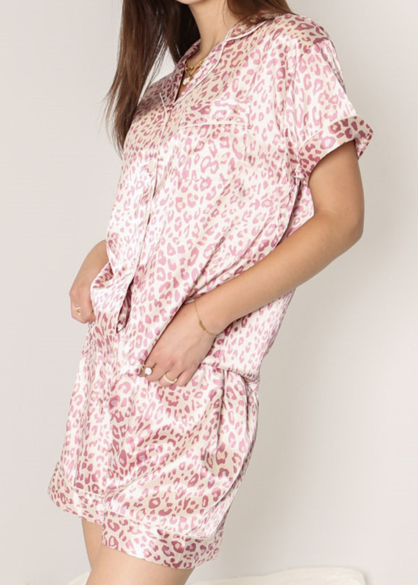 The Anna-Kaci sleepwear is detailed with a bold leopard print. Features a collar, button down closure, short sleeves, loose fit top and matching shorts. Pair it together with fuzzy slippers for a comfy look.