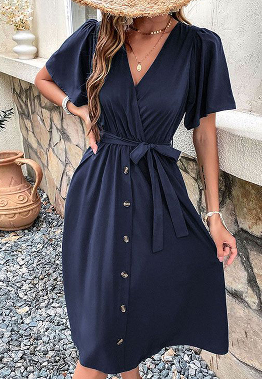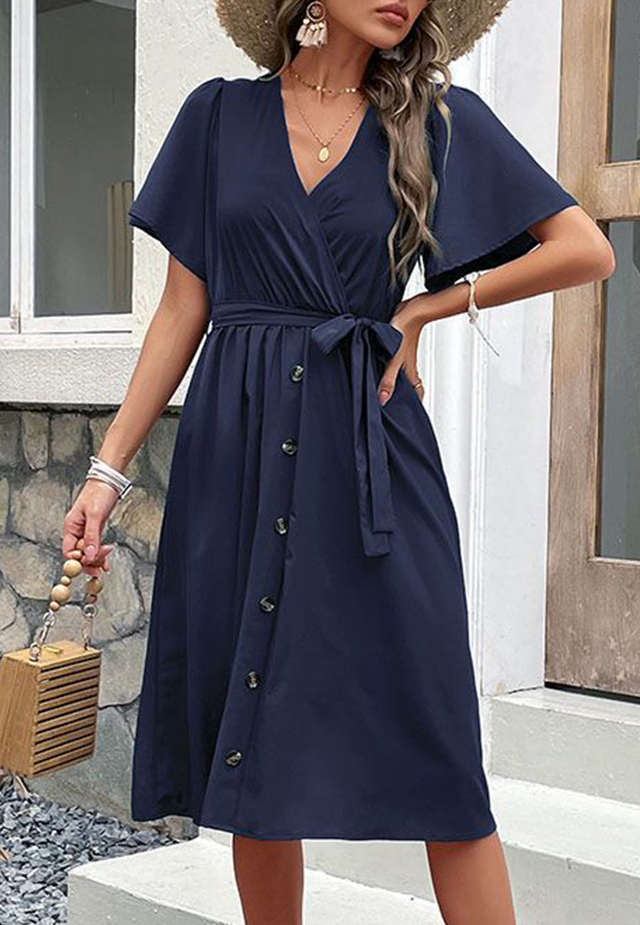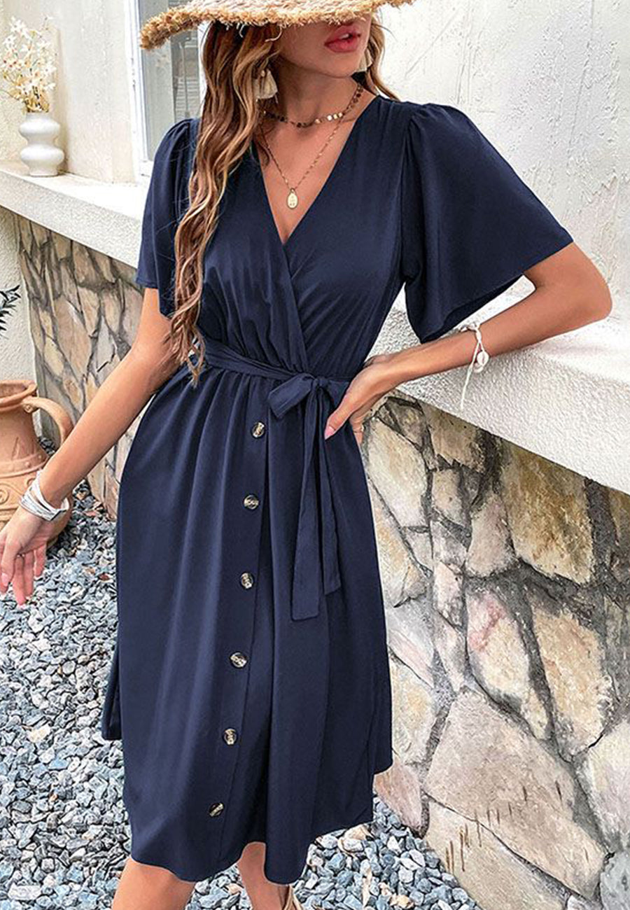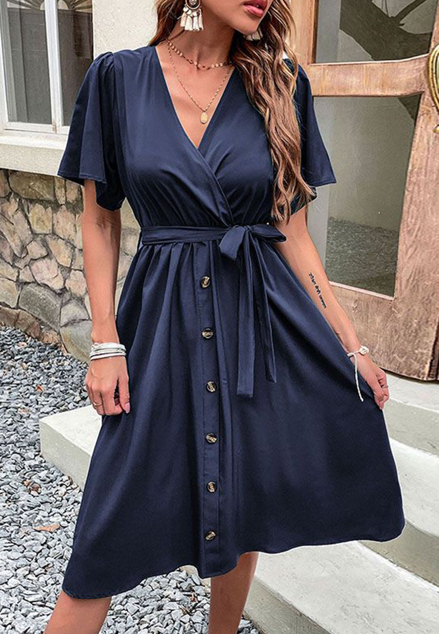 The Anna-Kaci dress is detailed with a cool button detail. Features a solid color, surplice neck line, short sleeves, tie waist detail, flowy skirt, and knee length. Pair it with sunnies and heels for a cute look.
