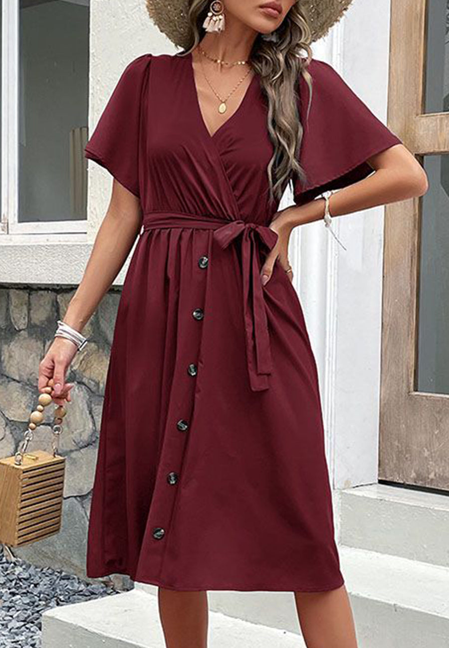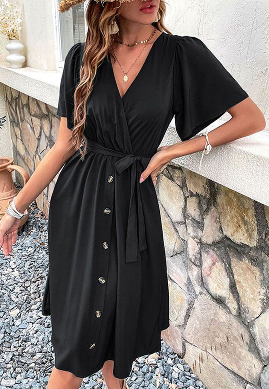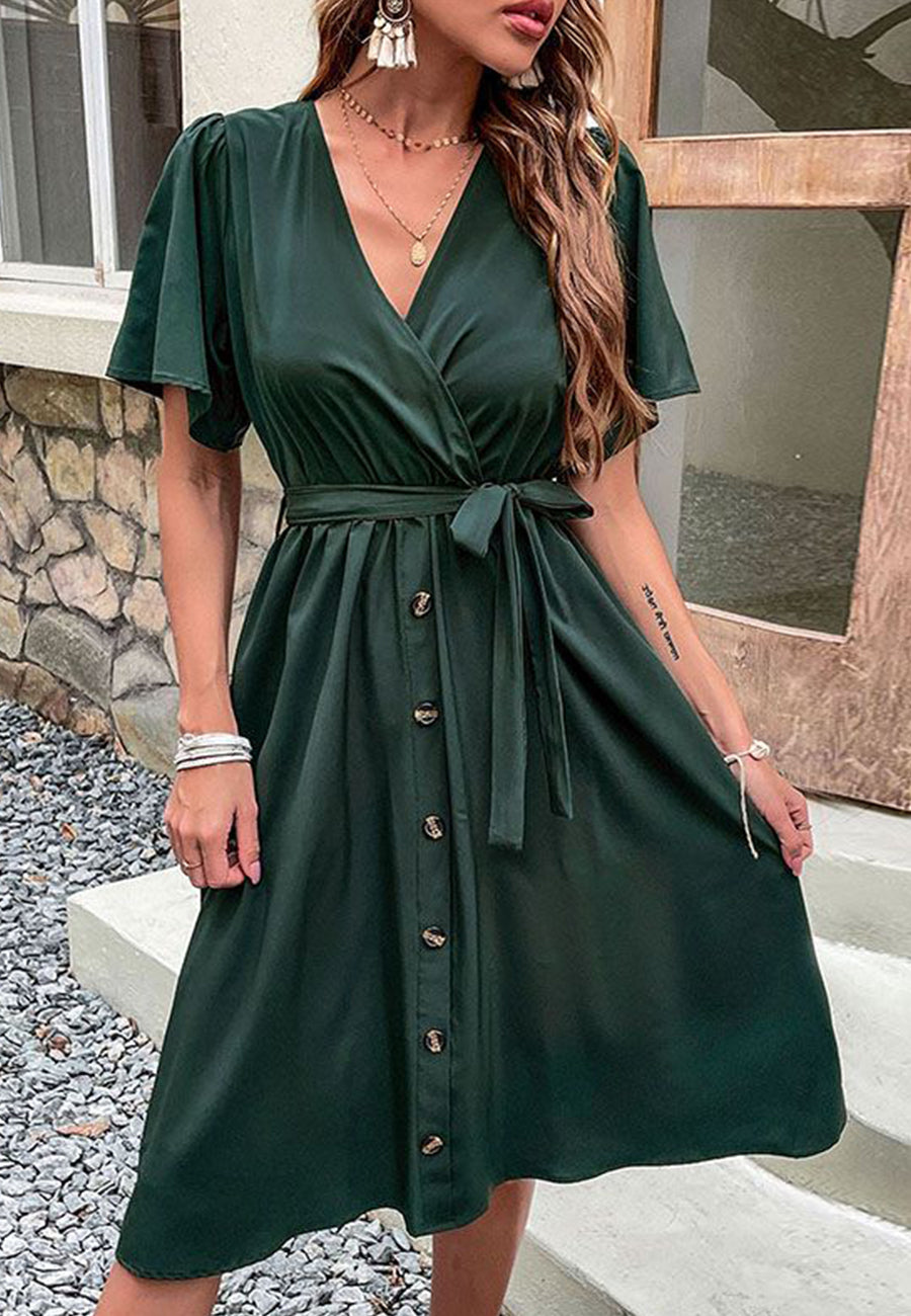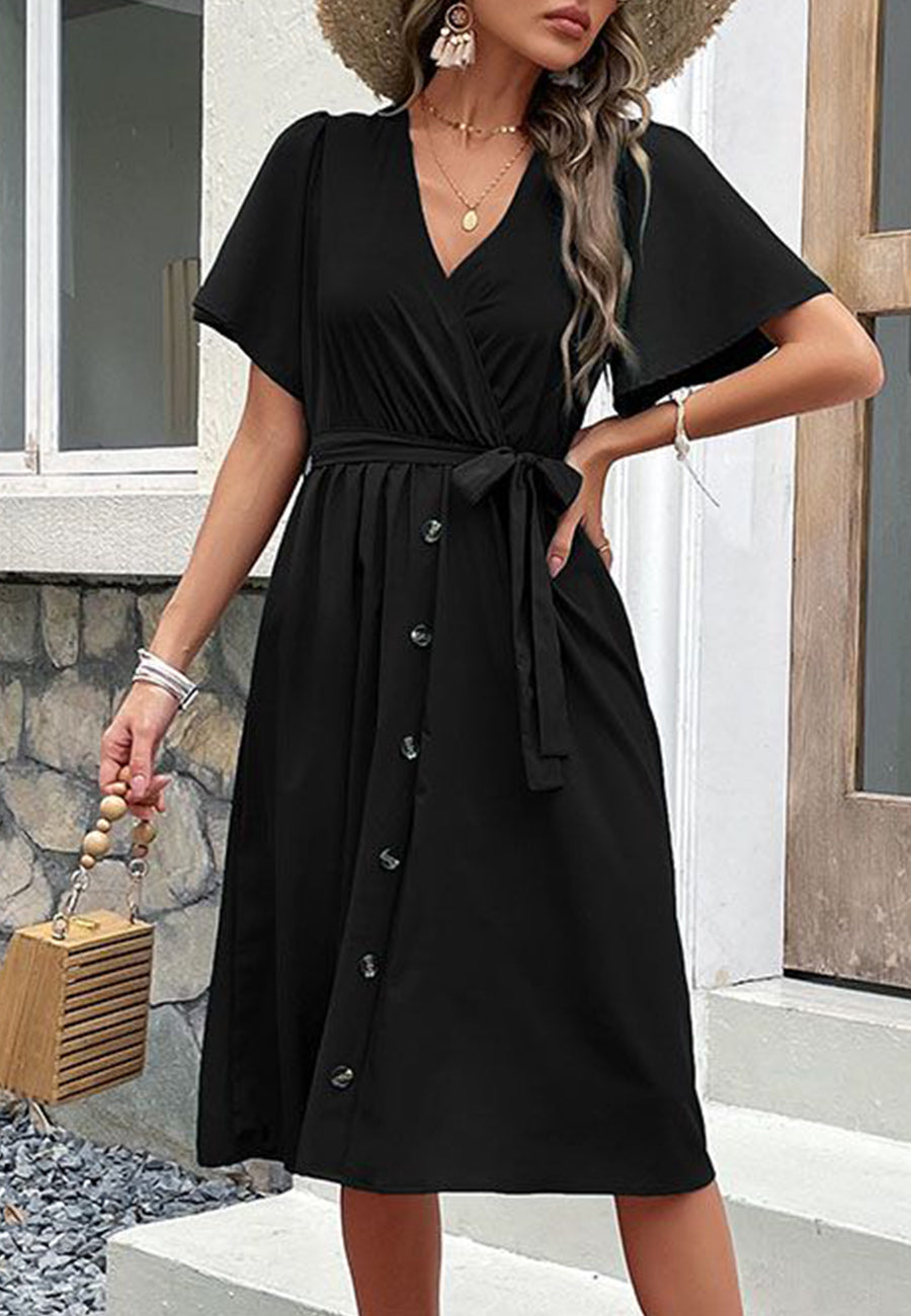 The Anna-Kaci dress is detailed with a cool button detail. Features a solid color, surplice neck line, short sleeves, tie waist detail, flowy skirt, and knee length. Pair it with sunnies and heels for a cute look.