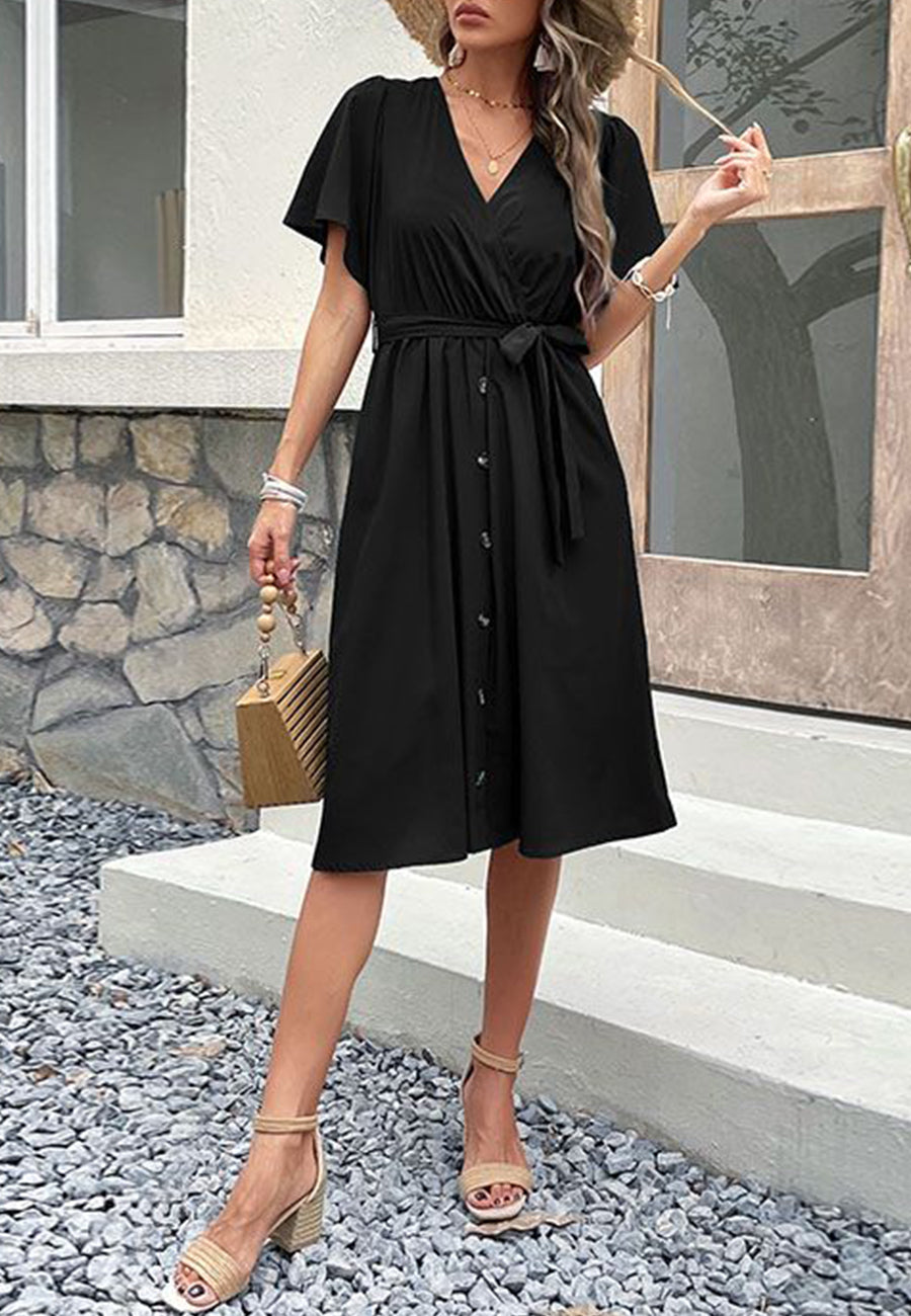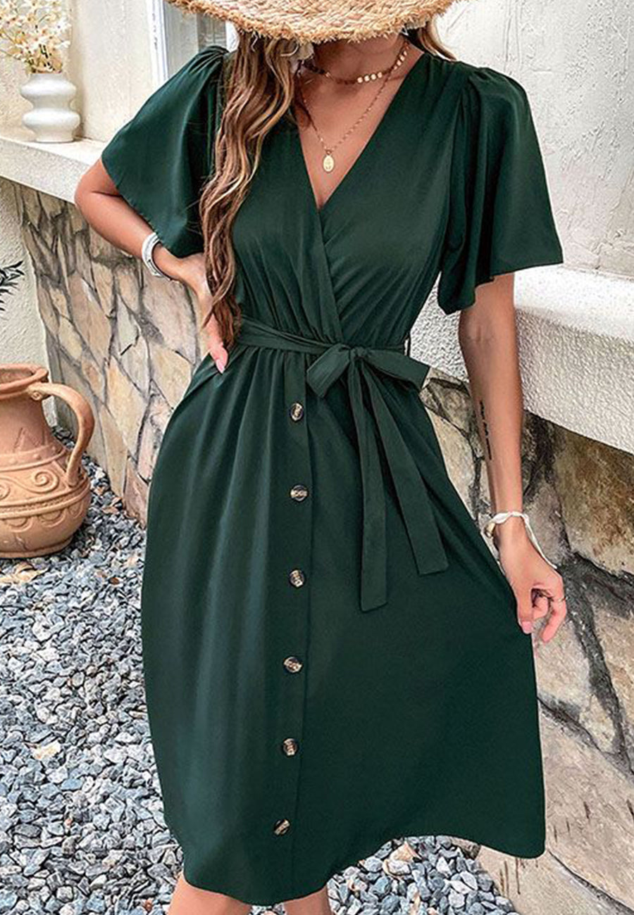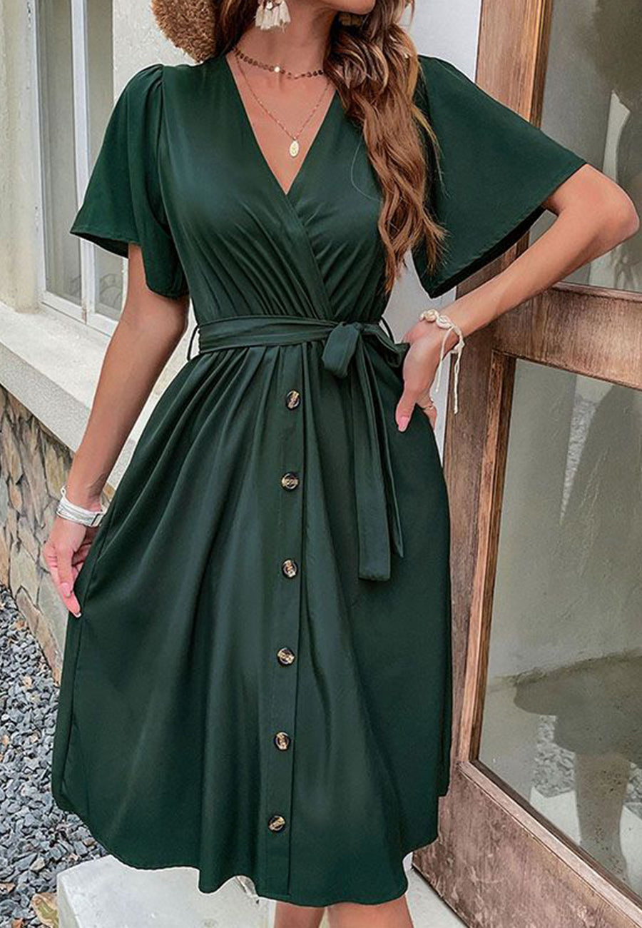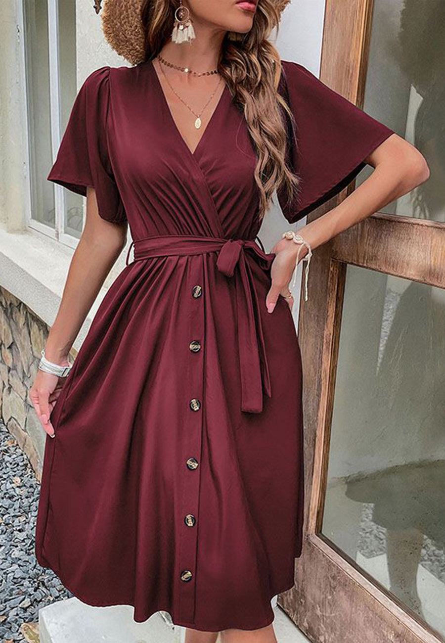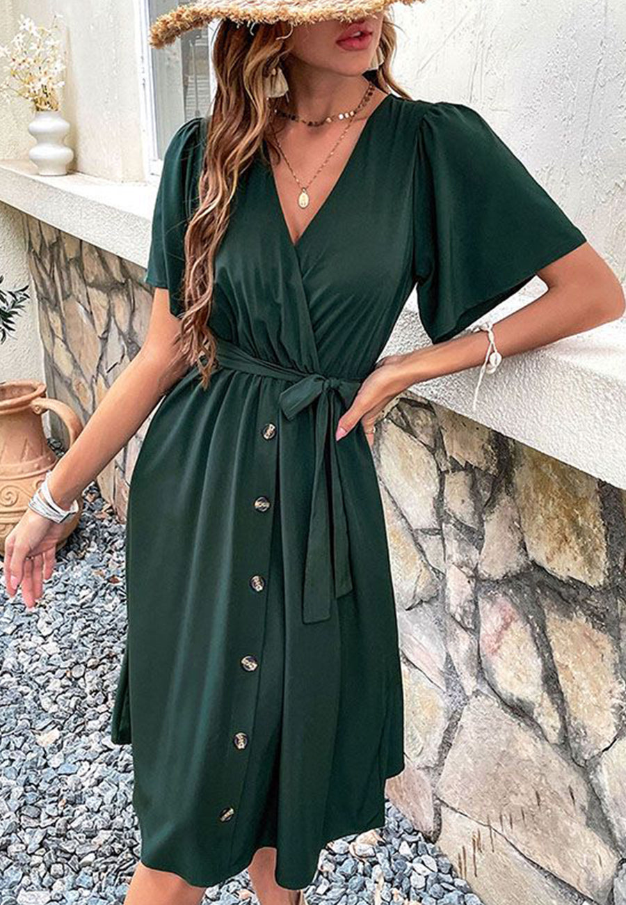 The Anna-Kaci dress is detailed with a cool button detail. Features a solid color, surplice neck line, short sleeves, tie waist detail, flowy skirt, and knee length. Pair it with sunnies and heels for a cute look.