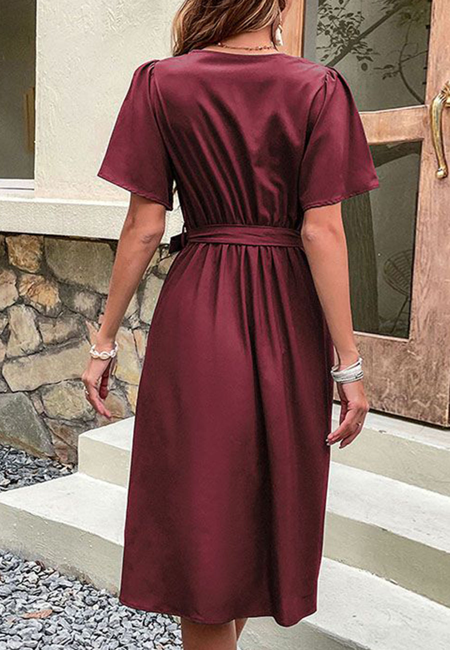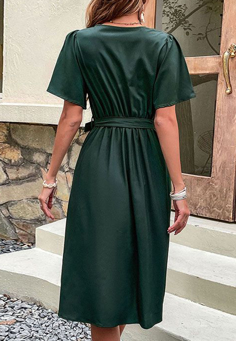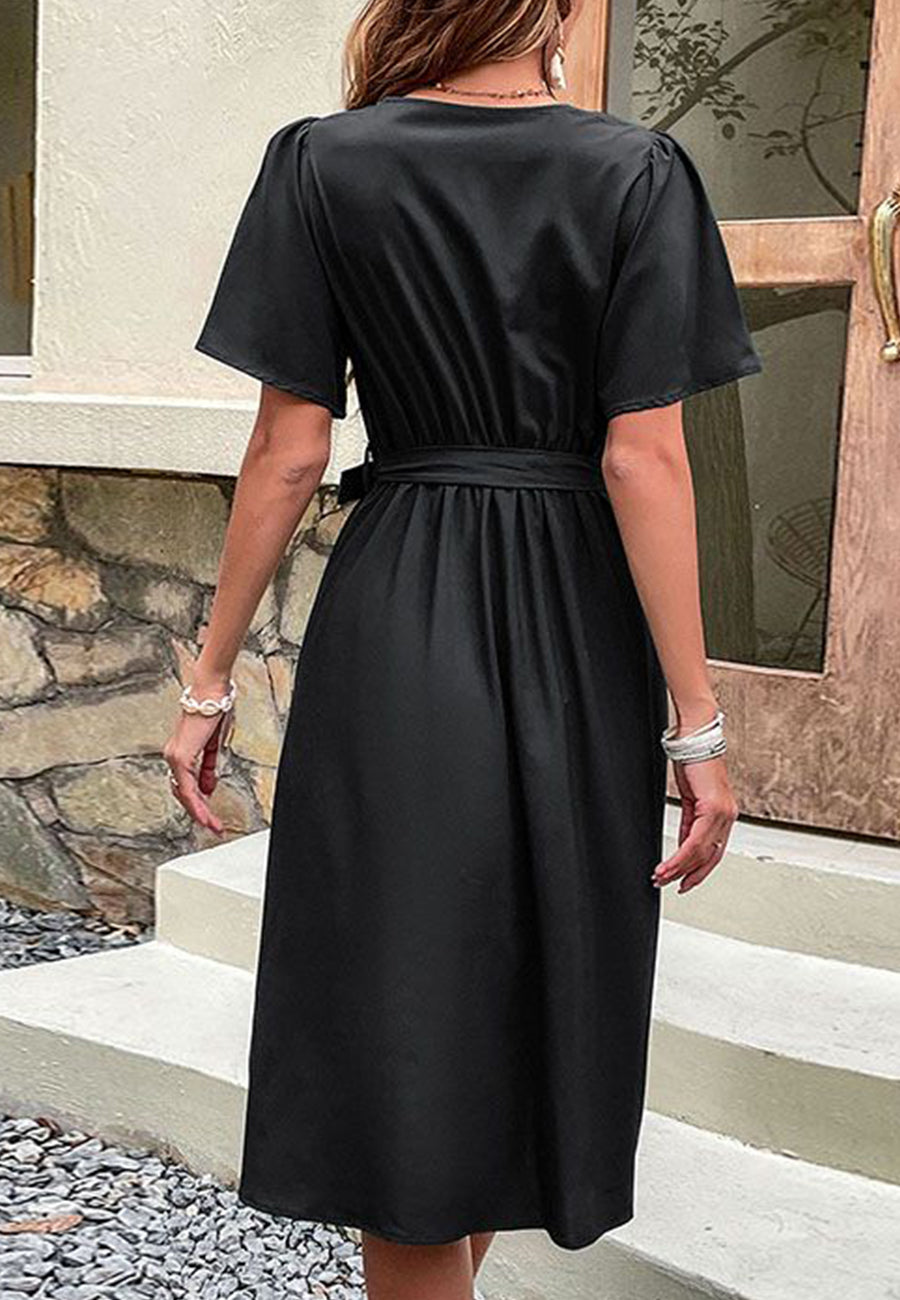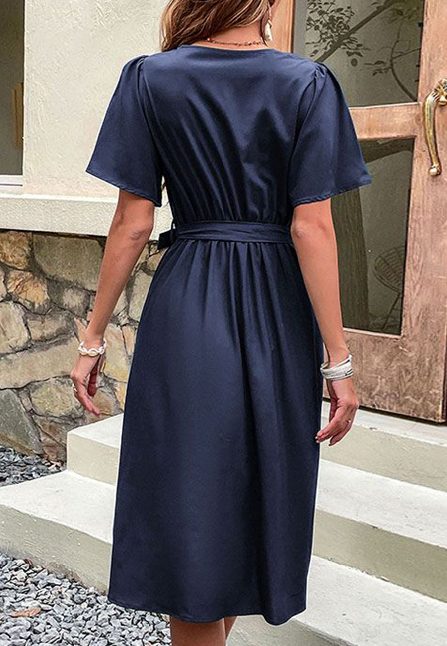 The Anna-Kaci dress is detailed with a cool button detail. Features a solid color, surplice neck line, short sleeves, tie waist detail, flowy skirt, and knee length. Pair it with sunnies and heels for a cute look.
