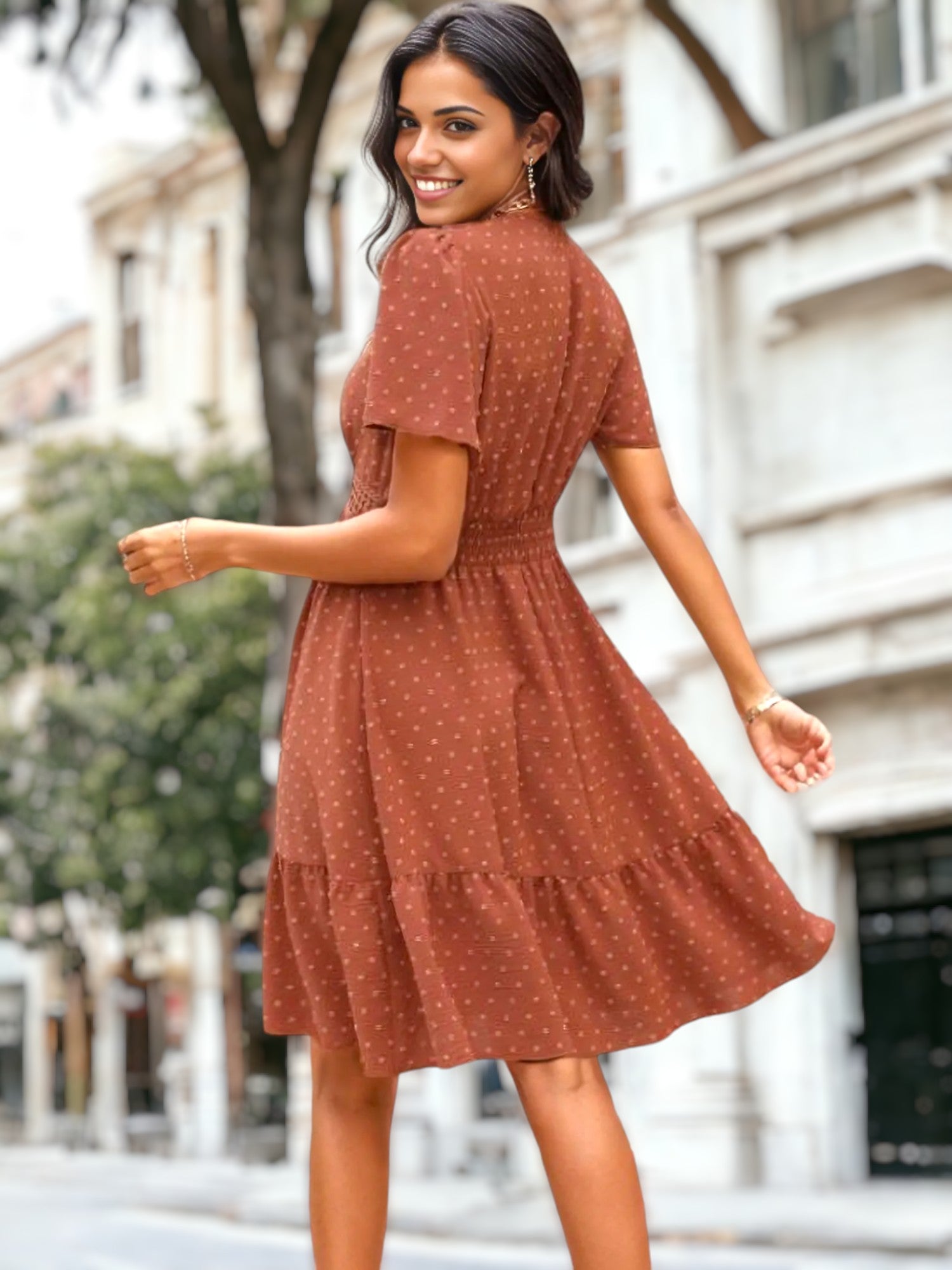The Anna-Kaci dress is detailed with a cute crochet lace waist detail. Features a v neck line, swiss dot material, short sleeves, flowy skirt, ruffle hem, and above knee length. Pair it with a clutch and heels for a fantastic look.