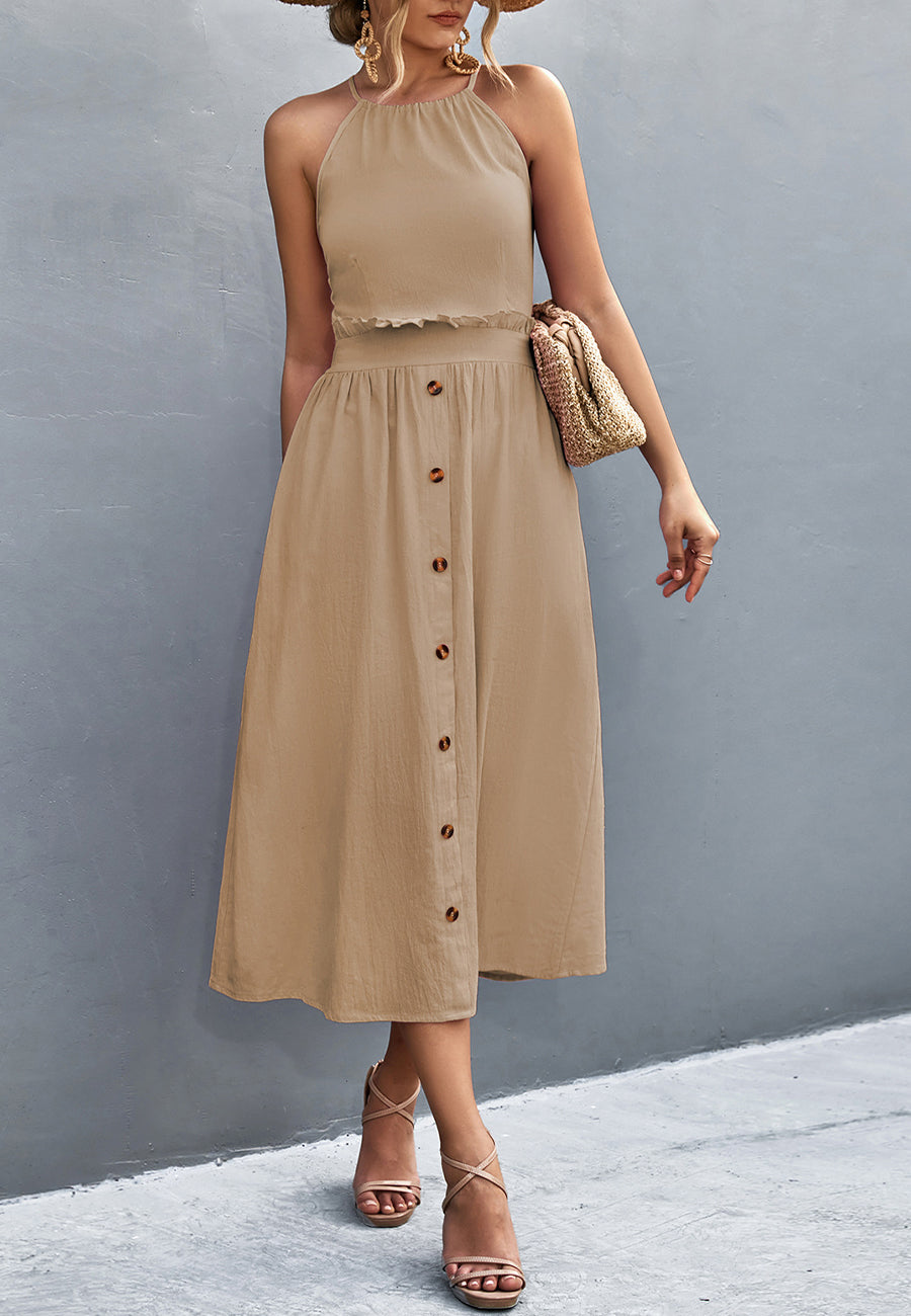 The Anna-Kaci dress is detailed with a sexy criss-cross back design. Features solid color, halter neck line, ruffle detail, contrast button design, A-line silhouette, and mid-calf length. Pair it with hoop earrings and stilettos for a gorgeous look.