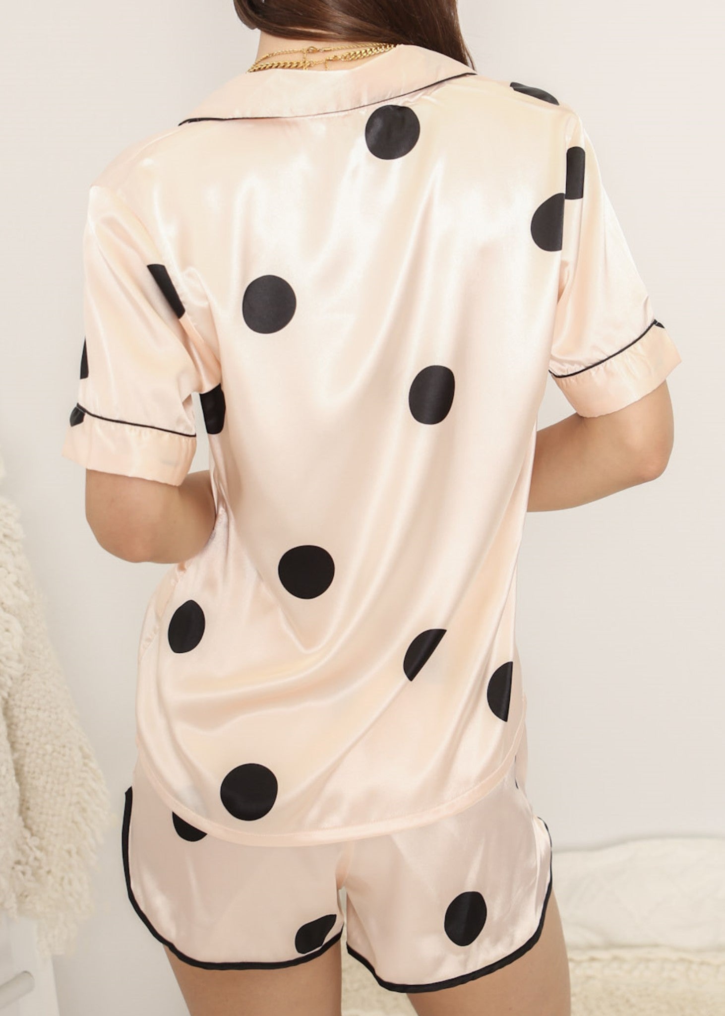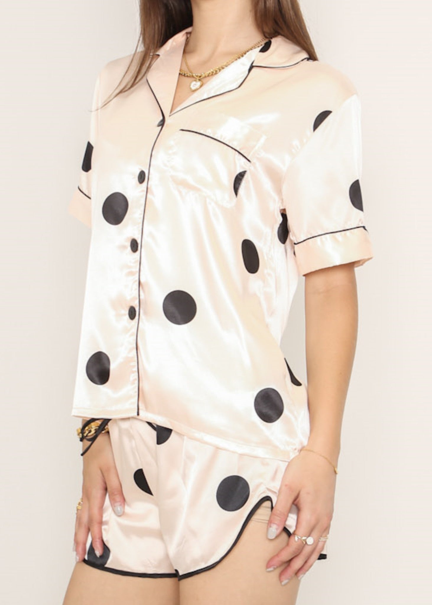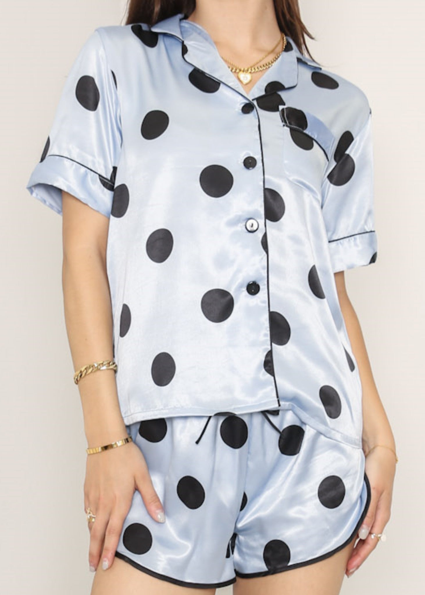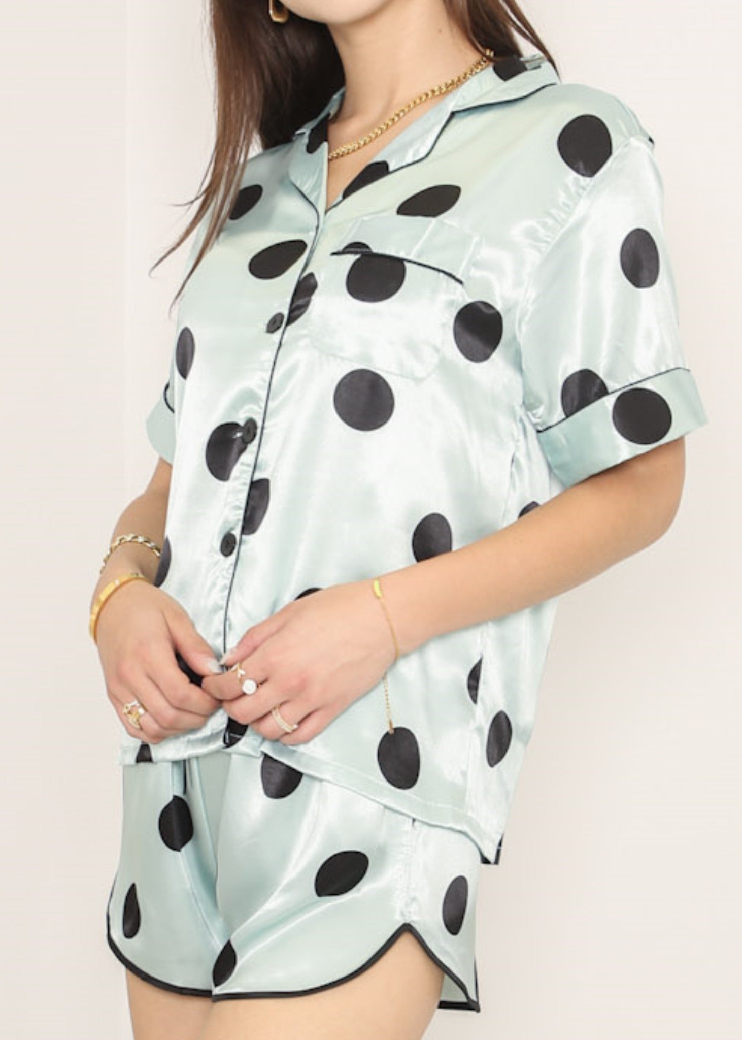 Anna-Kaci Lounge Women's Polka Dot Satin Pajama Set with Short Sleeve Button Top and Drawstring Shorts
