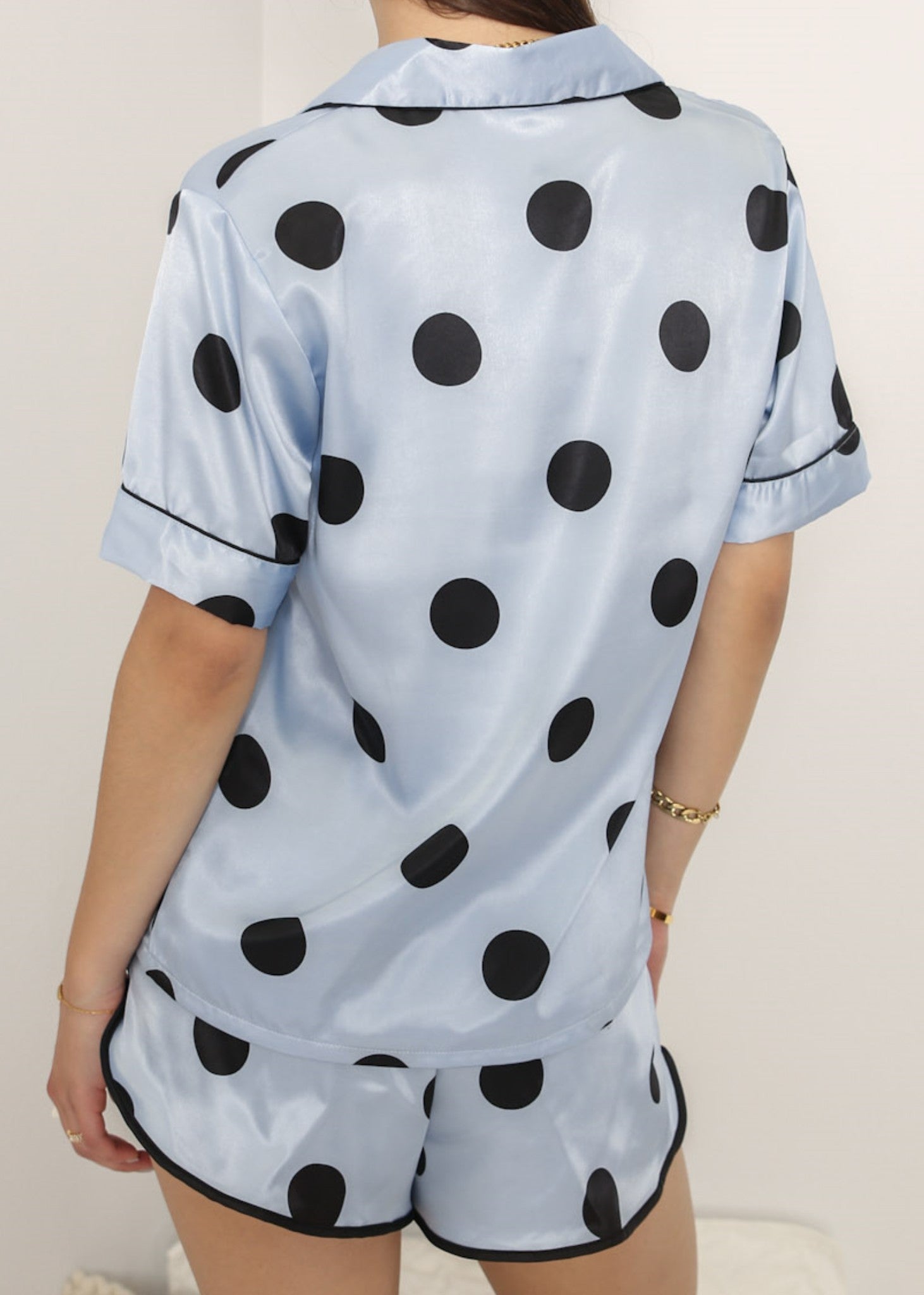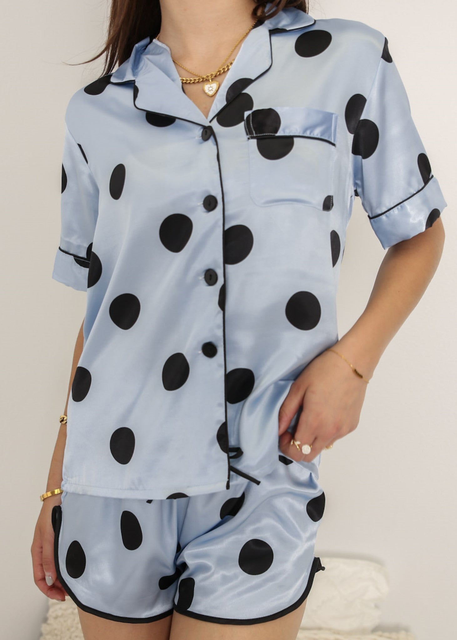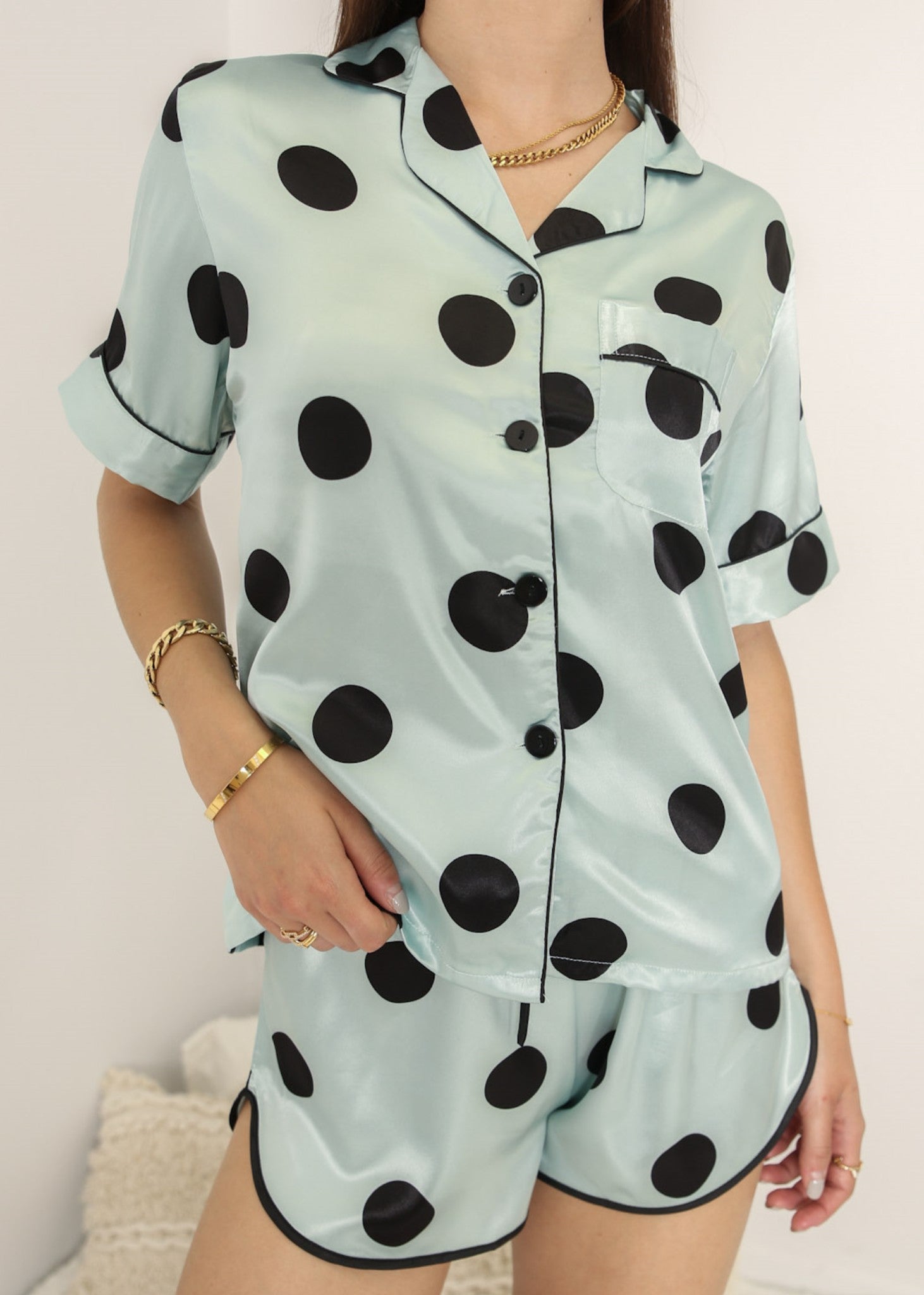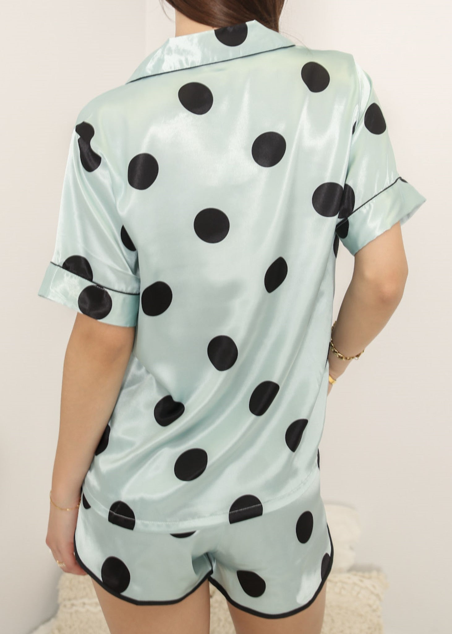 Anna-Kaci Lounge Women's Polka Dot Satin Pajama Set with Short Sleeve Button Top and Drawstring Shorts