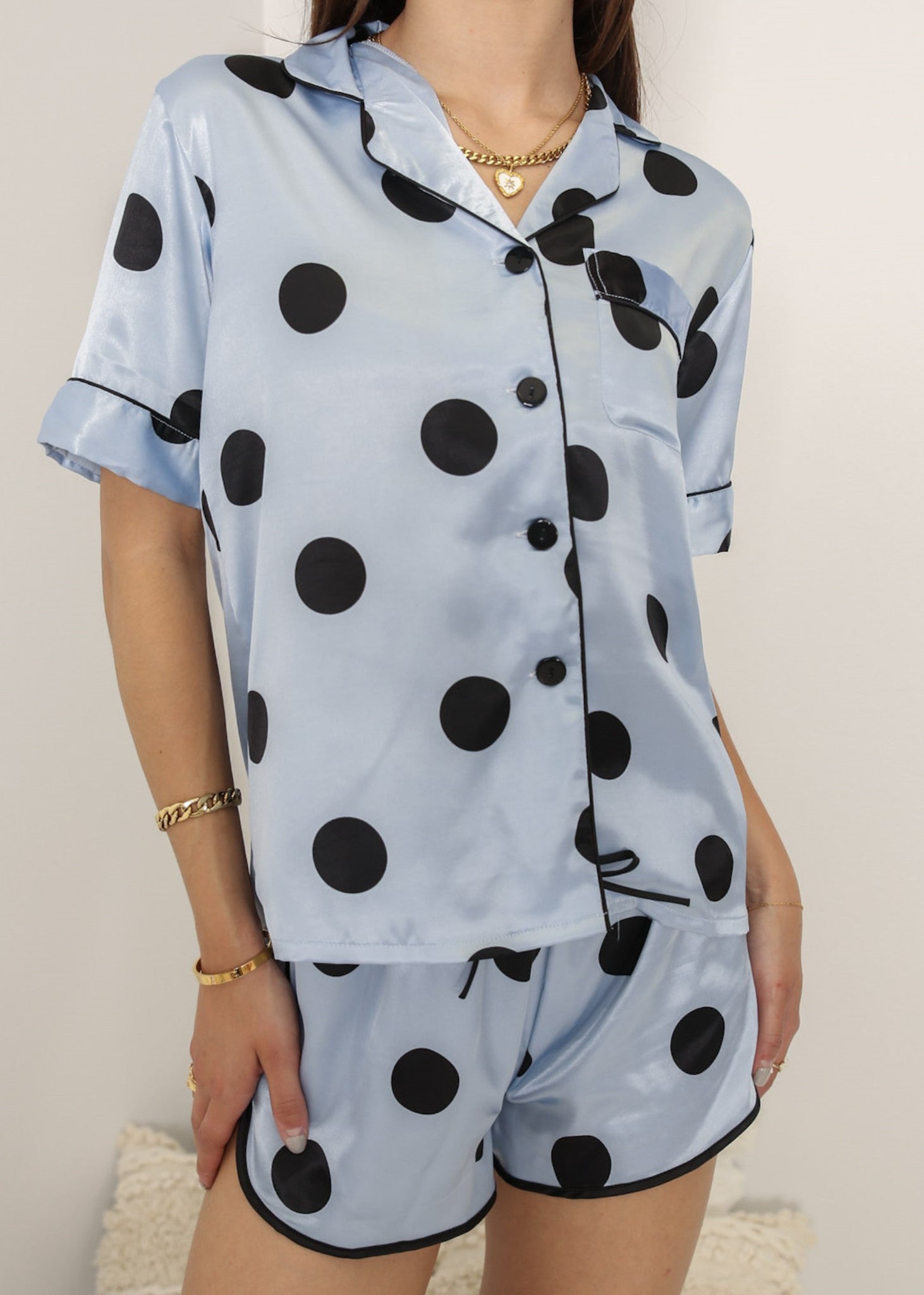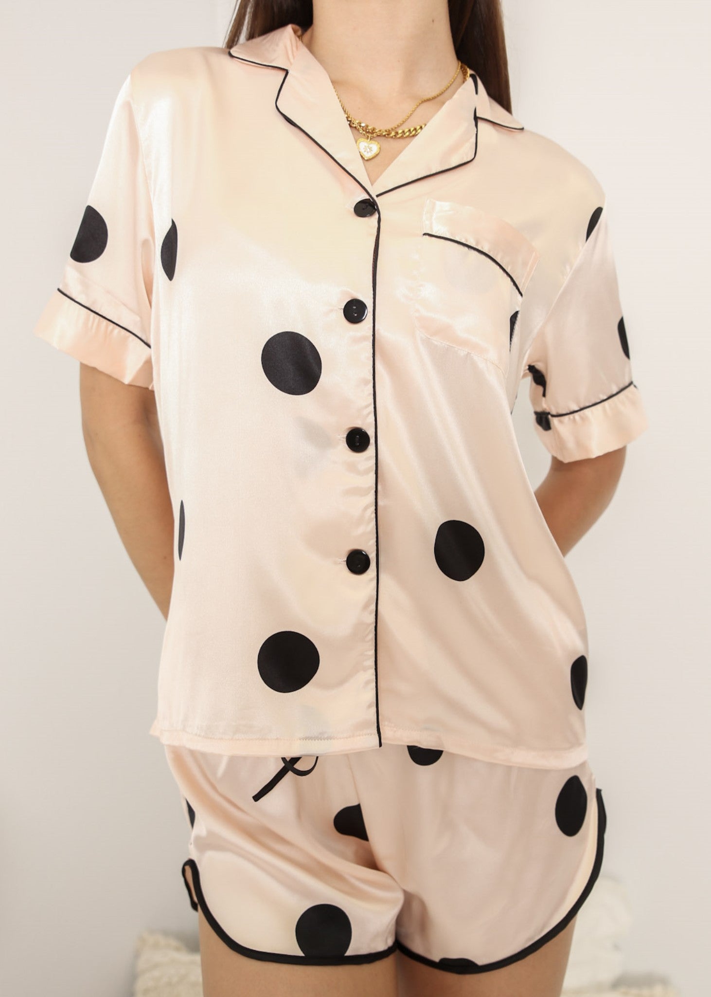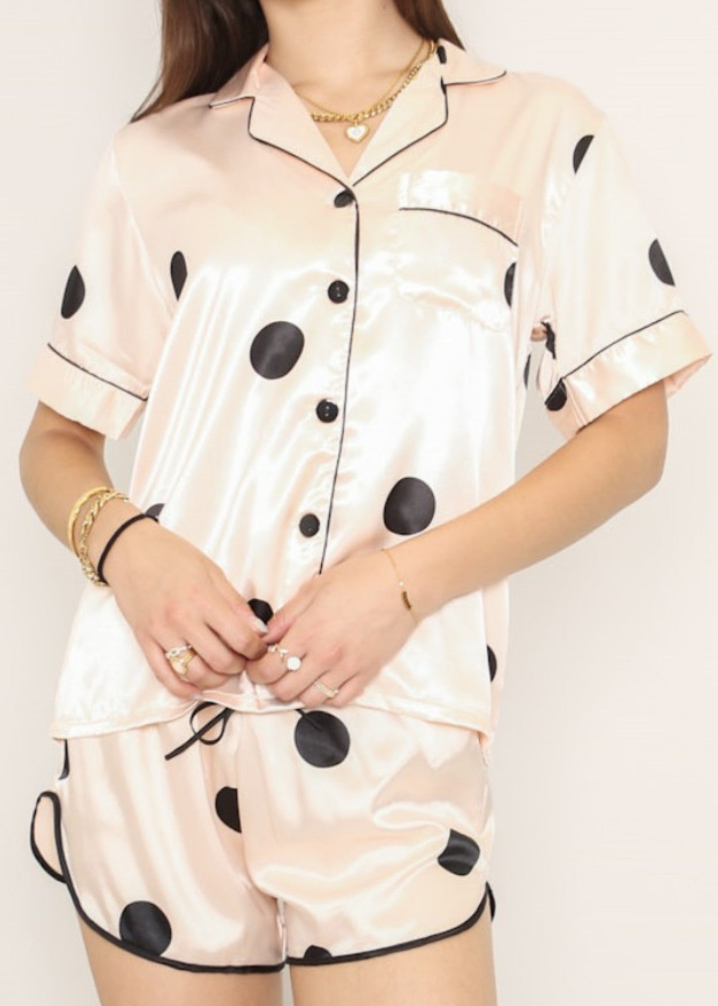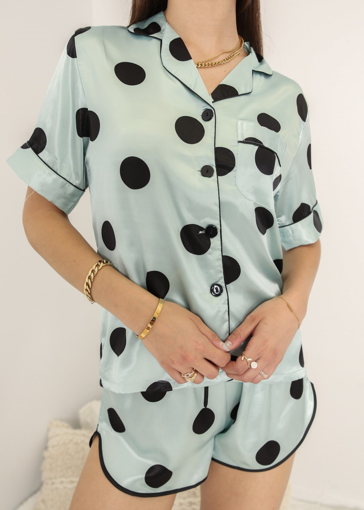 Anna-Kaci Lounge Women's Polka Dot Satin Pajama Set with Short Sleeve Button Top and Drawstring Shorts