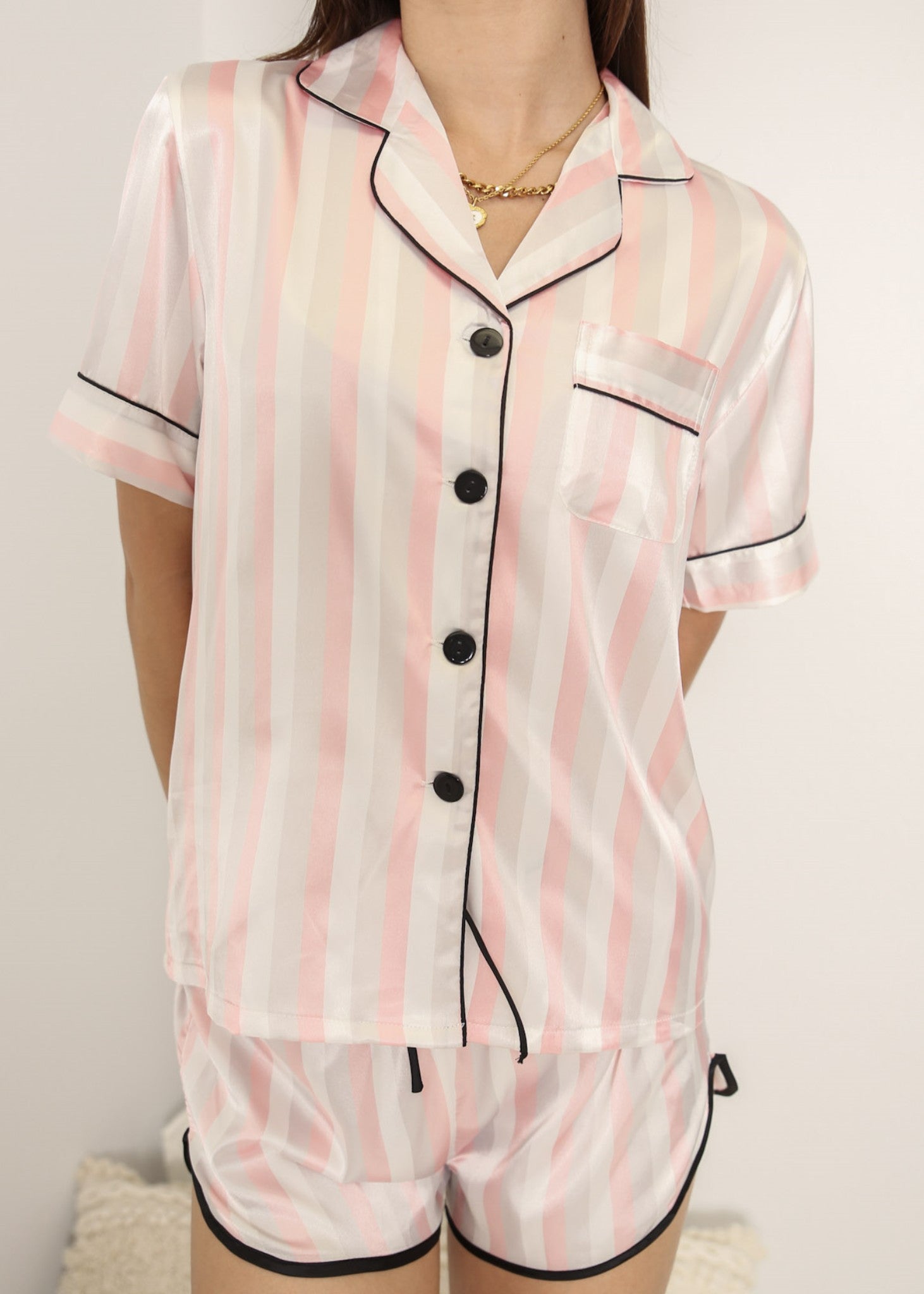 The Anna-Kaci Women's Polka Dot Satin Pajama Set combines playful style with luxurious comfort. Featuring a silky smooth satin fabric, this two-piece set includes a short sleeve button-up top with contrast piping and a classic notch collar. The matching drawstring shorts provide a relaxed fit with added ease of movement, while the bold polka dot pattern adds a chic and stylish touch. Perfectly blending comfort with fashion, this pajama set is designed to make your lounge and sleepwear wardrobe feel effortlessly elevated.