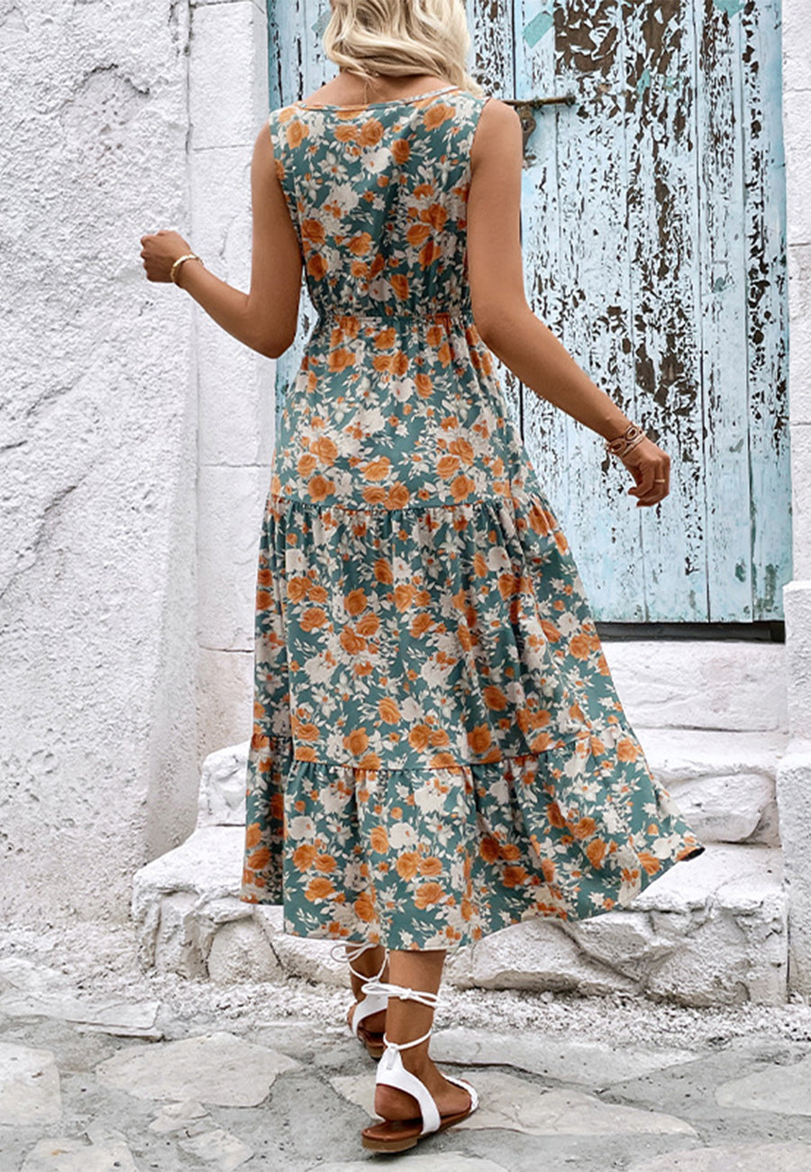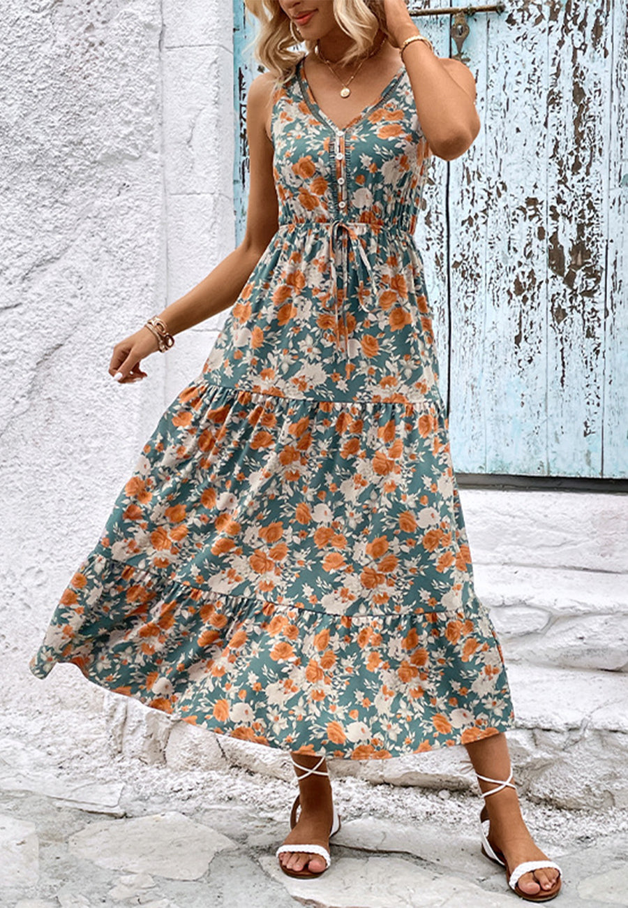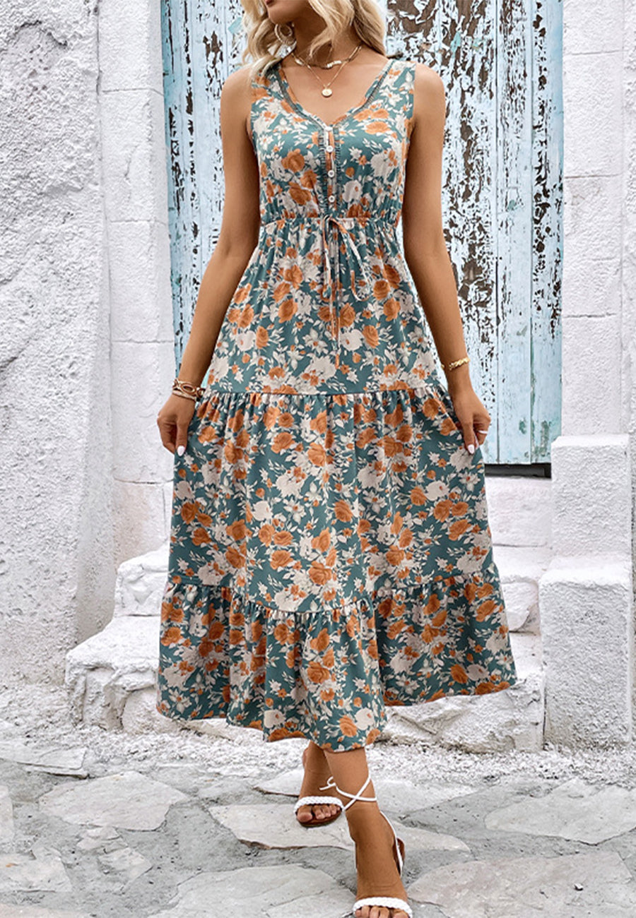 The Anna-Kaci dress is detailed with a lovely vintage floral print. Features a v neck line, sleeveless, tie waist detail, flowy skirt, button front design, tiered design, and above ankle length. Pair it with a straw bag and sandals for a chic look.
