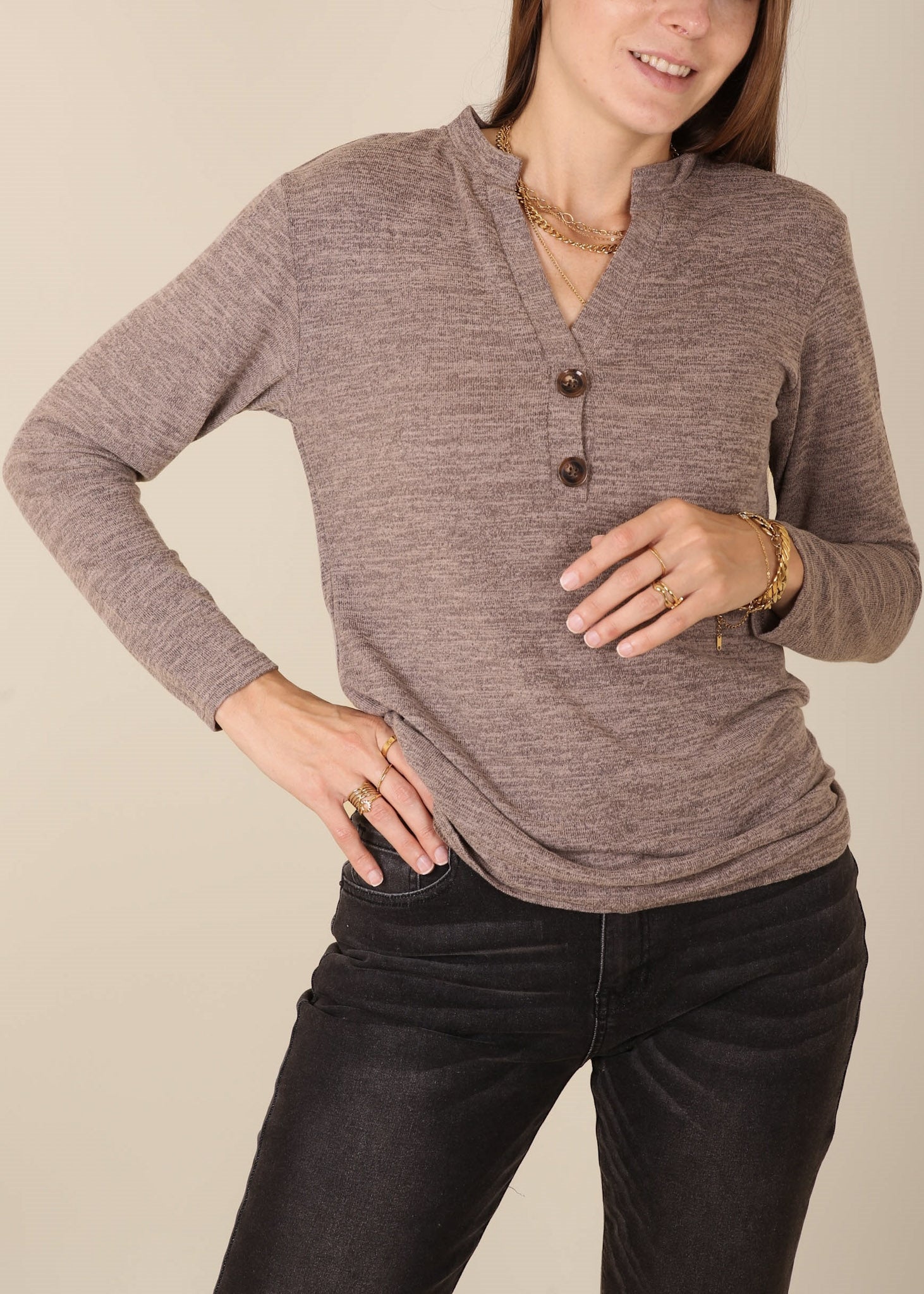The Anna-Kaci sweater is detailed with a classic button front. Features a split v neck line, long sleeves, and loose fit. Pair it with flared jeans and boots for a wonderful look.