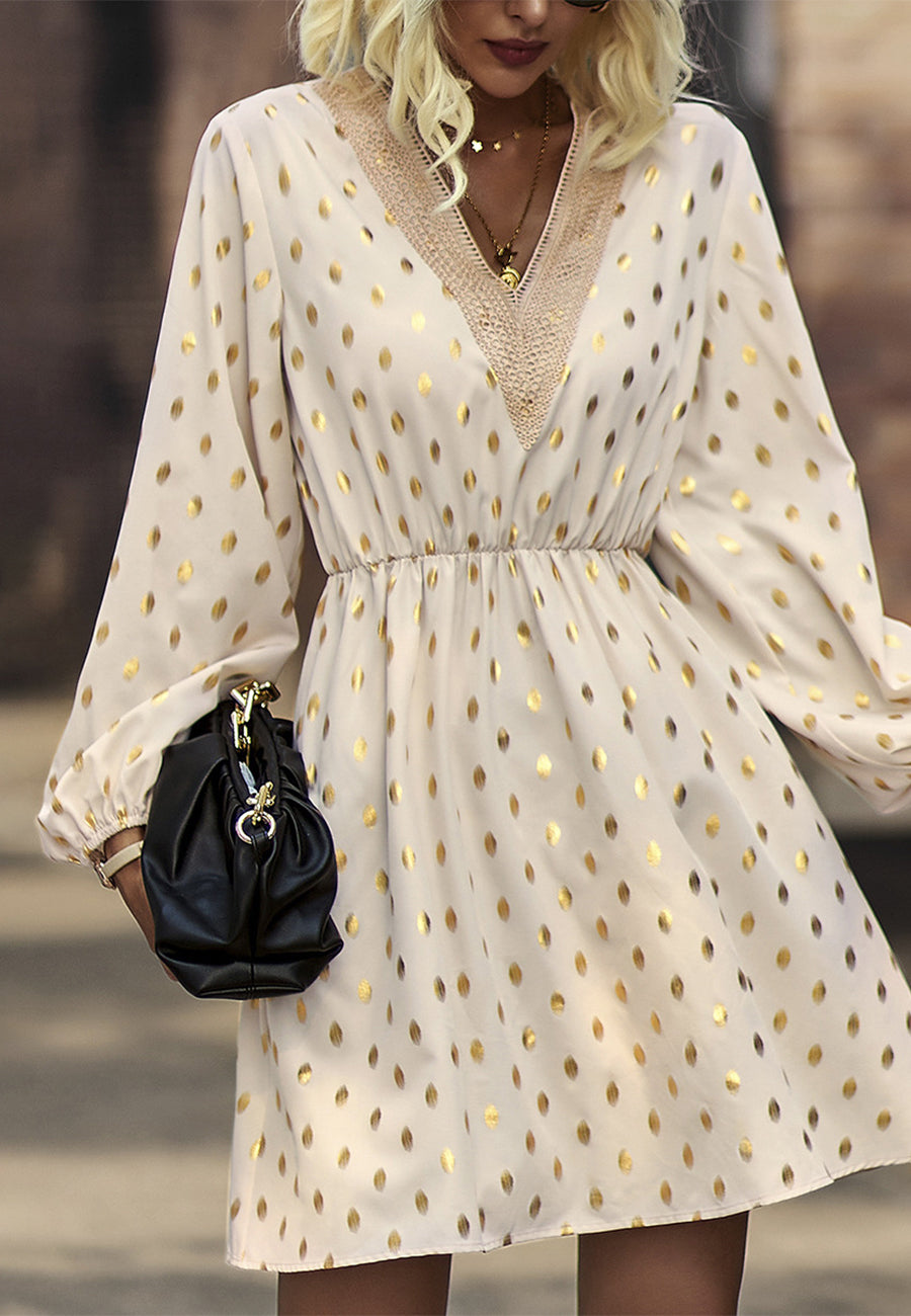 The Anna-Kaci dress is detailed with a beautiful spotted print. Features a v neck line, crochet detail, long sleeves, flowy skirt, and above knee length. Pair it with a shoulder bag and boots for a chic look.