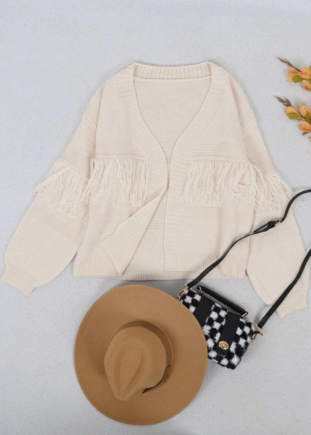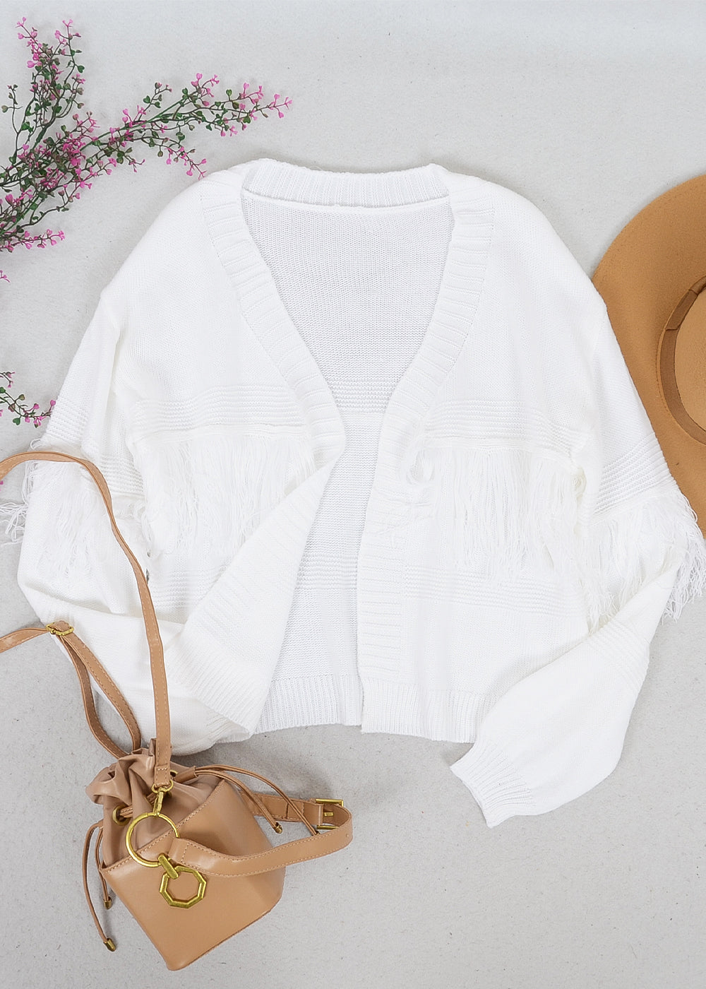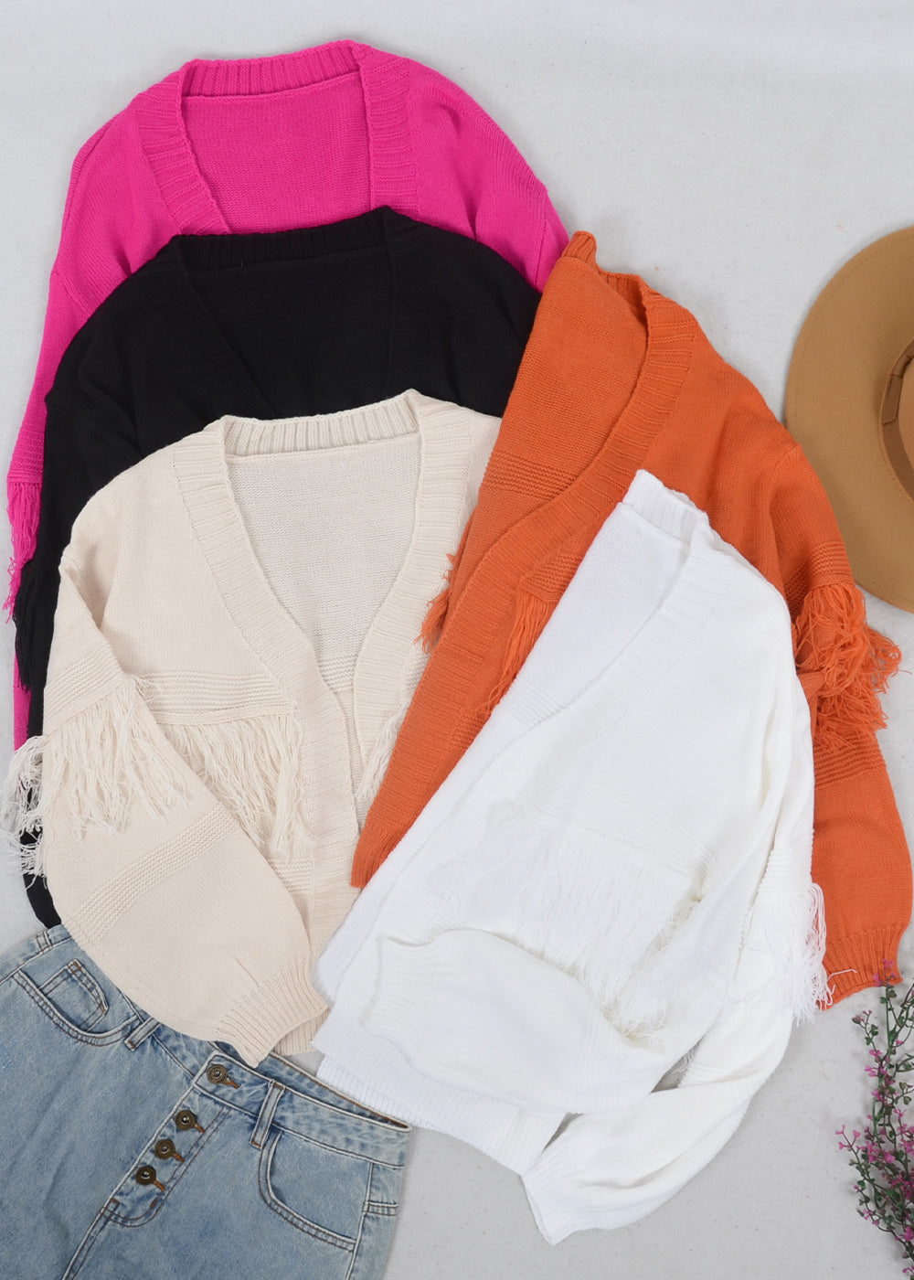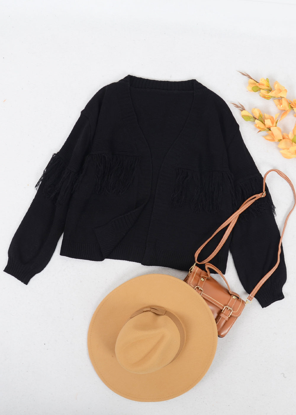??????The Anna-Kaci sweater cardigan is designed with a tassel design at the sleeves and center of the cardi. Features an open front, long sleeves, and relaxed drop shoulder fit. Pair with a top and denim for a chic look.