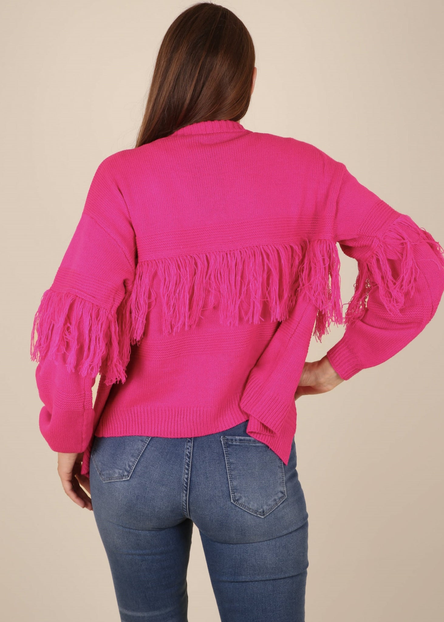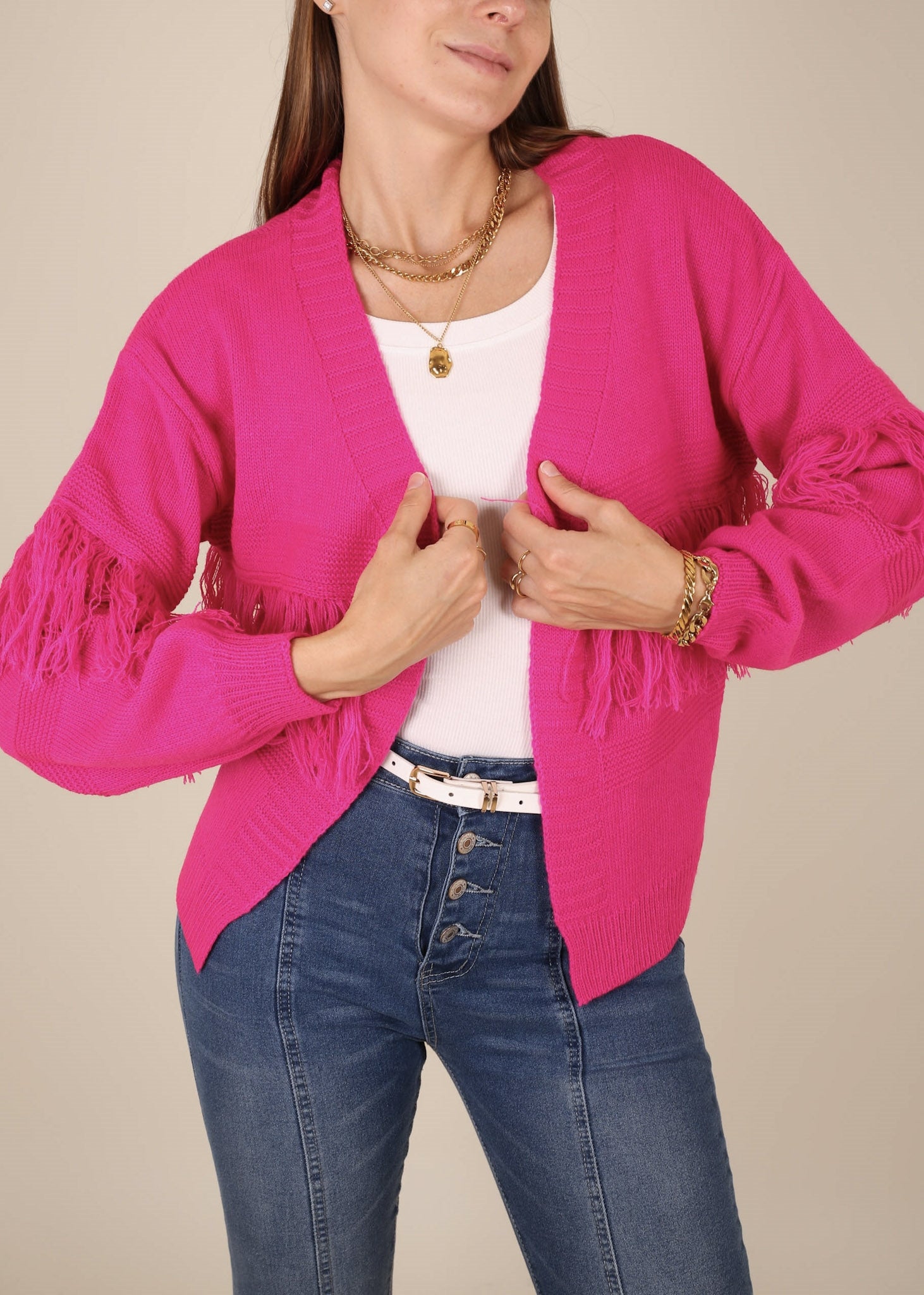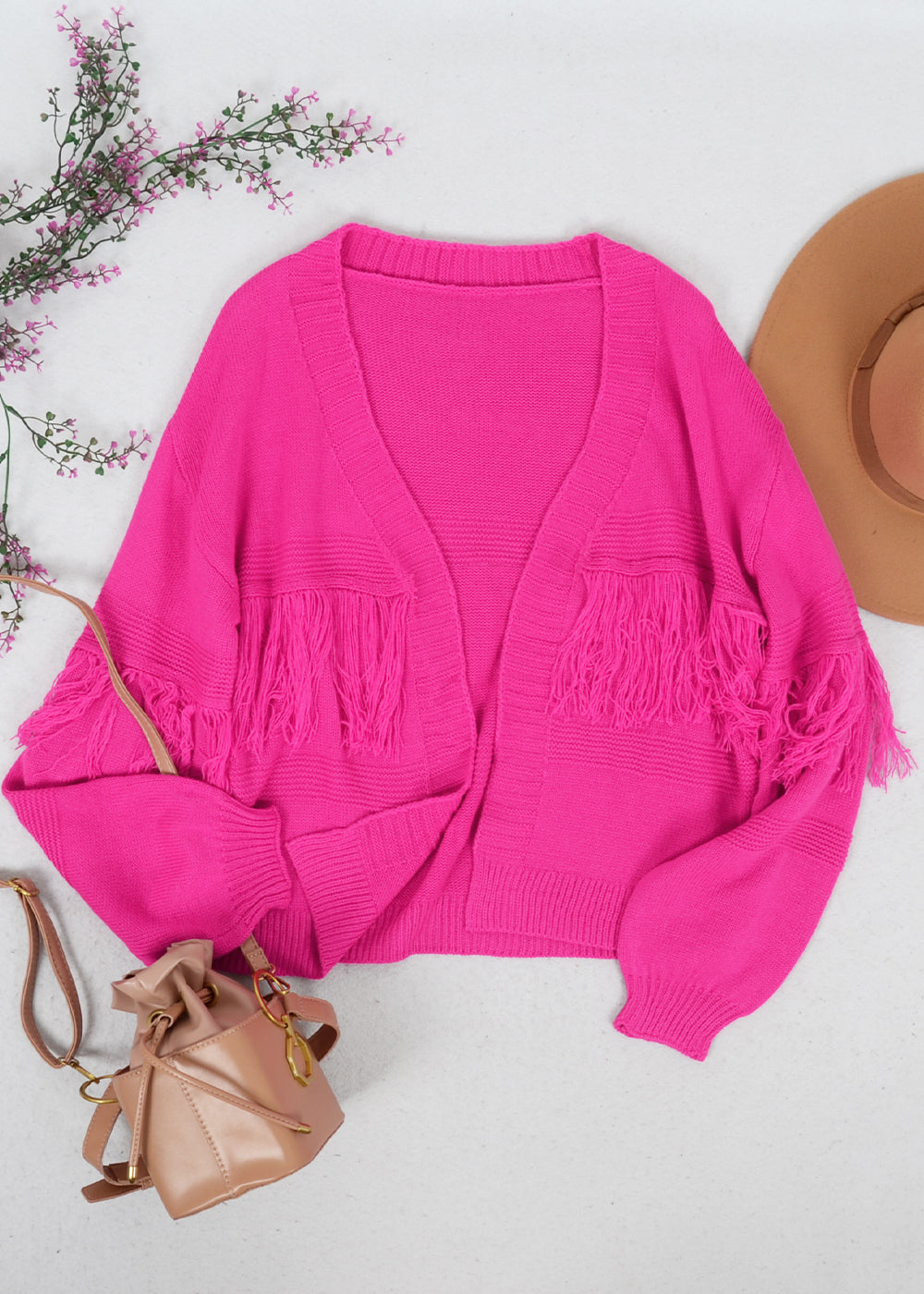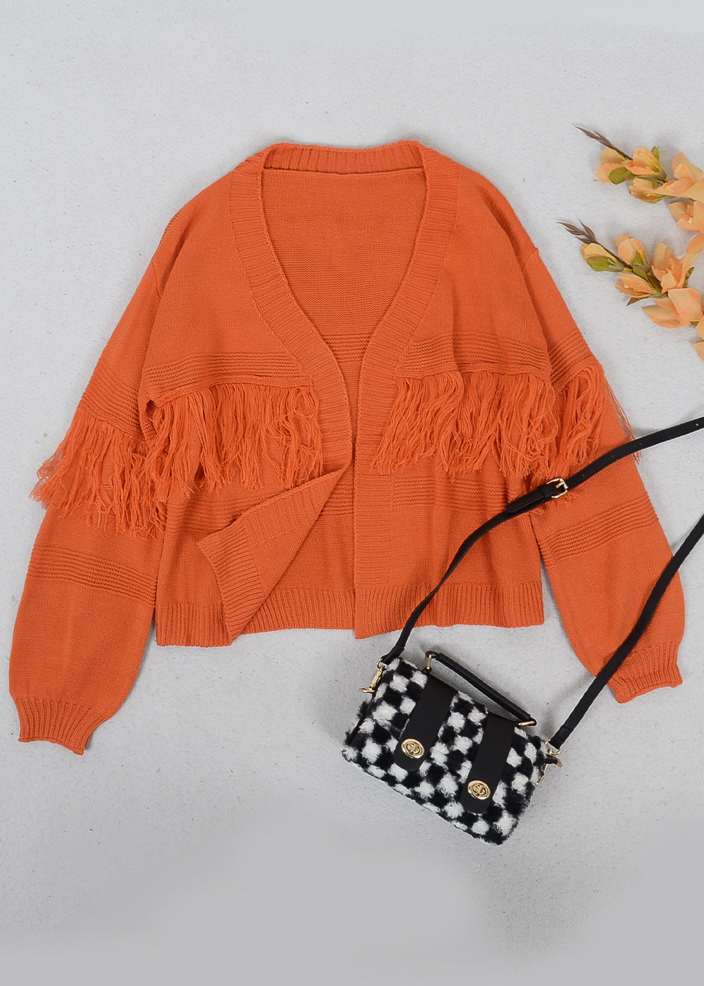 ??????The Anna-Kaci sweater cardigan is designed with a tassel design at the sleeves and center of the cardi. Features an open front, long sleeves, and relaxed drop shoulder fit. Pair with a top and denim for a chic look.
