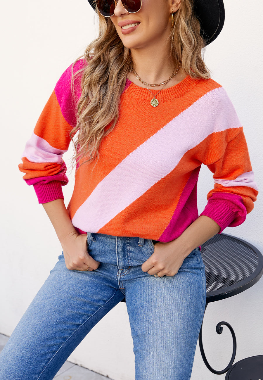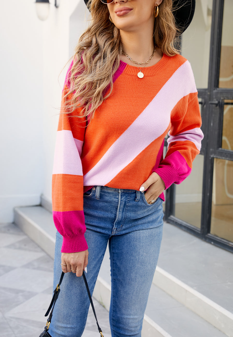 The Anna-Kaci sweater features a unique cross stripe color block pattern. Designed with long sleeves that continue the color block pattern, a round neck long, regular fit, and cozy knit texture. Pair with denim for a cute and fun look.