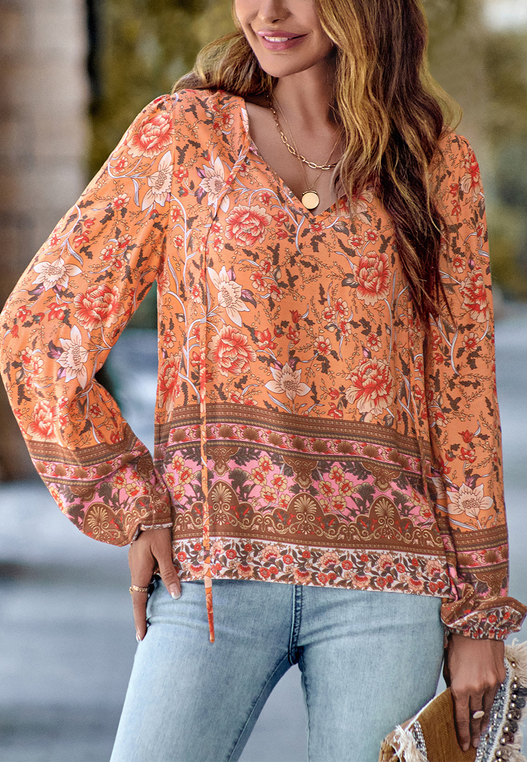 The blouse is detailed with a gorgeous multicolor floral print. Features a tie neck detail, long sleeves, and flowy fit. Pair it with jeans and sandals for a stunning look.