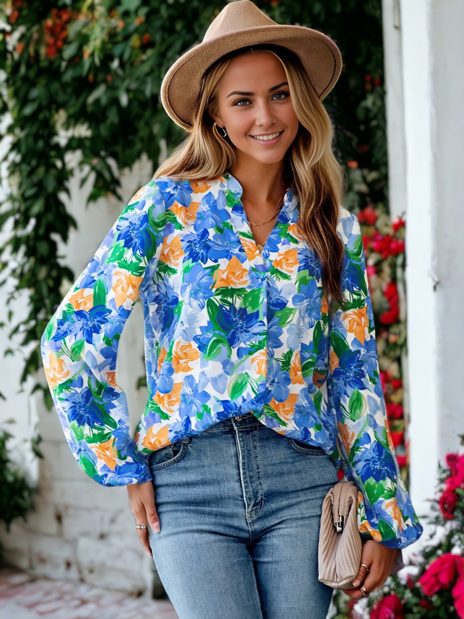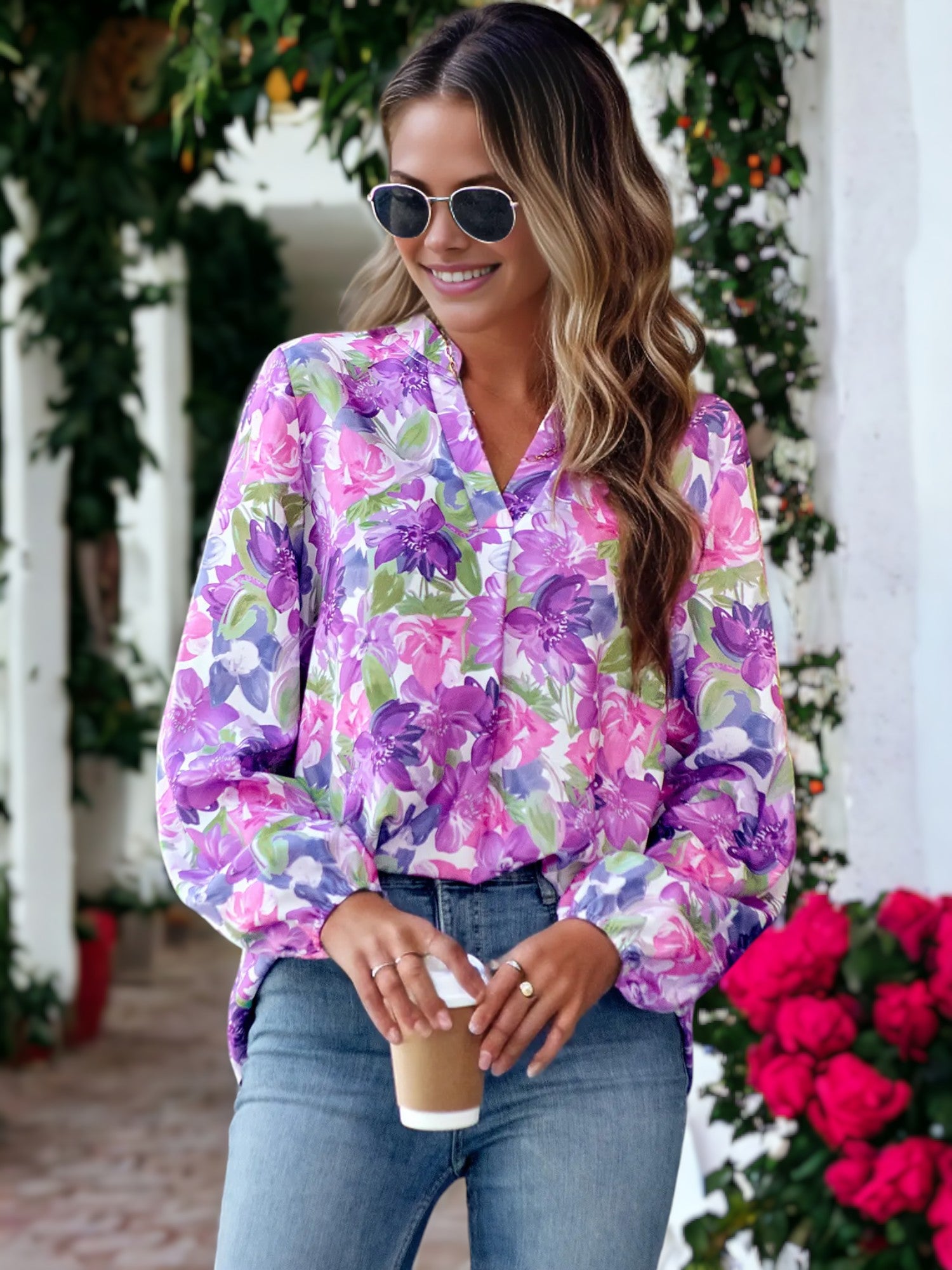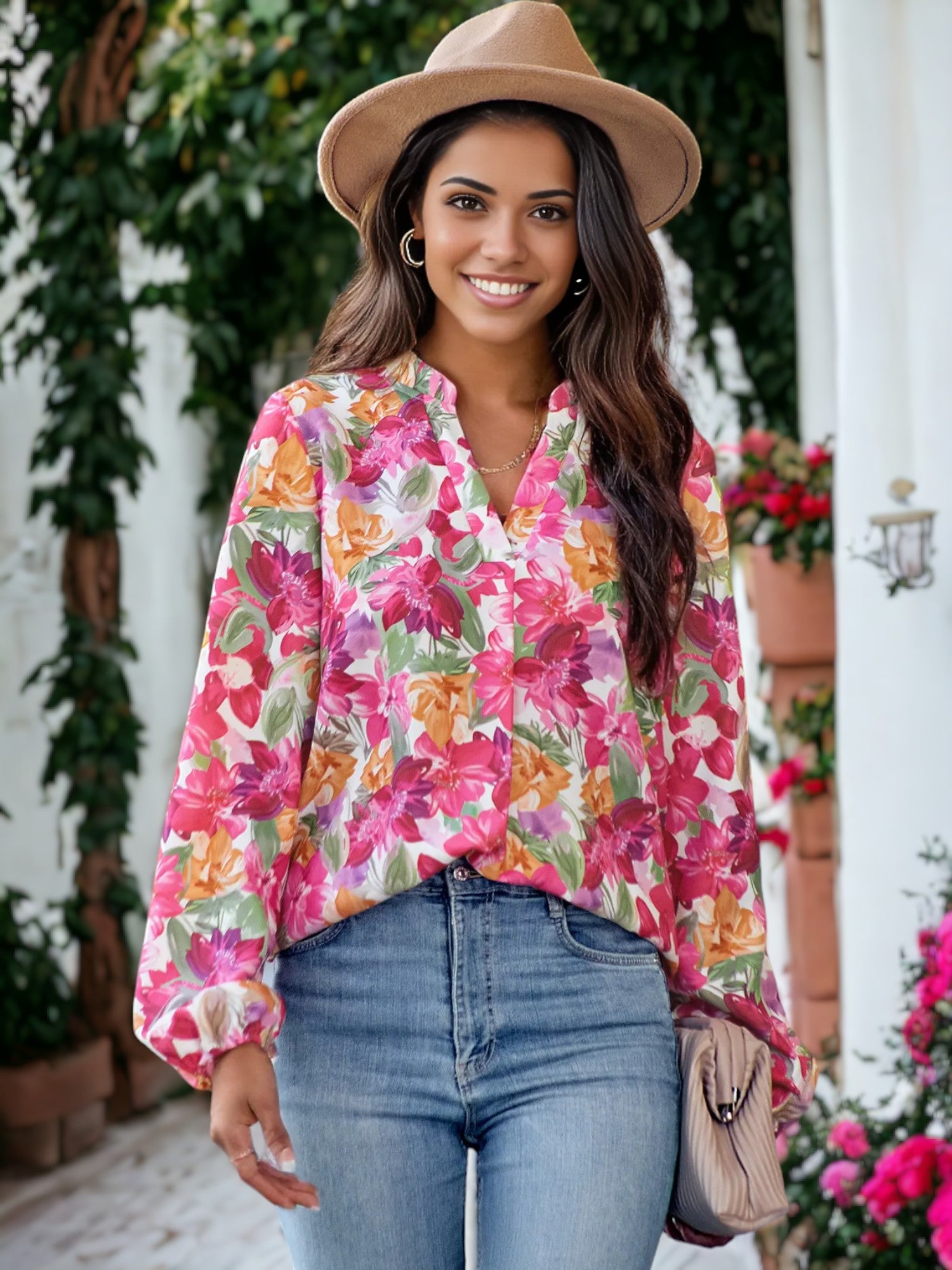 The blouse is detailed with a gorgeous multicolor floral print. Features a split v neck line, long sleeves, and loose fit. Pair it with trousers and heels for a wonderful look.