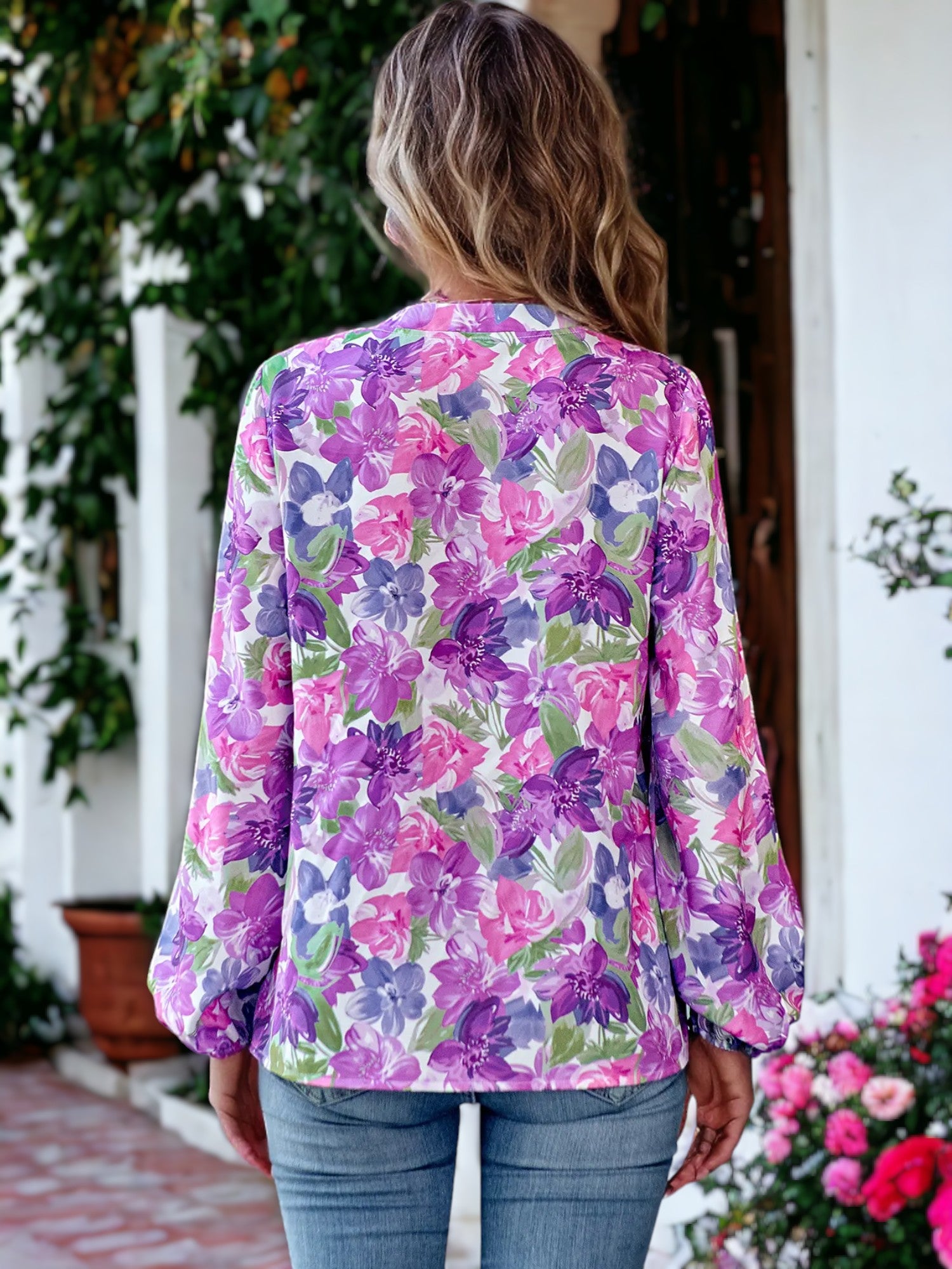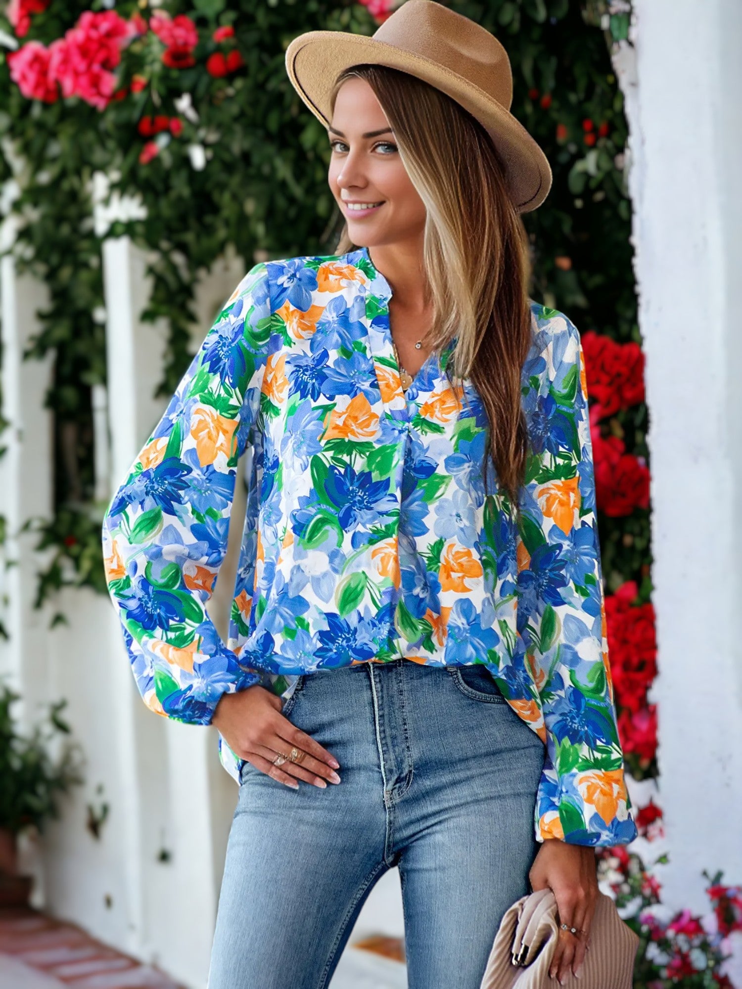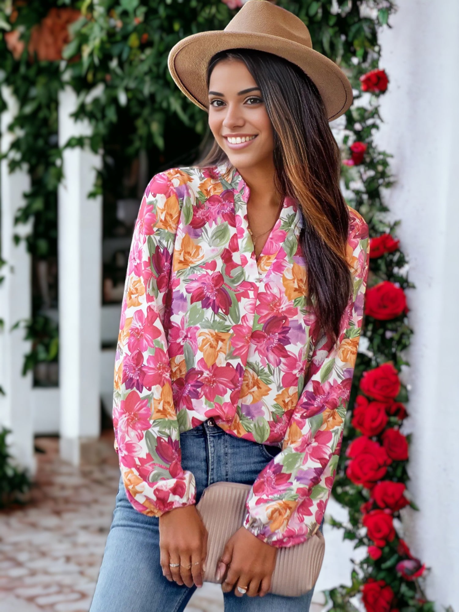 The blouse is detailed with a gorgeous multicolor floral print. Features a split v neck line, long sleeves, and loose fit. Pair it with trousers and heels for a wonderful look.