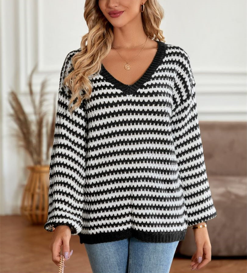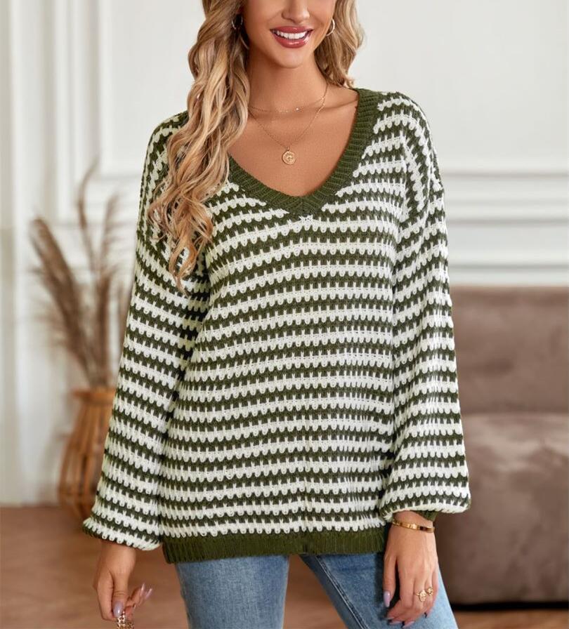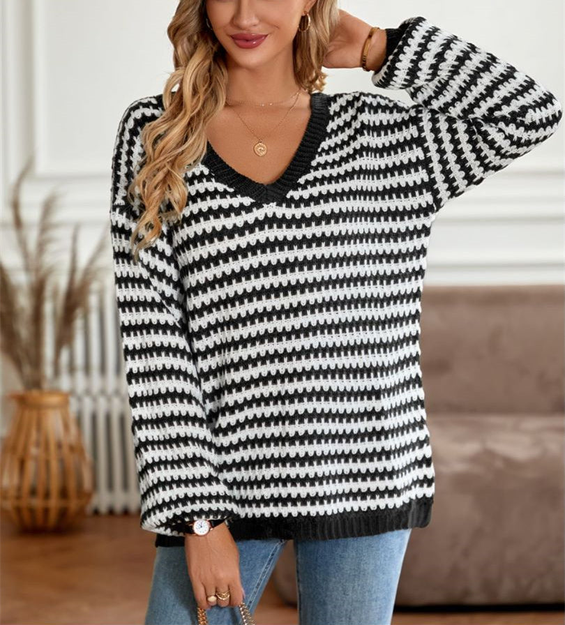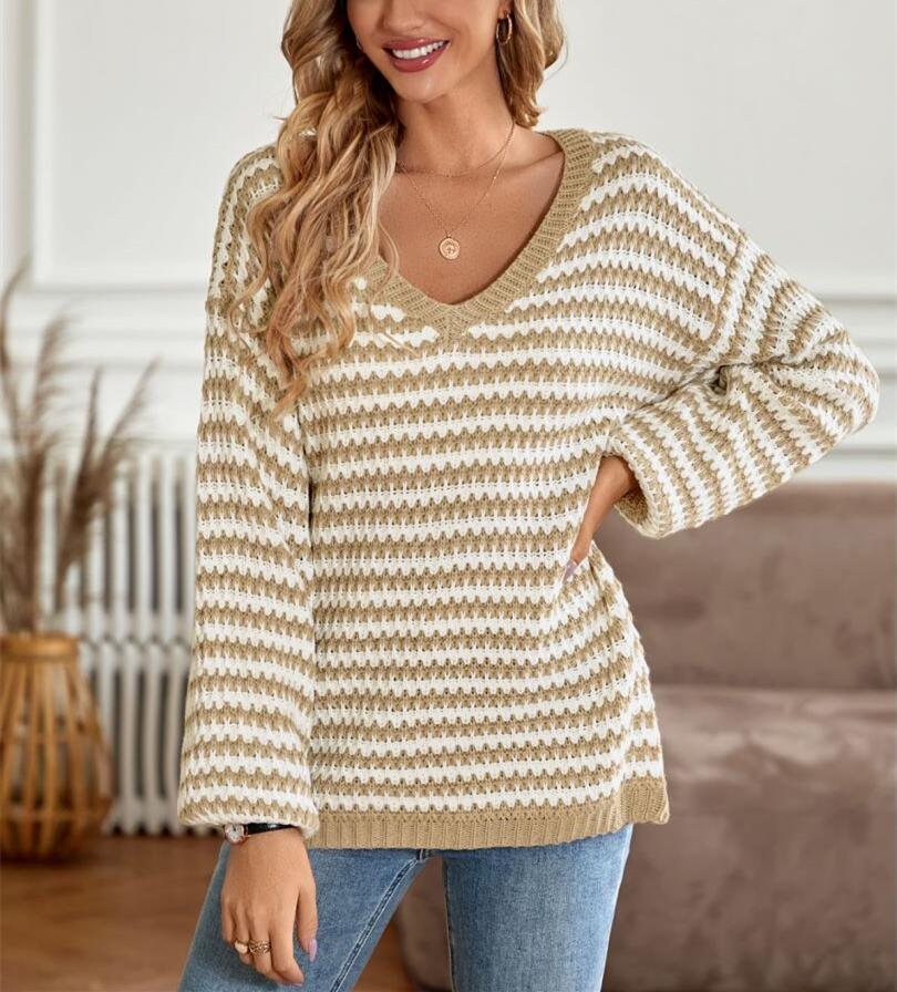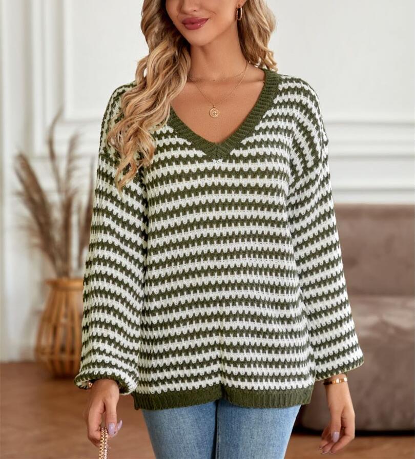 The sweater is detailed with a cool geometric striped pattern. Features a v neck line, drop shoulder, knit material, long sleeves, and loose fit. Pair it with jeans and boots for a classic look.