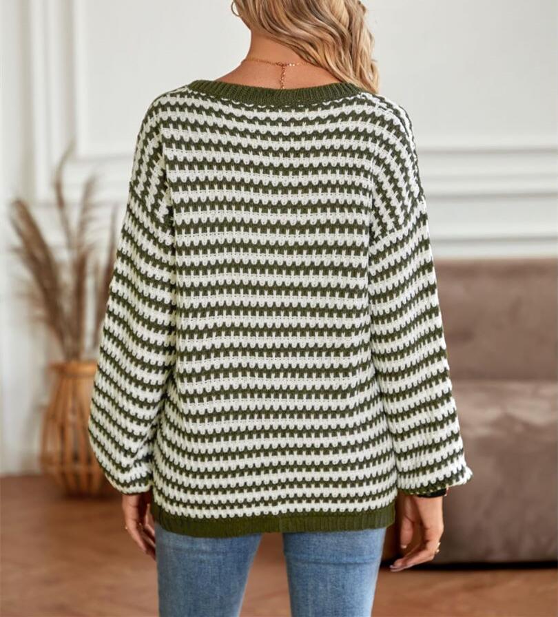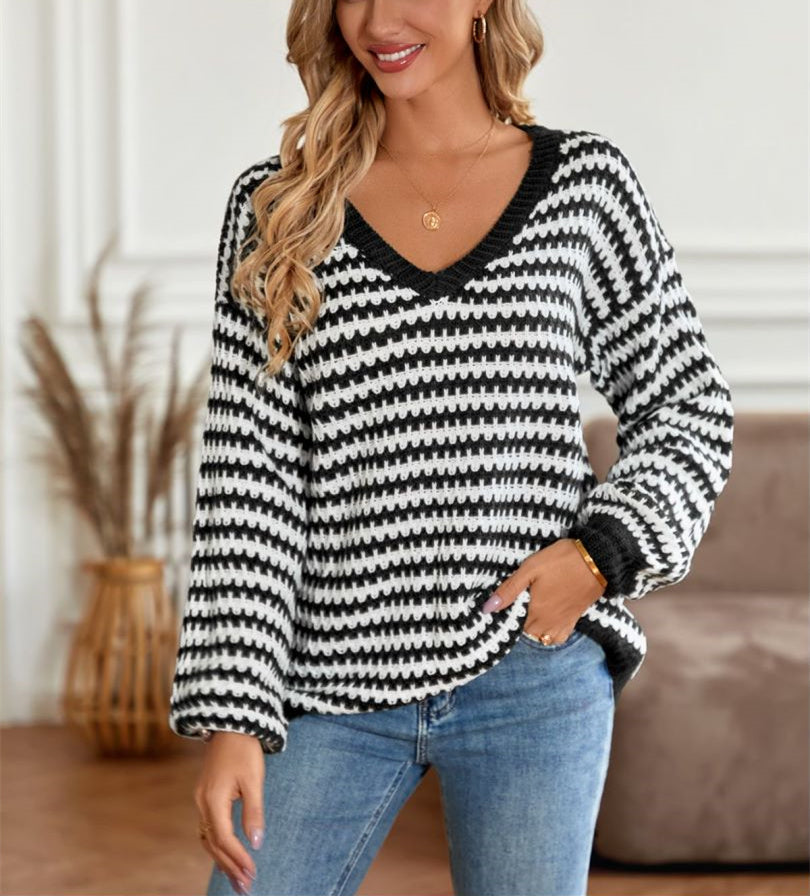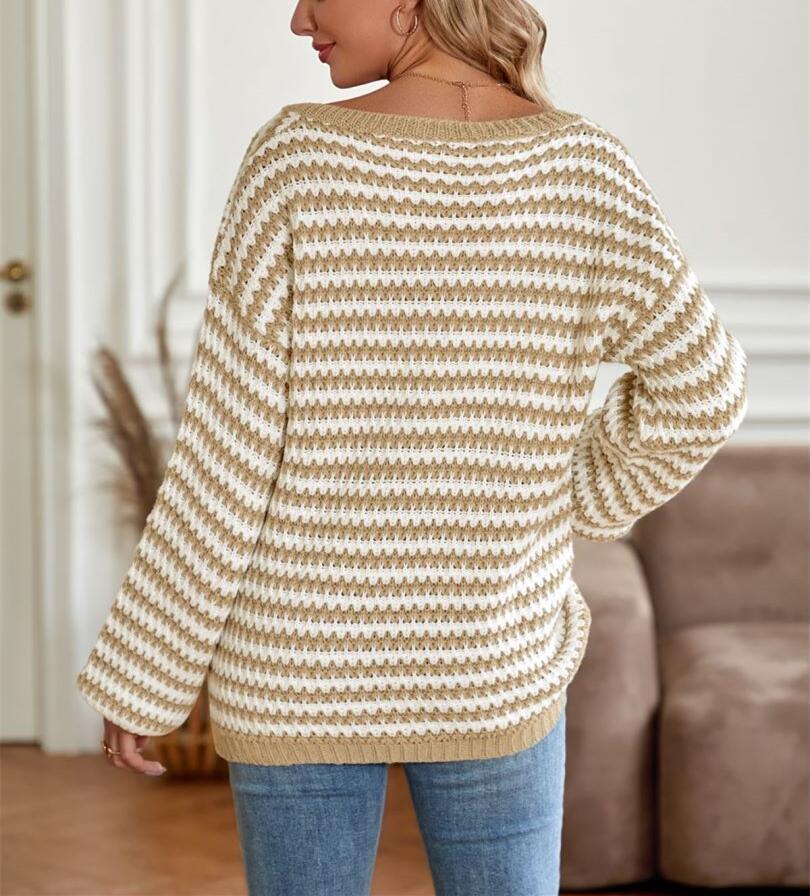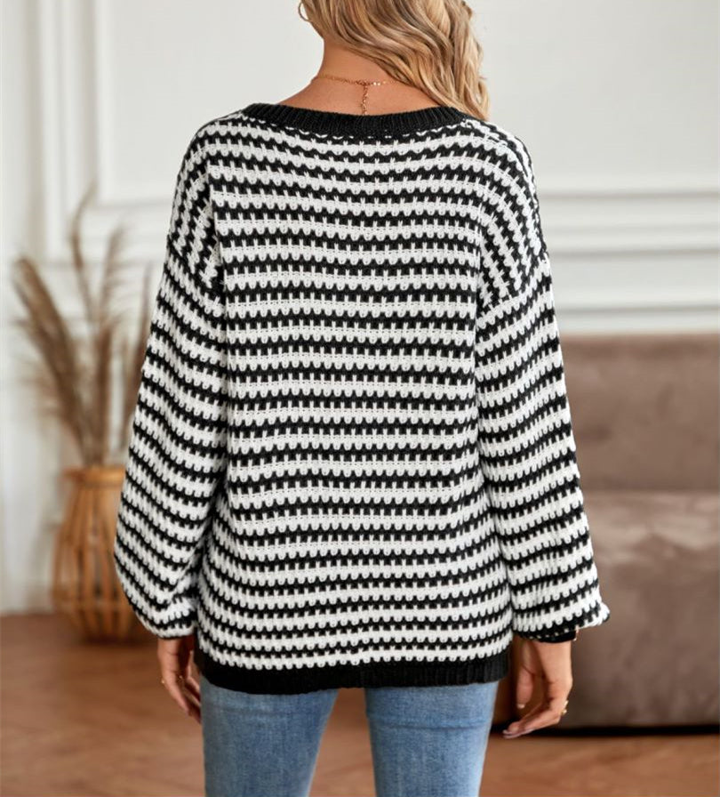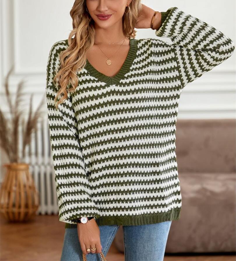 The sweater is detailed with a cool geometric striped pattern. Features a v neck line, drop shoulder, knit material, long sleeves, and loose fit. Pair it with jeans and boots for a classic look.