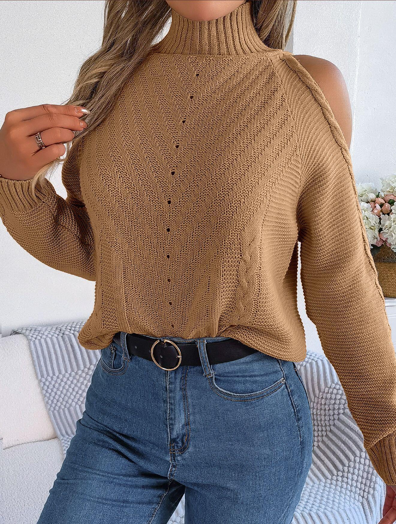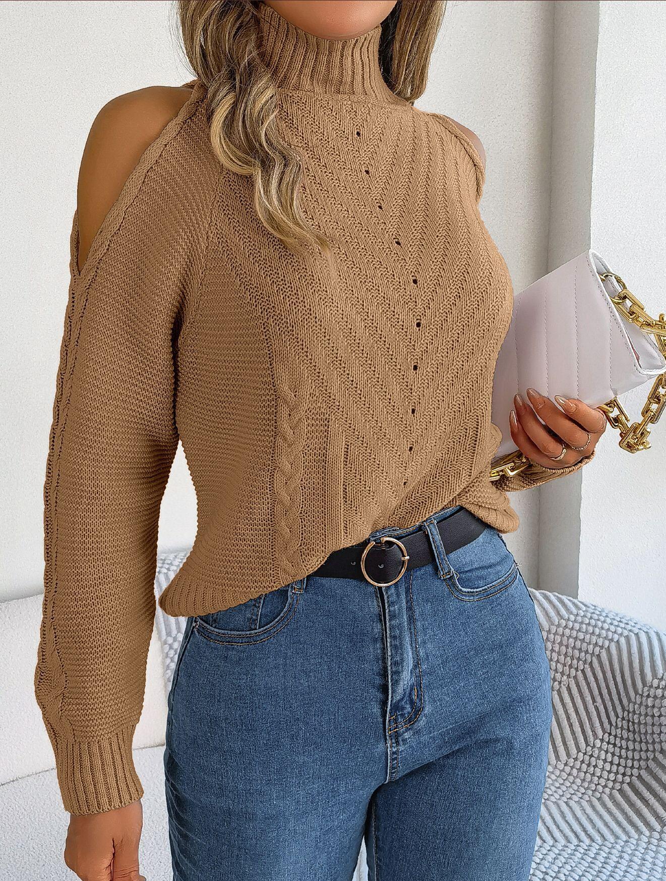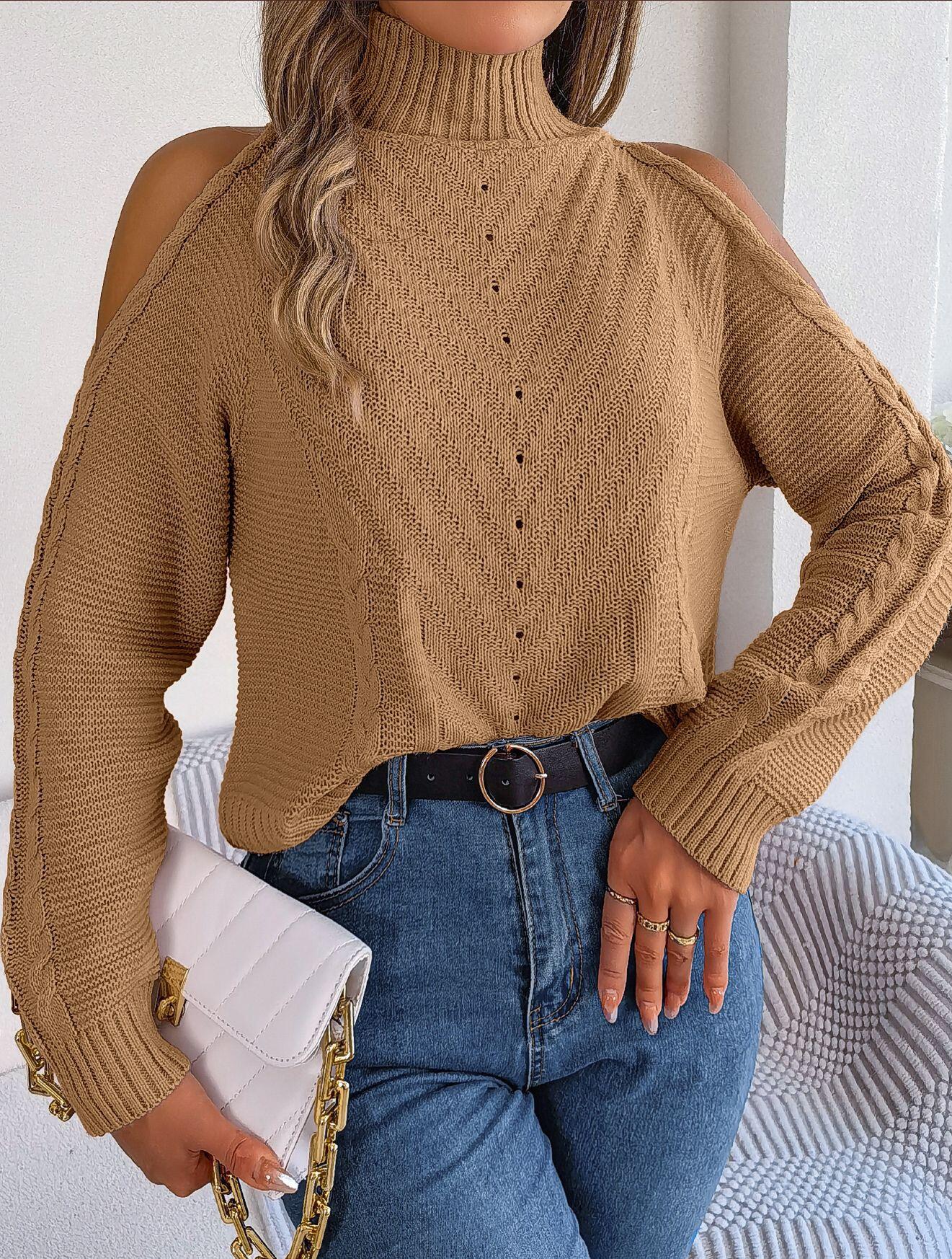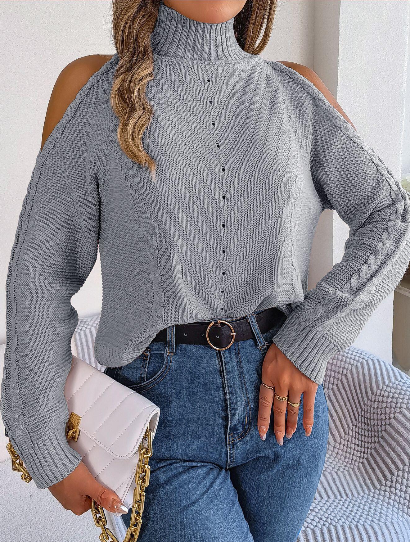 The sweater is detailed with a flirty cold shoulder. Features turtleneck, braided knit design, long sleeves, and regular fit. Pair it with jeans and boots for a cute look.