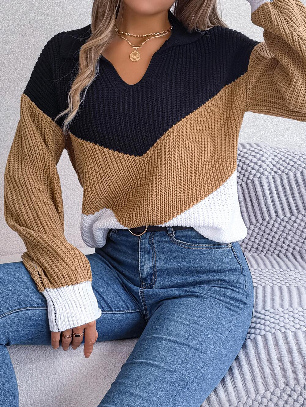 The sweater is detailed with a fantastic chevron striped color block design. Features a collar, knit material, drop shoulder, long sleeves, and loose fit. Pair it with jeans and sneakers for a laidback look.