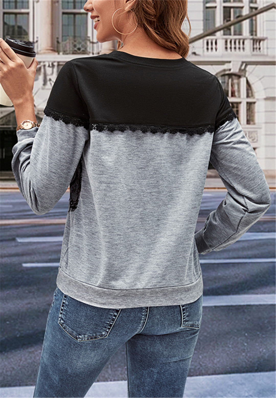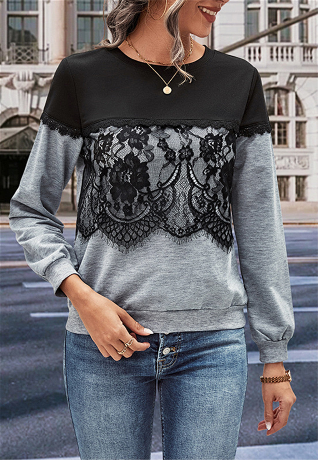 The sweater is detailed with a stunning lace trim. Features a round neck line, two tone design, long sleeves, and regular fit. Pair it with leather pants and boots for a juxtaposing look.