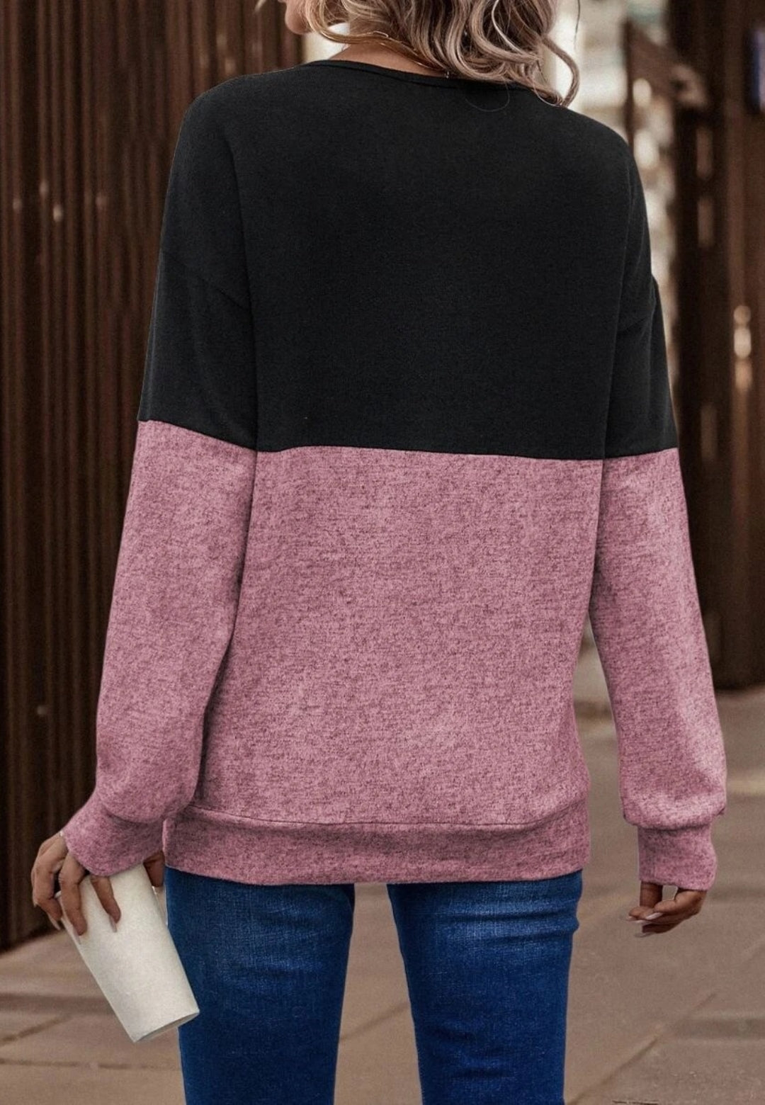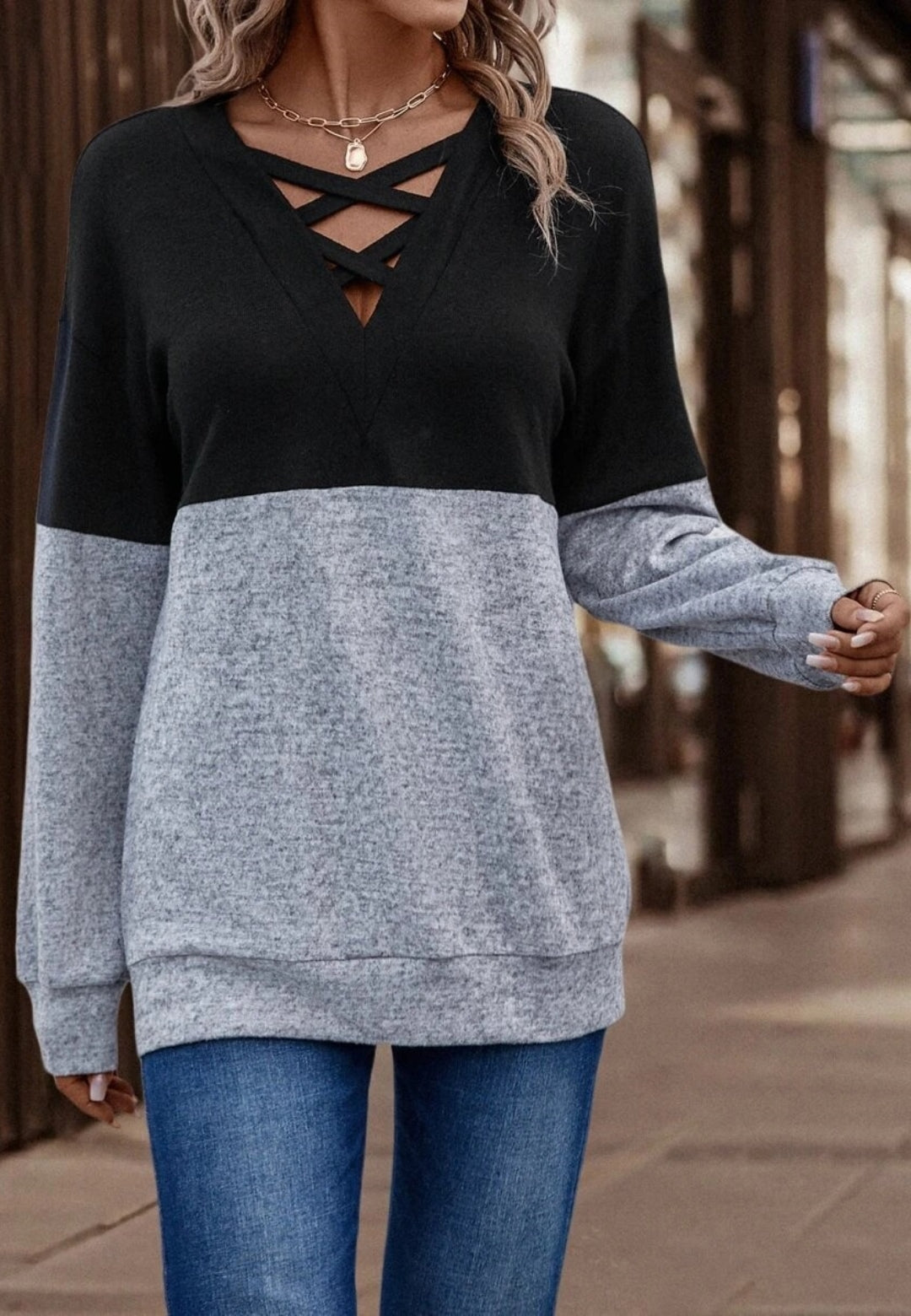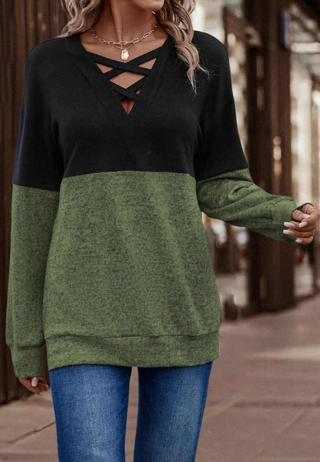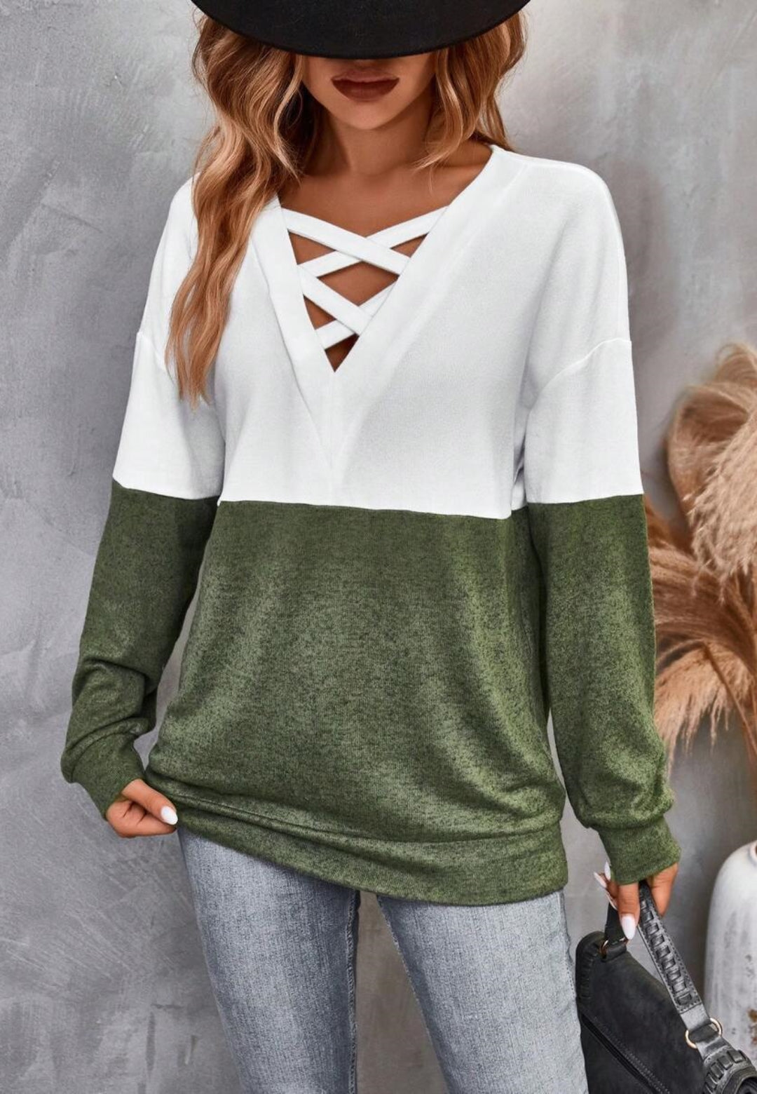 The sweater is detailed with a sexy criss cross front. Features a v neck line, color block design, drop shoulder, long sleeves, and loose fit. Pair it with jeans and sneakers for a comfy look.