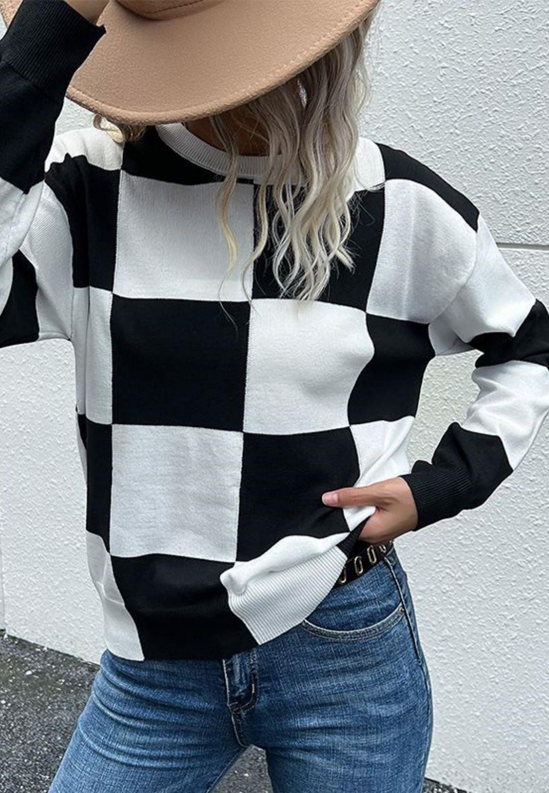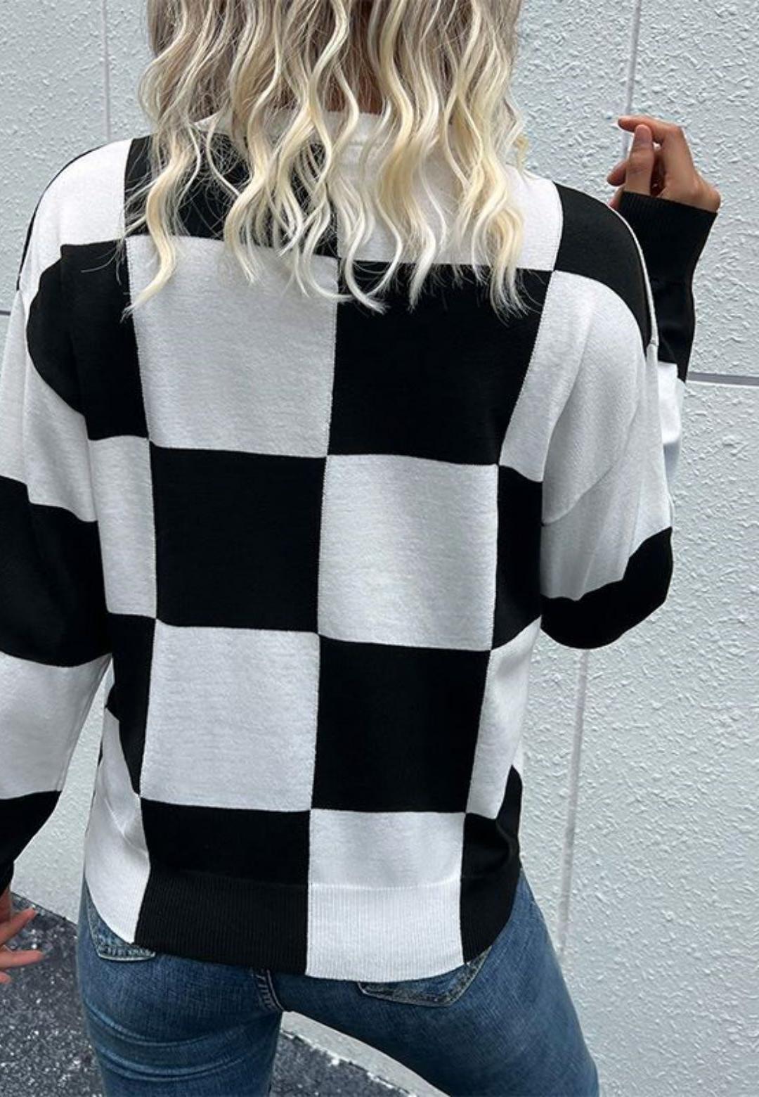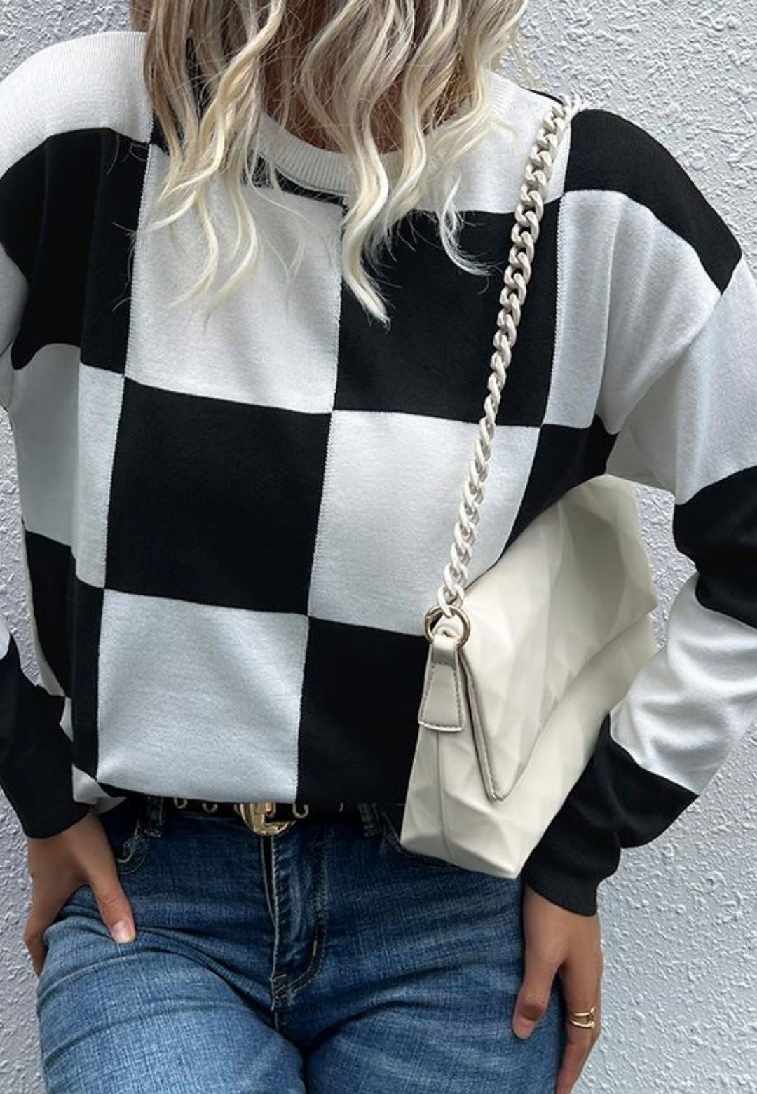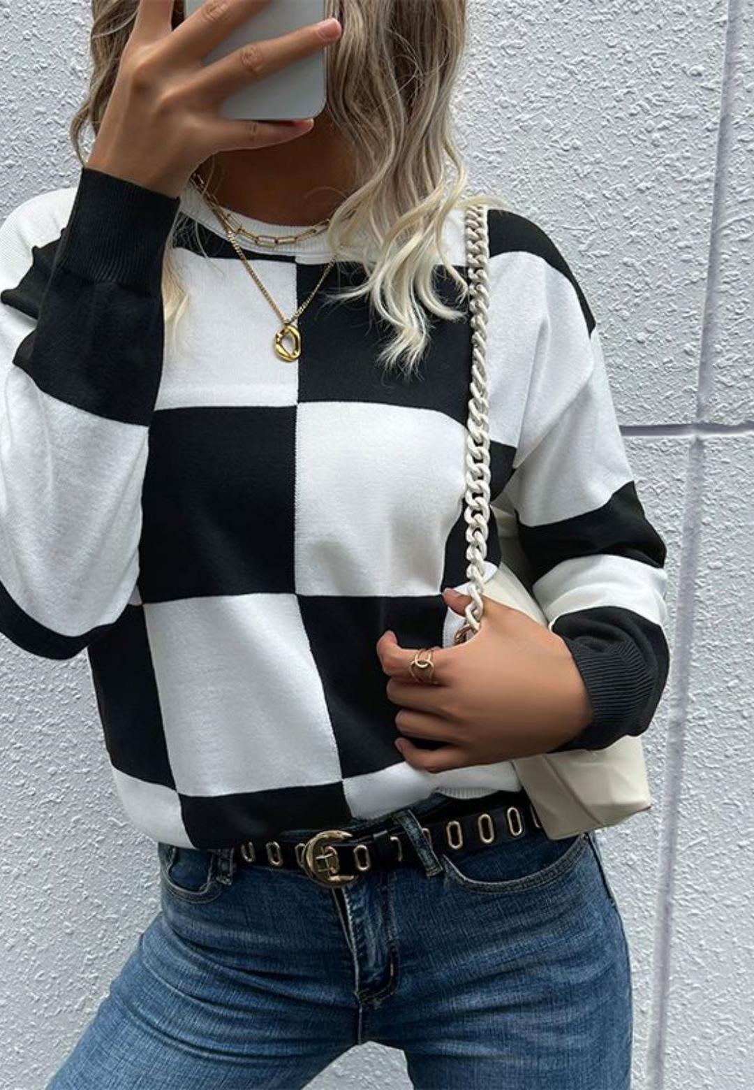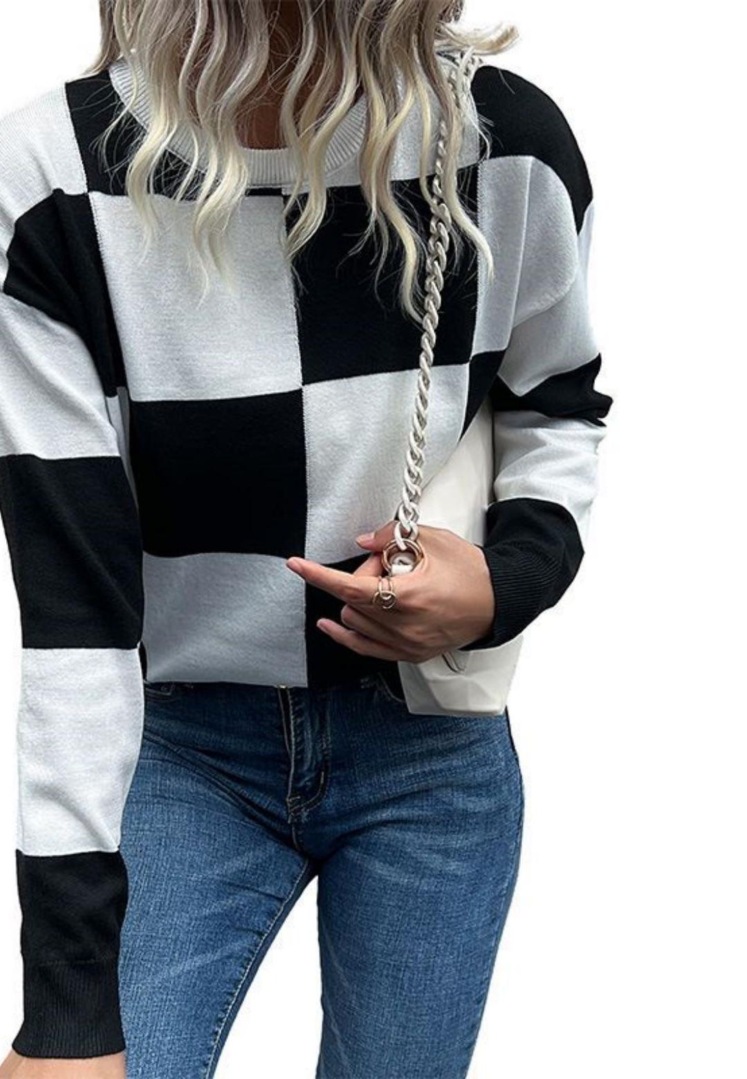 Stay cozy and stylish in the Checker Pattern Drop Shoulder Pullover Sweater. This sweater combines comfort with a trendy design, making it a must-have for your wardrobe. The checker pattern adds a touch of retro charm, while the drop shoulder design enhances the relaxed fit. With its long sleeves and warm fabric, it's perfect for chilly days. You can easily pair it with jeans or leggings for a casual, fashionable look. Whether you're running errands or meeting friends, this pullover sweater ensures you stay both comfortable and chic. Elevate your winter style with this classic and versatile piece.