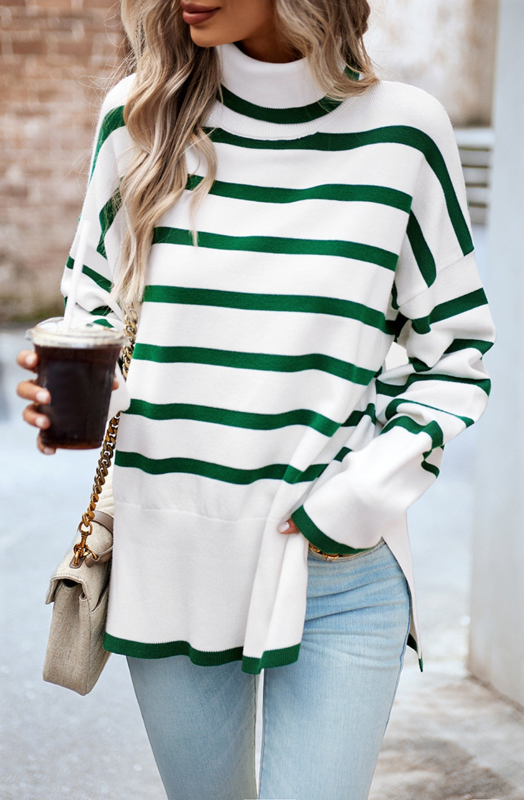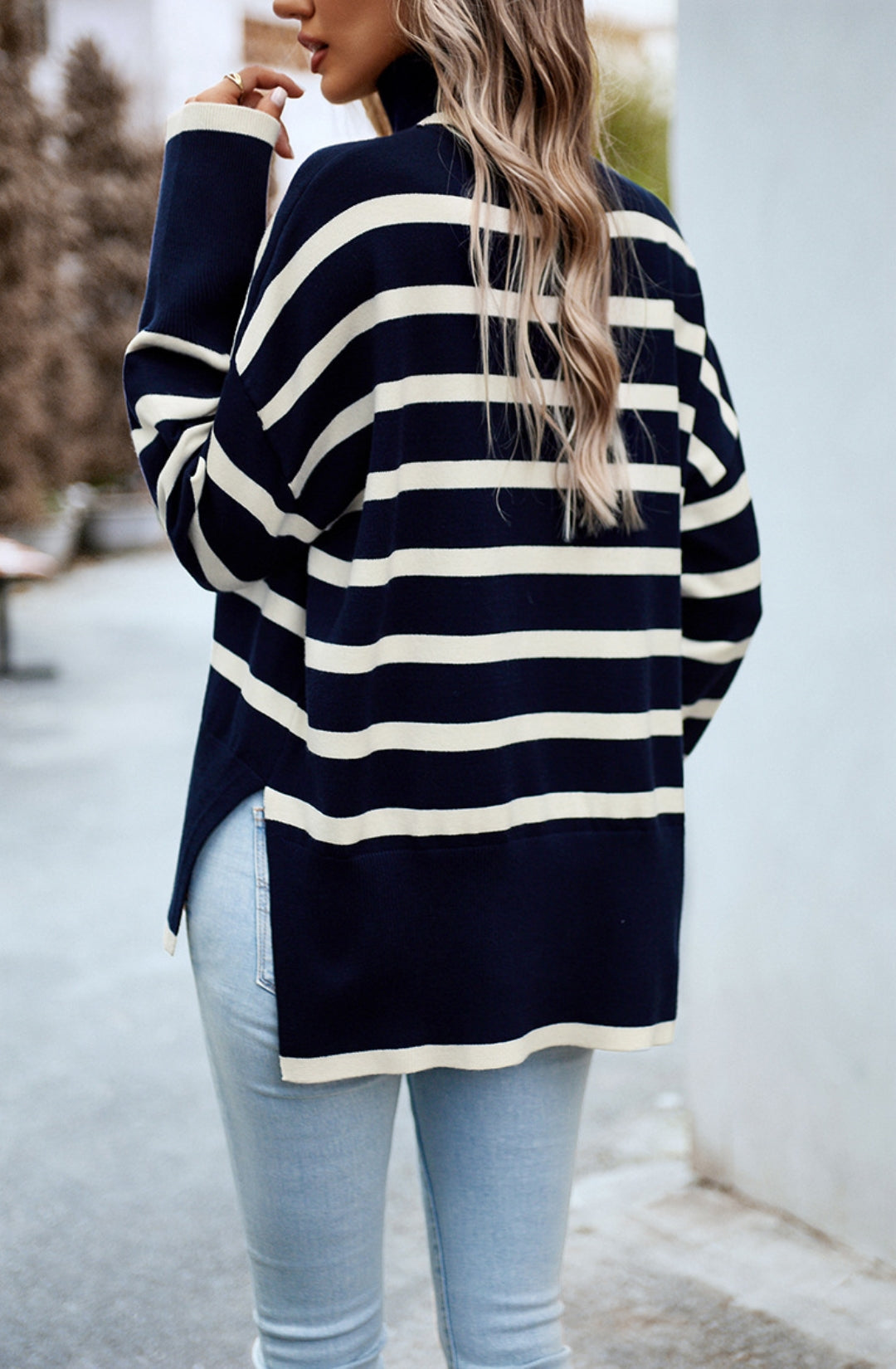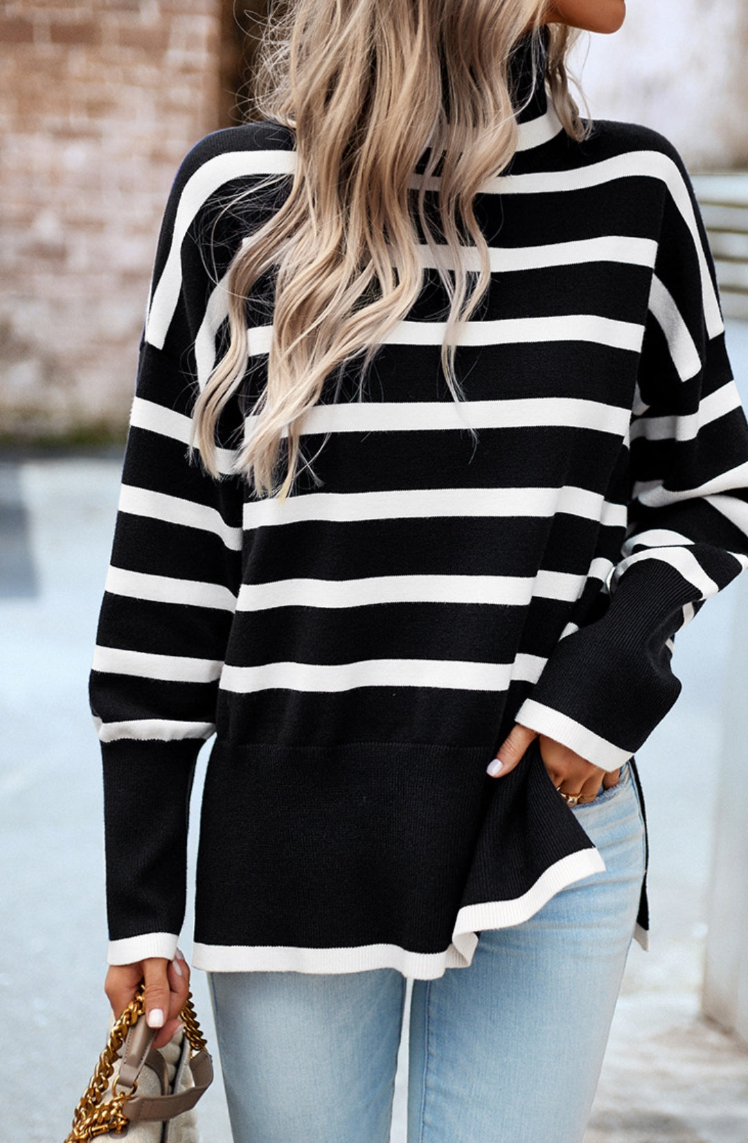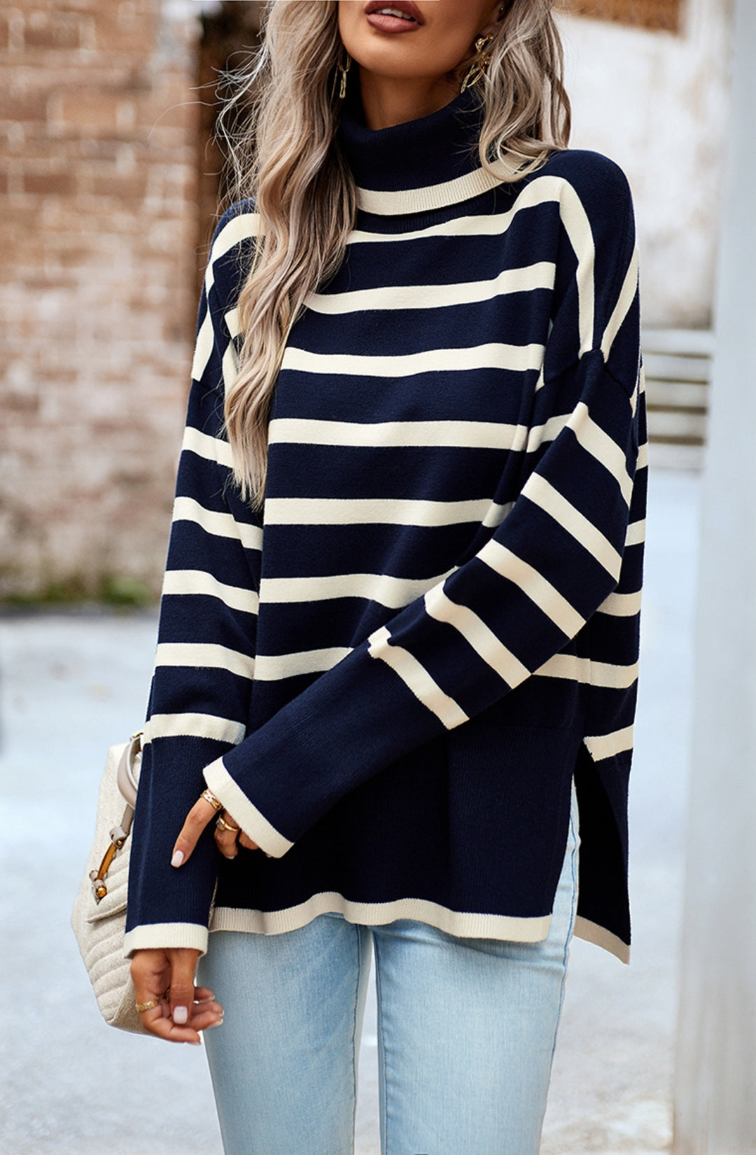 The sweater is detailed with a cool turtleneck. Features a striped pattern, drop shoulder, long sleeves, side slits, and loose fit. Pair it with jeans and sneakers for a cozy look.