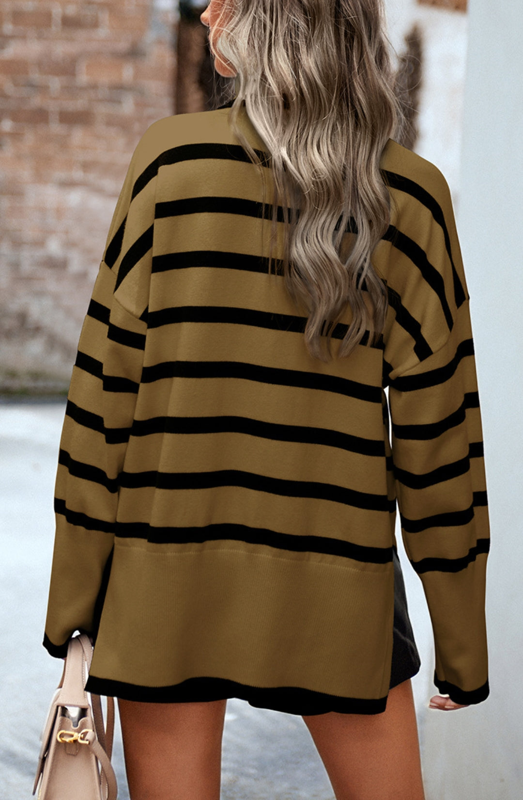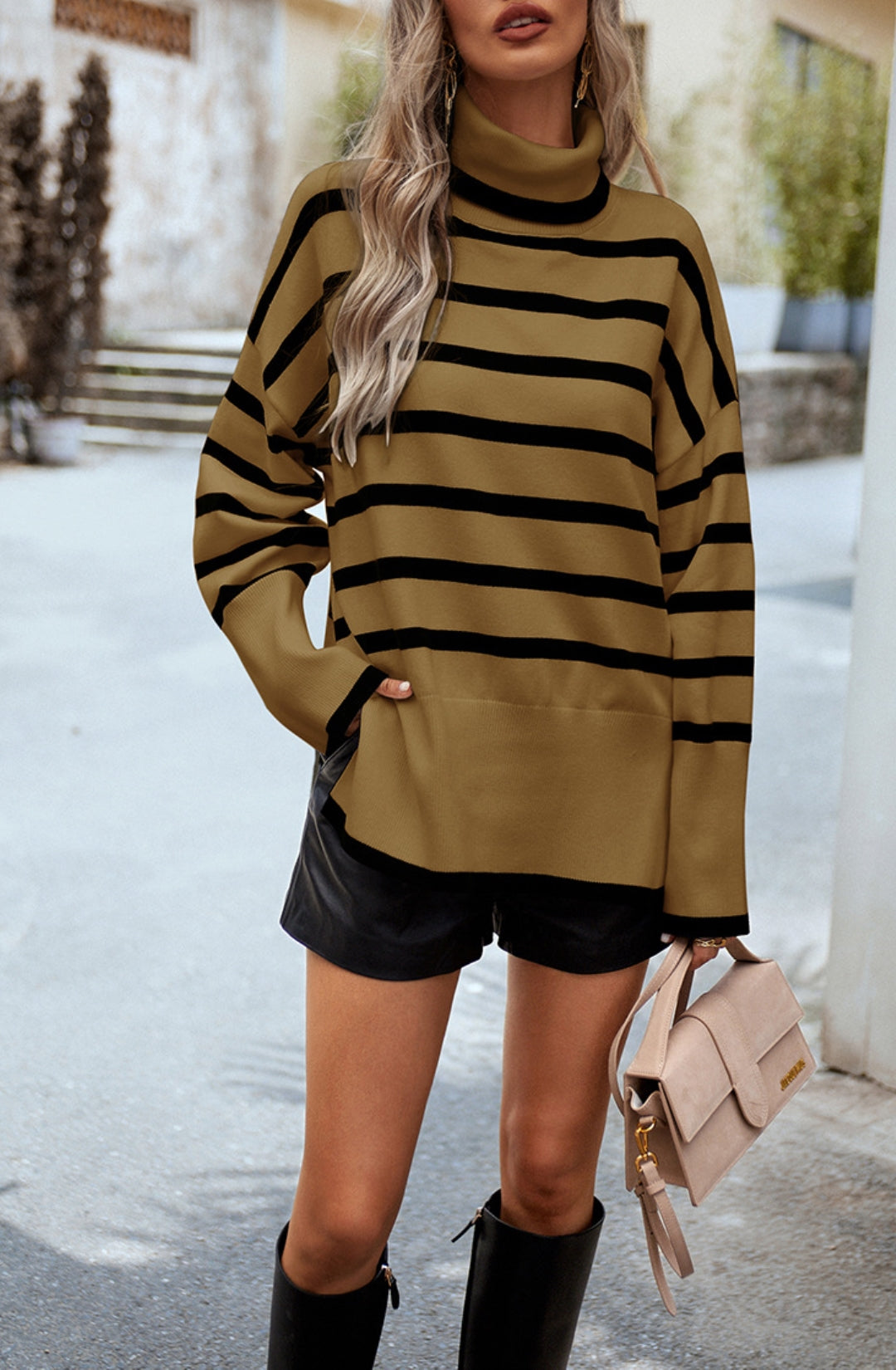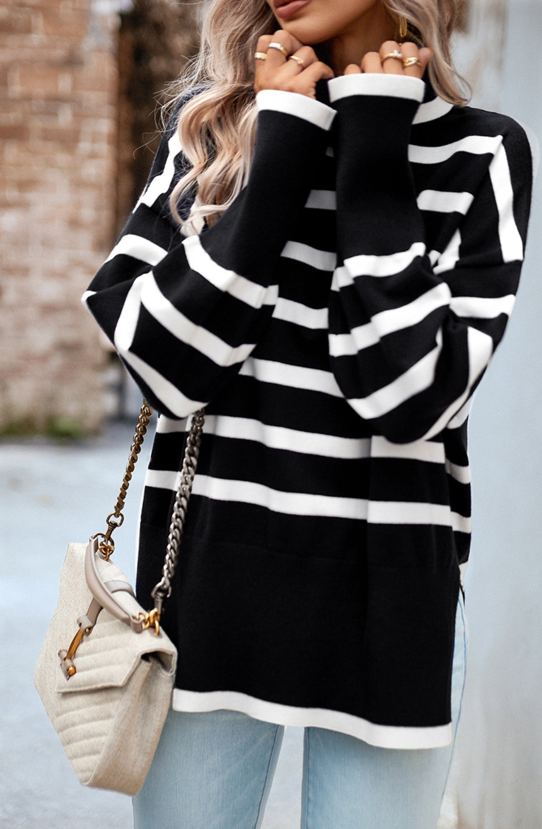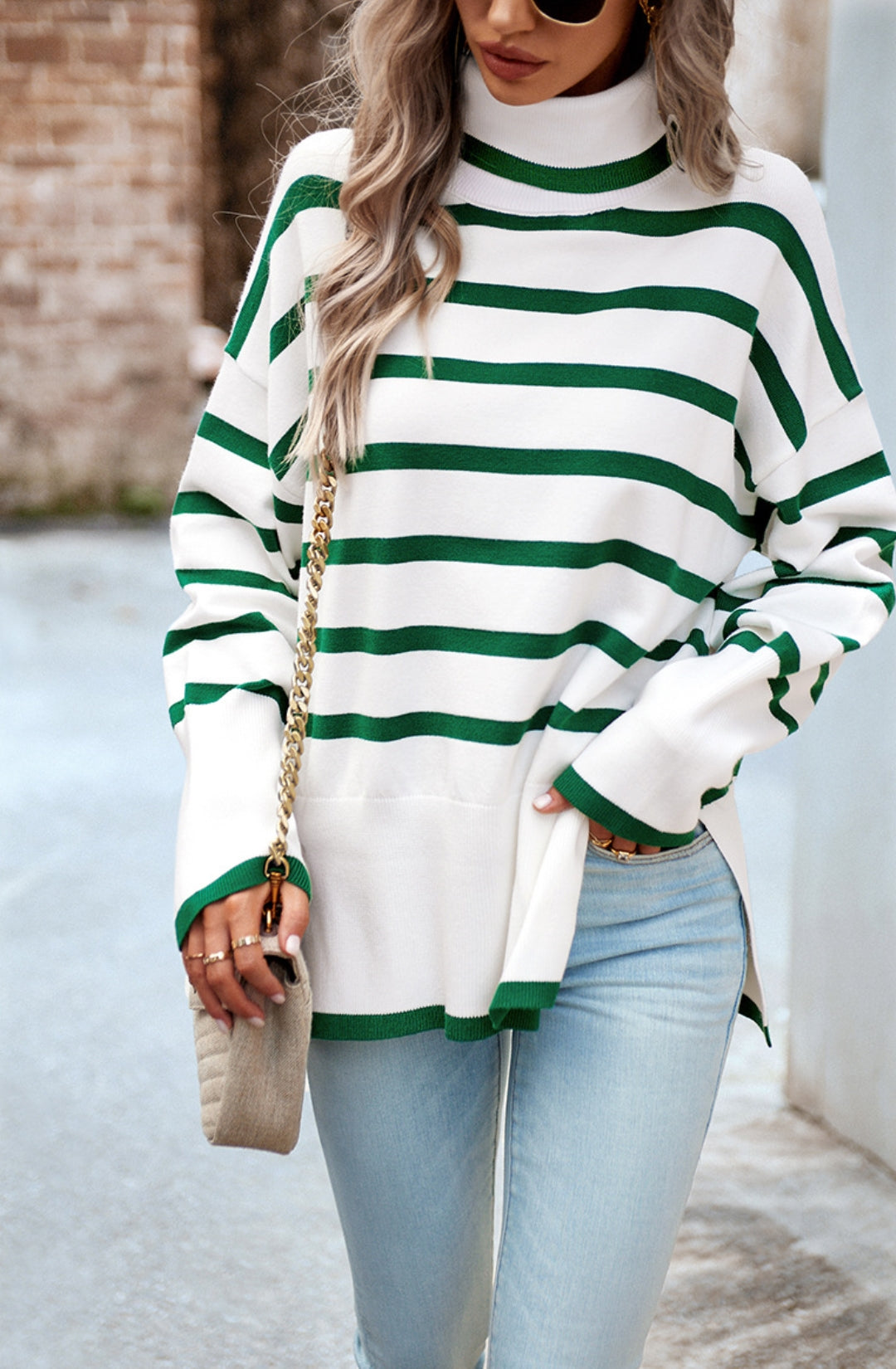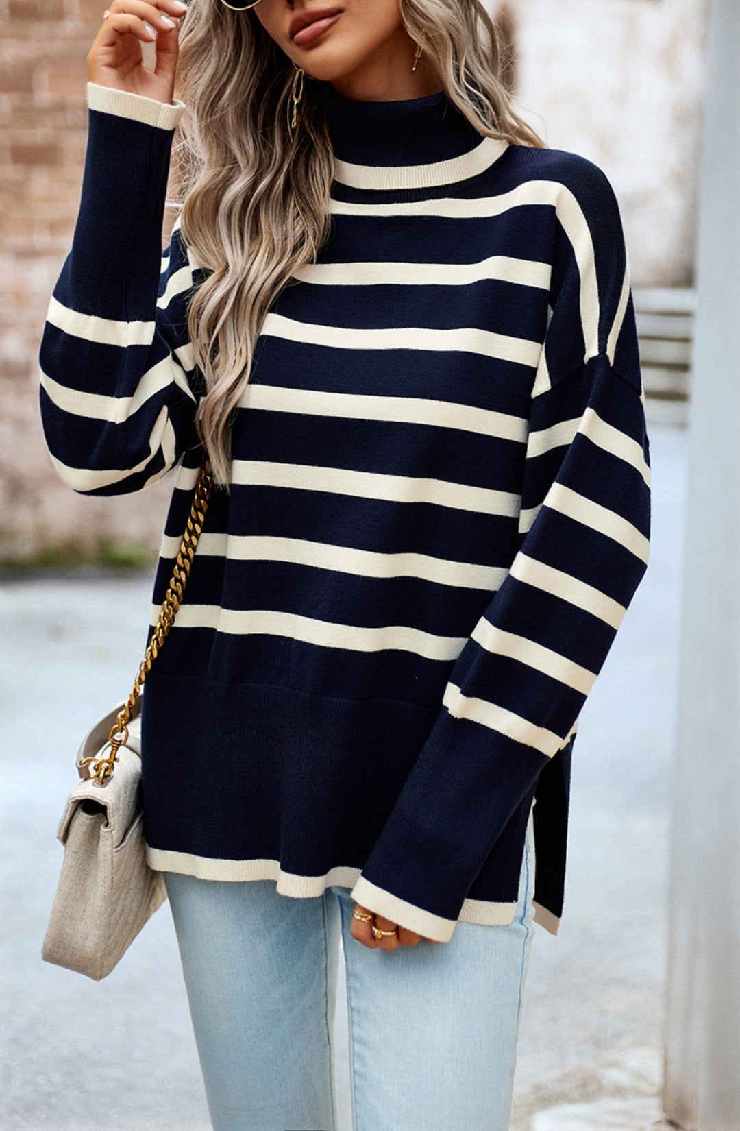 The sweater is detailed with a cool turtleneck. Features a striped pattern, drop shoulder, long sleeves, side slits, and loose fit. Pair it with jeans and sneakers for a cozy look.